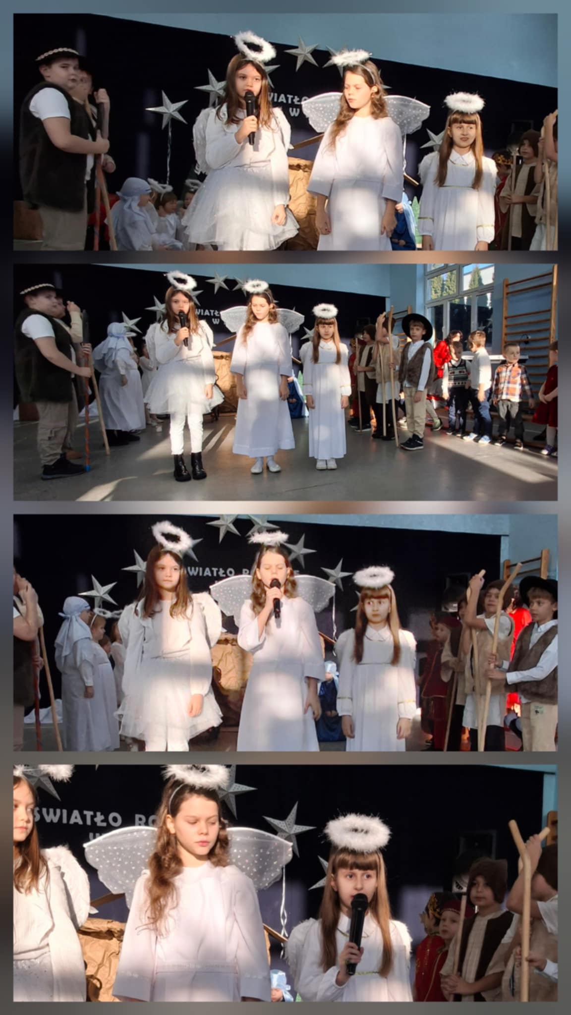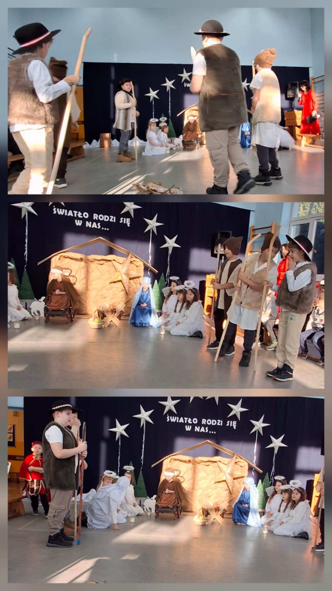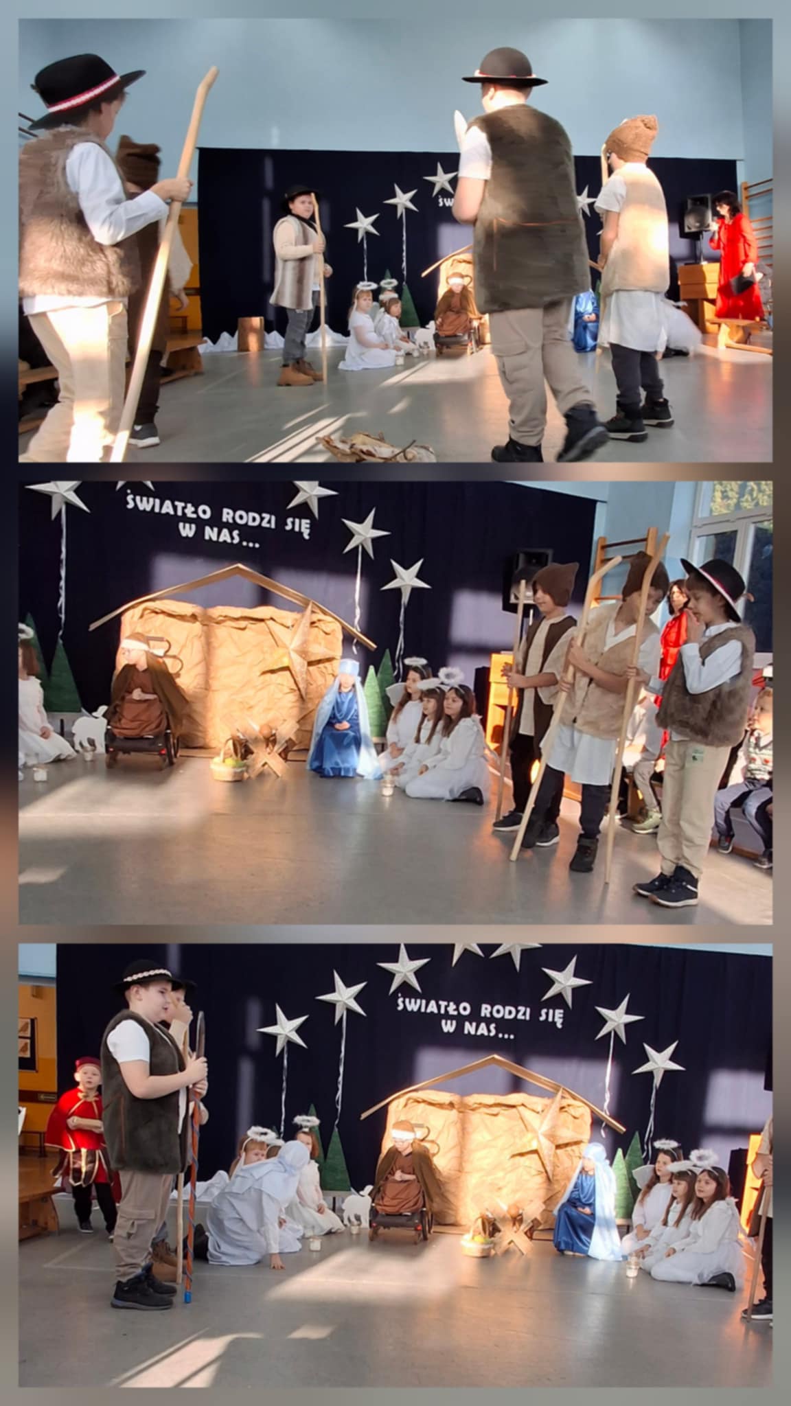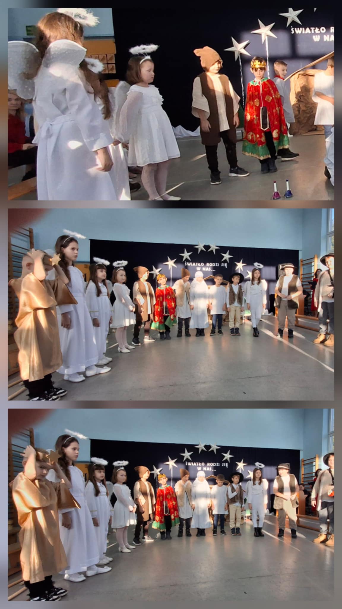 Najmłodsi uczniowie zaprezentowali również montaż słowno-muzyczny pt. „Światło rodzi się w nas”, przygotowany pod kierunkiem Pań: Agnieszki Kołodziejczak, Emilii Napierały oraz Barbary Jarońskiej. Dzieci w piękny sposób przypomniały o duchowym wymiarze Świąt Bożego Narodzenia, wprowadzając widzów w magię Bożego Narodzenia.