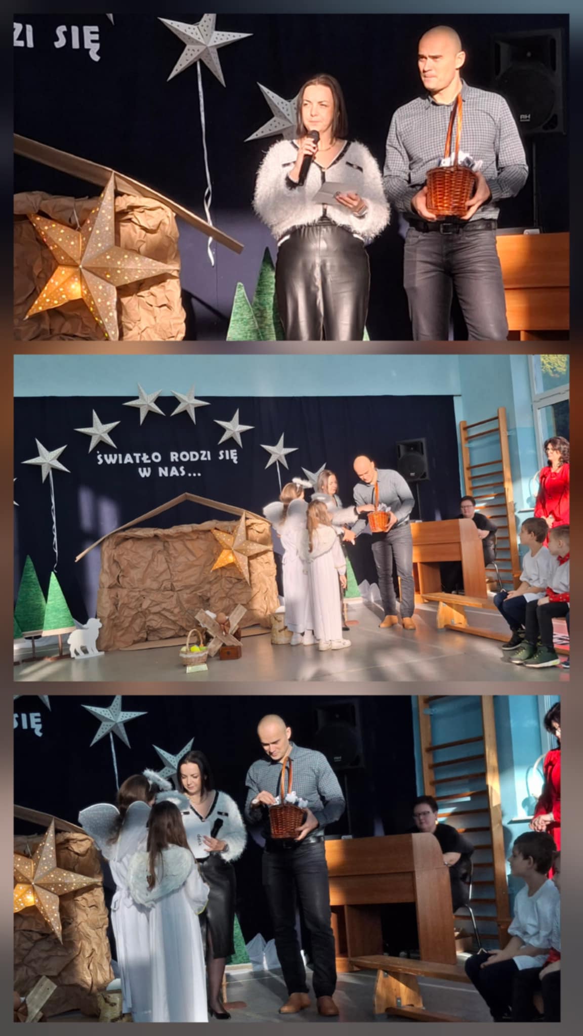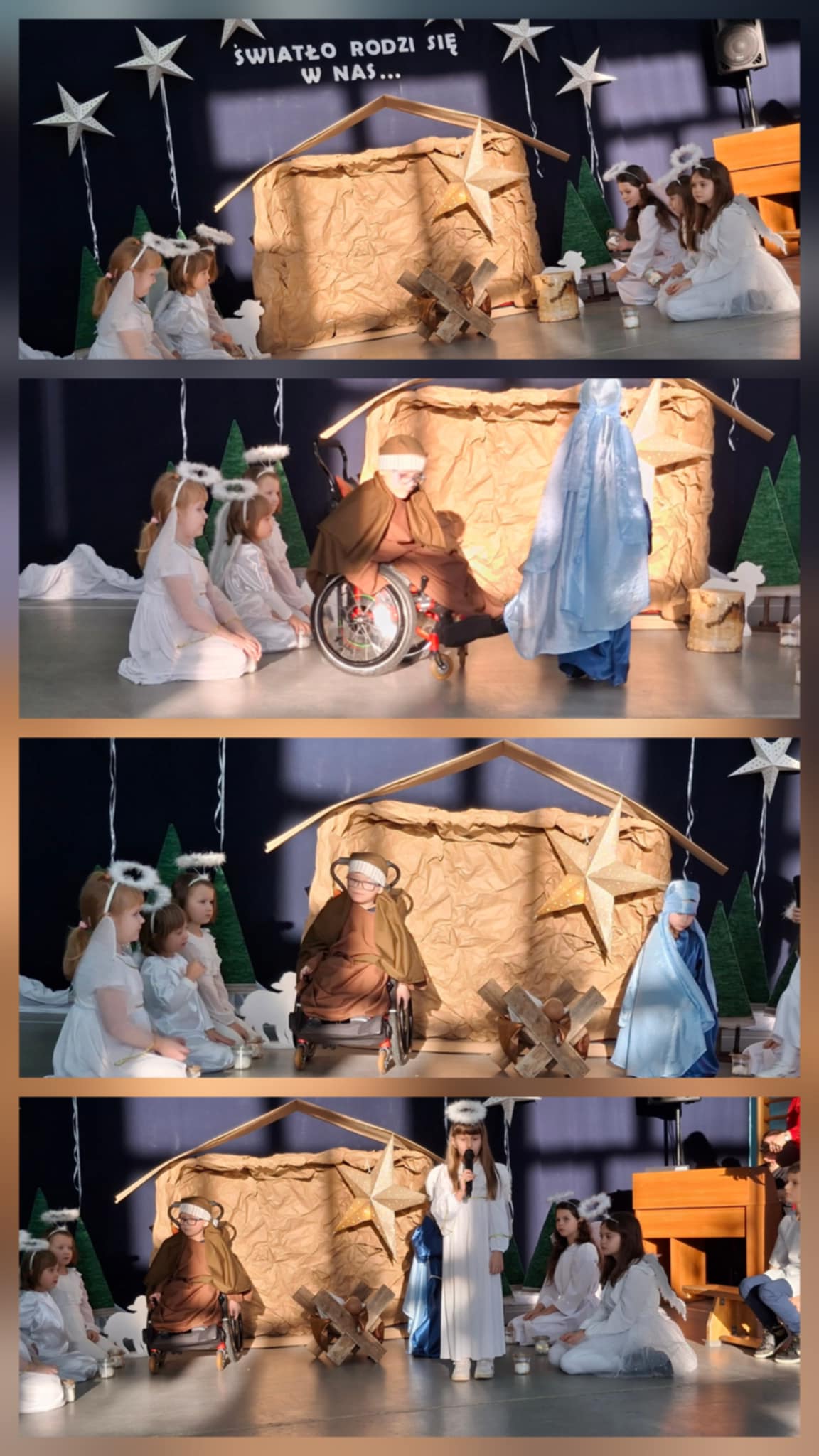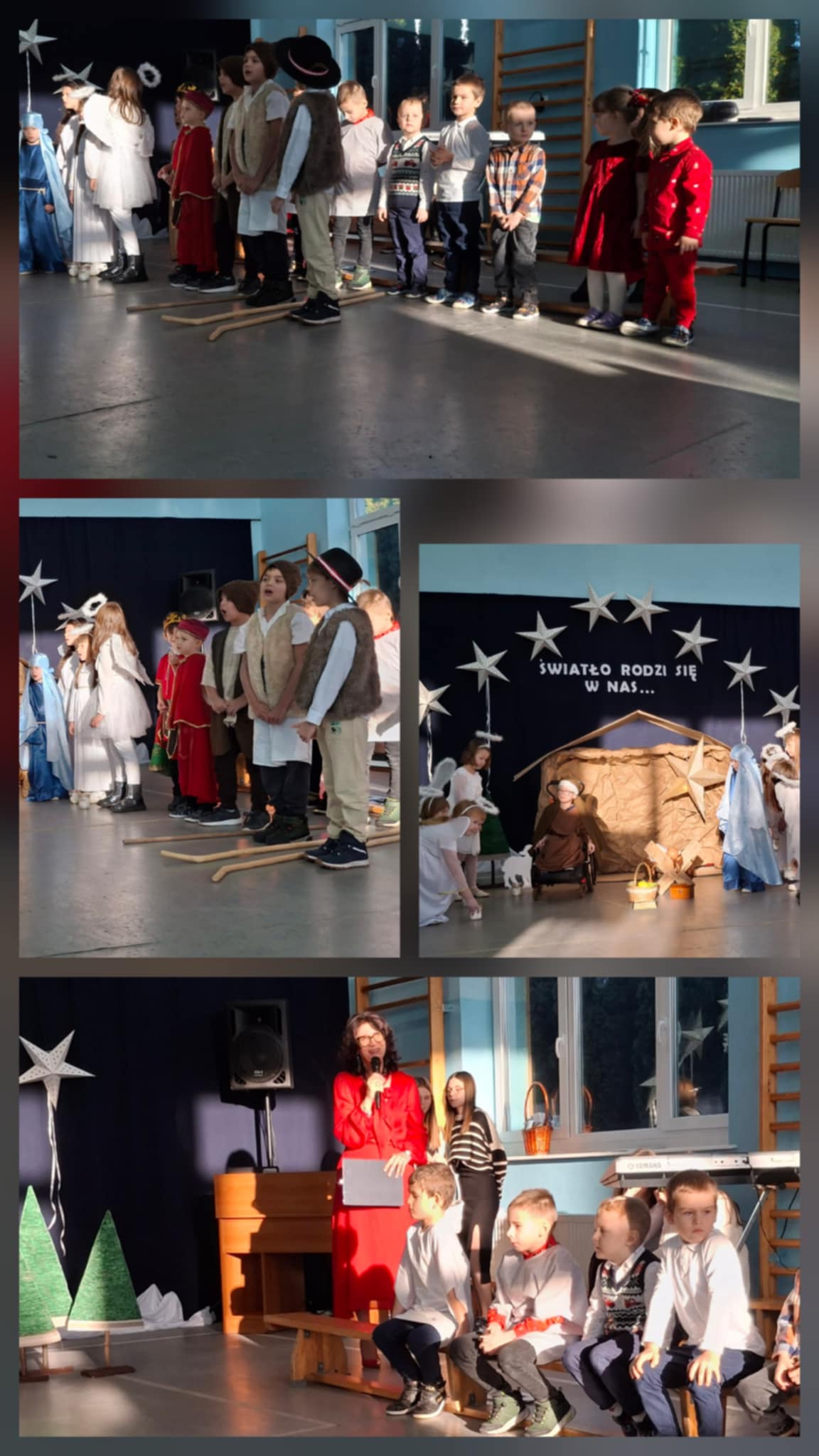 Najmłodsi uczniowie zaprezentowali również montaż słowno-muzyczny pt. „Światło rodzi się w nas”, przygotowany pod kierunkiem Pań: Agnieszki Kołodziejczak, Emilii Napierały oraz Barbary Jarońskiej. Dzieci w piękny sposób przypomniały o duchowym wymiarze Świąt Bożego Narodzenia, wprowadzając widzów w magię Bożego Narodzenia.