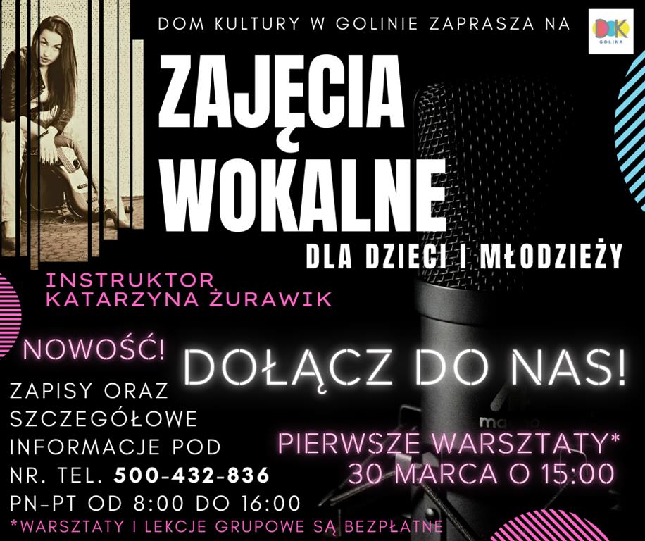 Dom Kultury w Golinie zaprasza dzieci i młodzież na warsztaty oraz lekcje indywidualne zajęć wokalnych, które poprowadzi Katarzyna Żurawik – niezwykle utalentowana i doświadczona wokalistka!