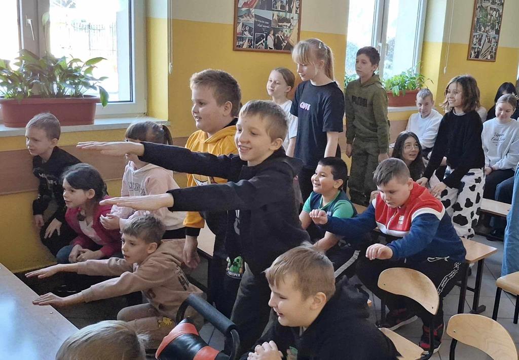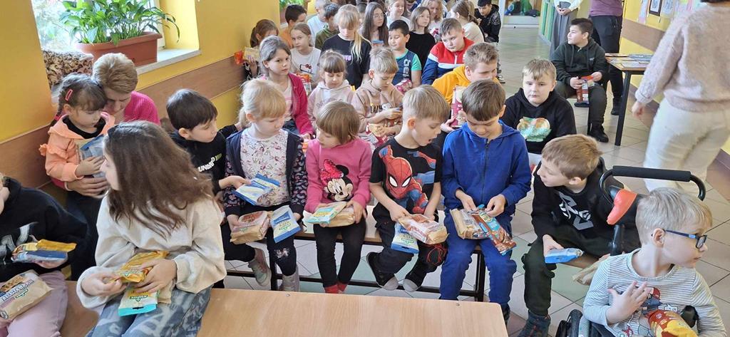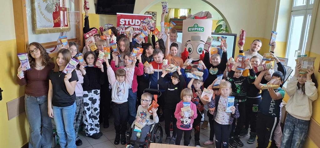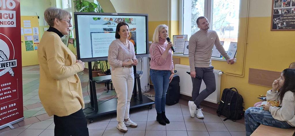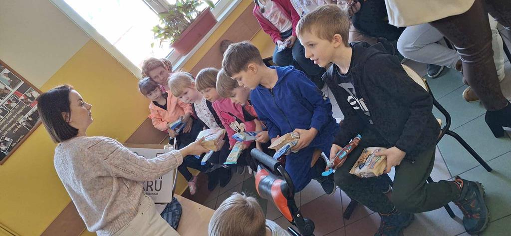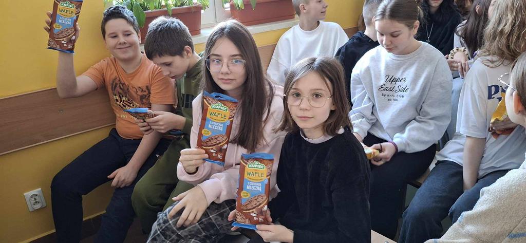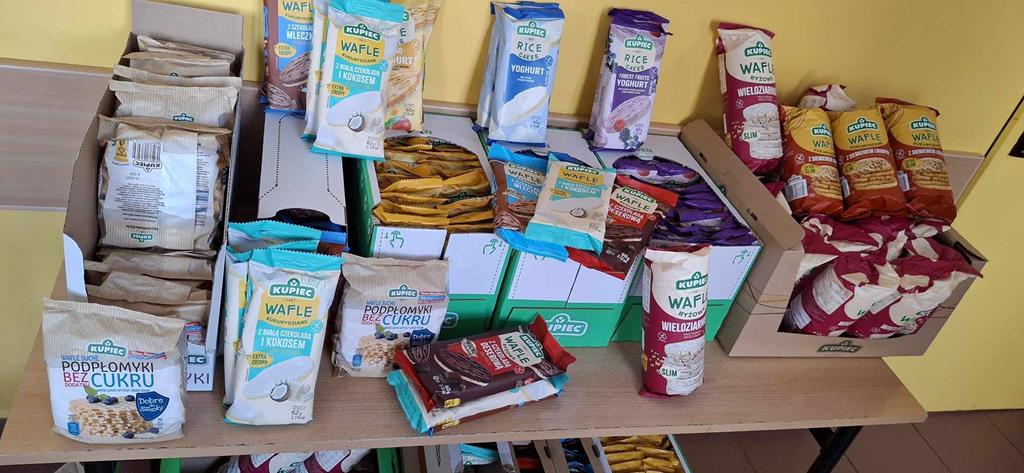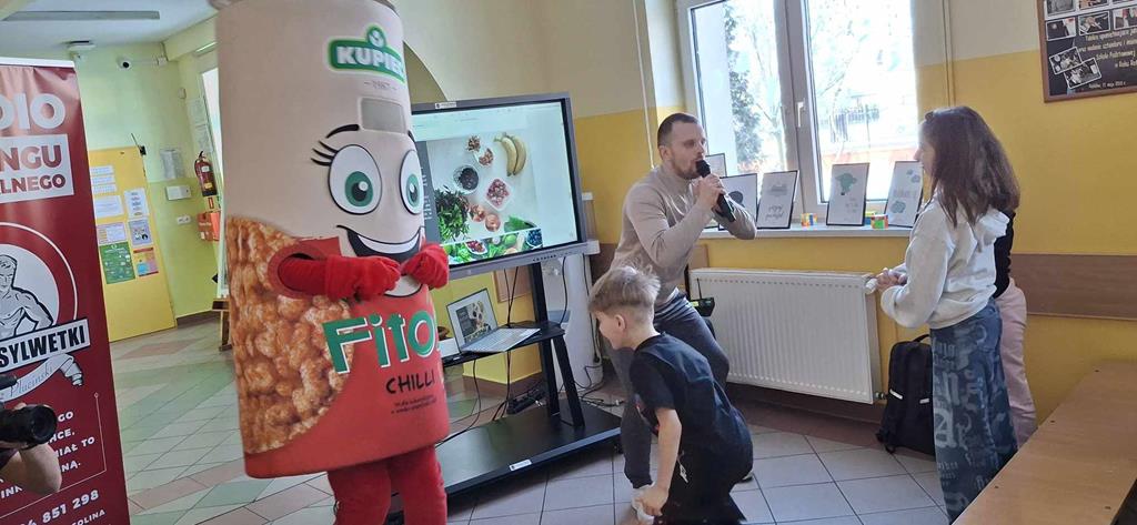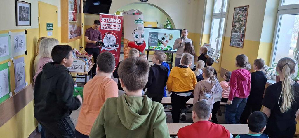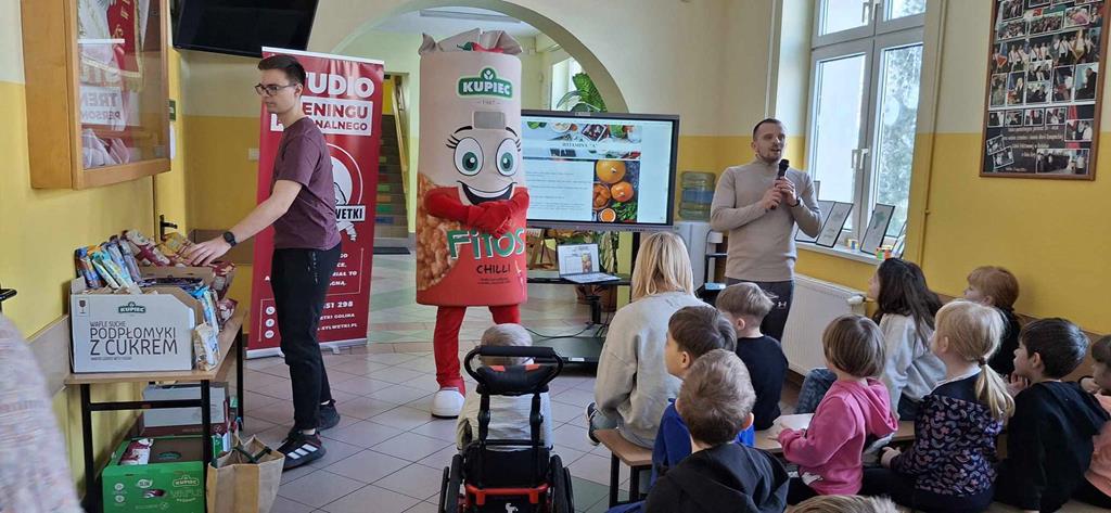 Uczniowie chętnie uczestniczyli w spotkaniu, zadawali mnóstwo interesujących pytań. Cała społeczność szkolna wzięła udział w krótkiej aktywności fizycznej prowadzonej przez pana Bartosza. Były też zabawy z maskotką Waflem, a na koniec spotkania każdy otrzymał małą przekąskę z firmy „Kupiec”.