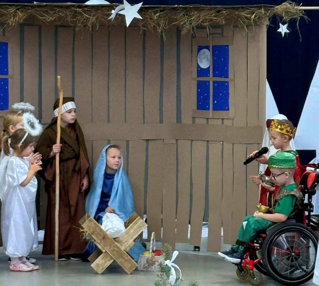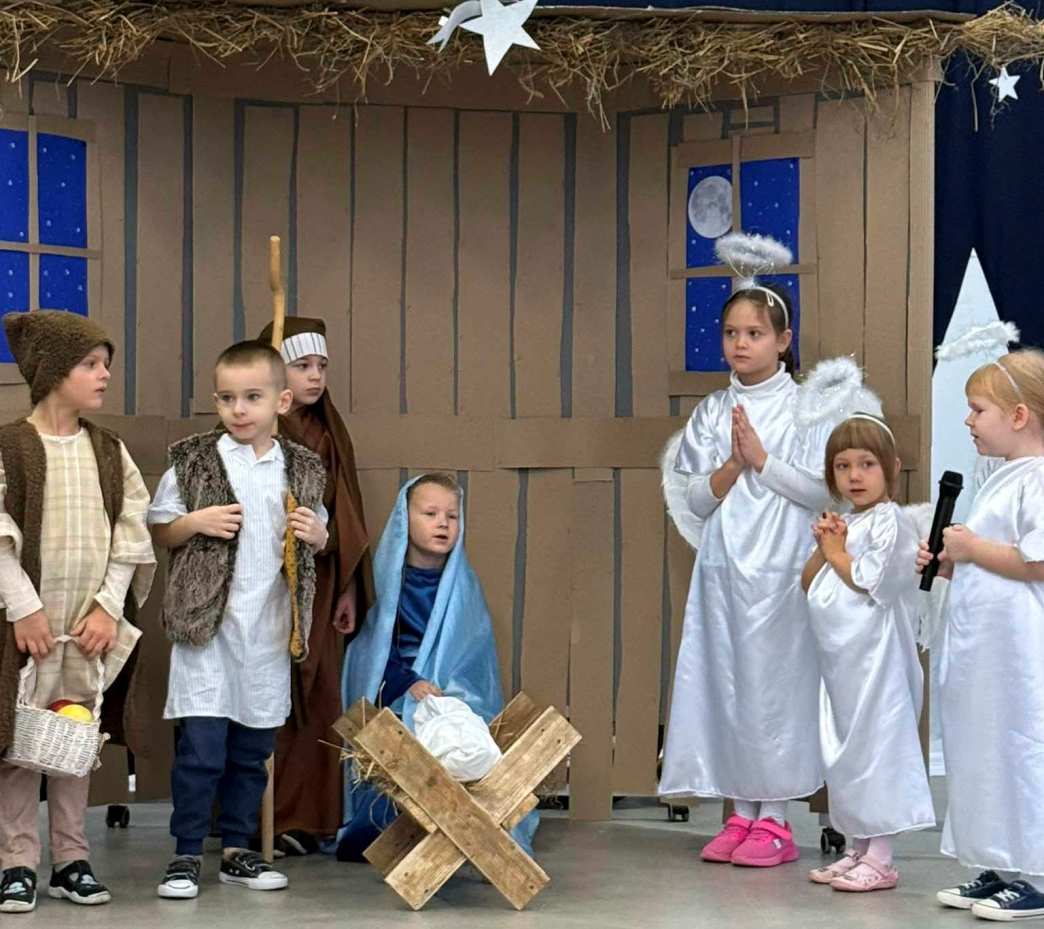Chcąc wprowadzić wszystkich w przedświąteczny nastrój przygotowaliśmy program artystyczny. Świąteczną akademię rozpoczęli uczestnicy koła muzycznego przygotowane przez Panią Agnieszkę Waliniak. W ich wykonaniu usłyszeliśmy wesołą pastorałkę pod tytułem „Podniebna rozmowa”. Po nich najmłodsi uczniowie naszej szkoły: przedszkole, klasa O oraz pierwszoklasiści zaprezentowali Jasełka, dzięki którym przypomnieliśmy sobie historię narodzin Pana Jezusa. Dzieci zostały przygotowane przez Panią Agnieszkę Kołodziejczak, Emilię Napierałę i Barbarę Jarońską. Na zakończenie programu artystycznego usłyszeliśmy instrumentalną wersję kolędy „ Gdy śliczna Panna ” w wykonaniu Nadii Kasprzyk.