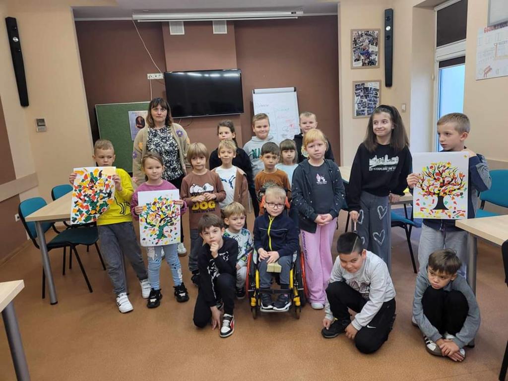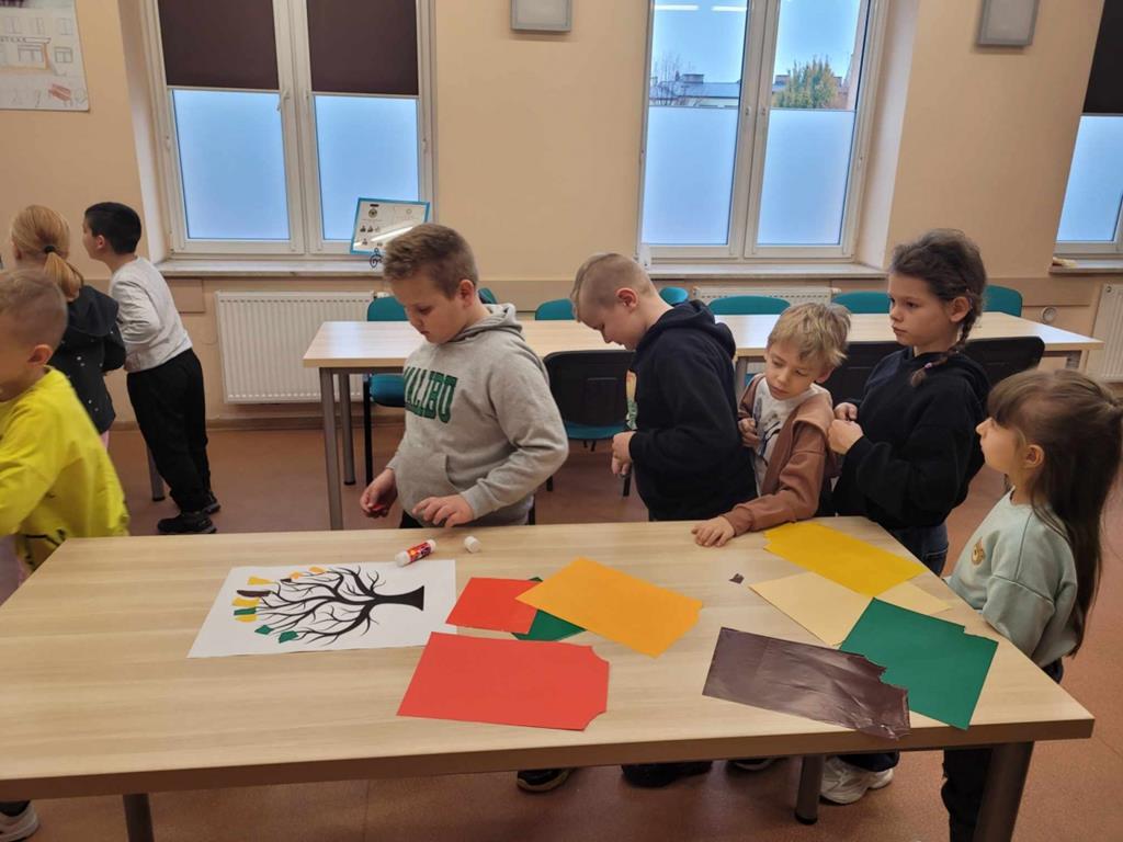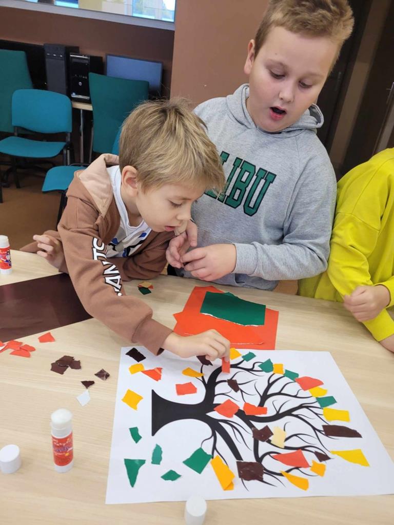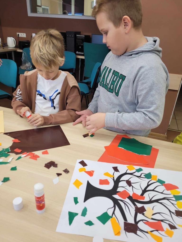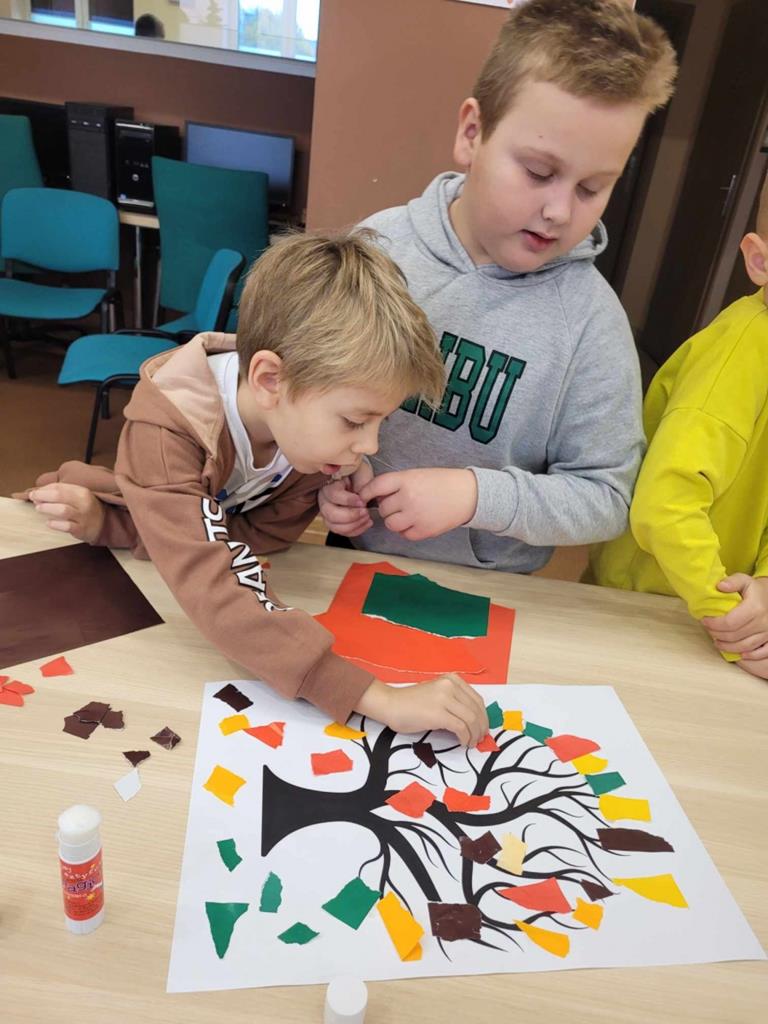 W danej chwili tylko jedno z nich przyklejało kawałek wycinanki. W ten sposób każdy uczeń miał swój wkład w powstanie drzewa Na zakończenie spotkania dzieci narysowały jesienny krajobraz.