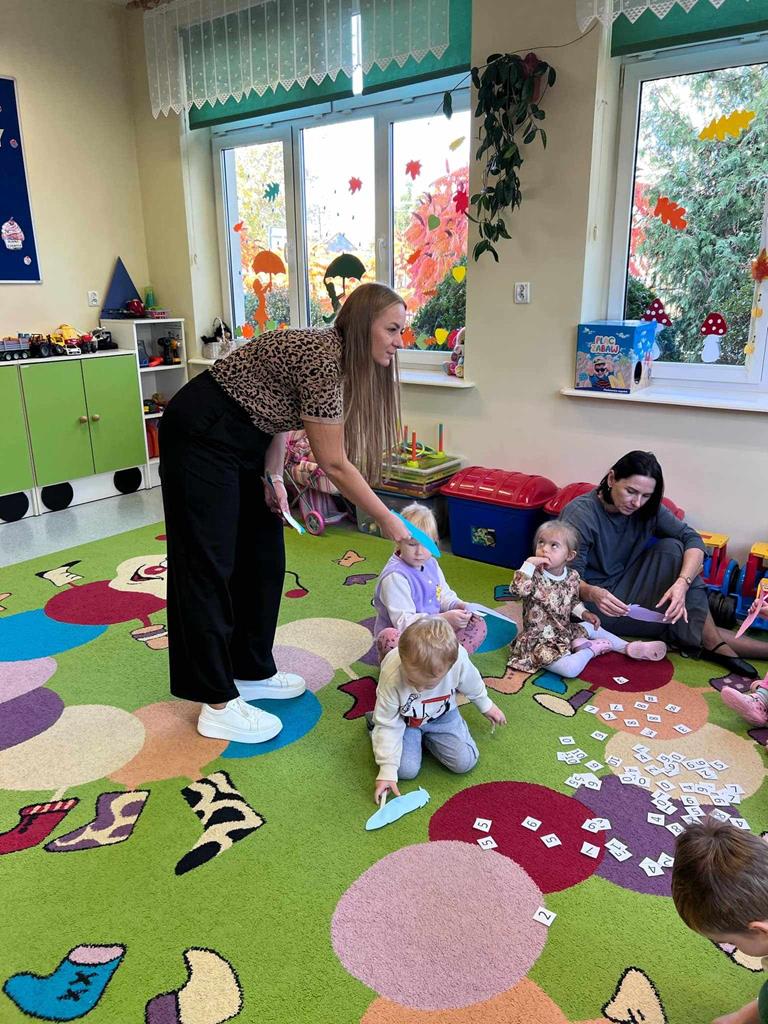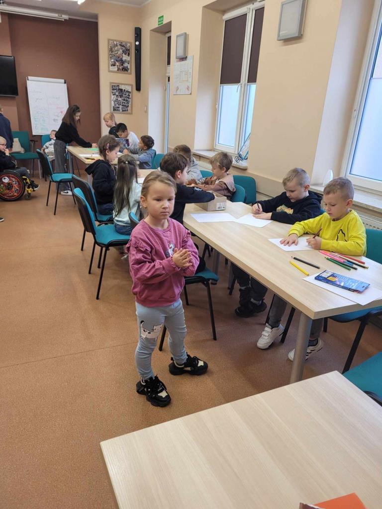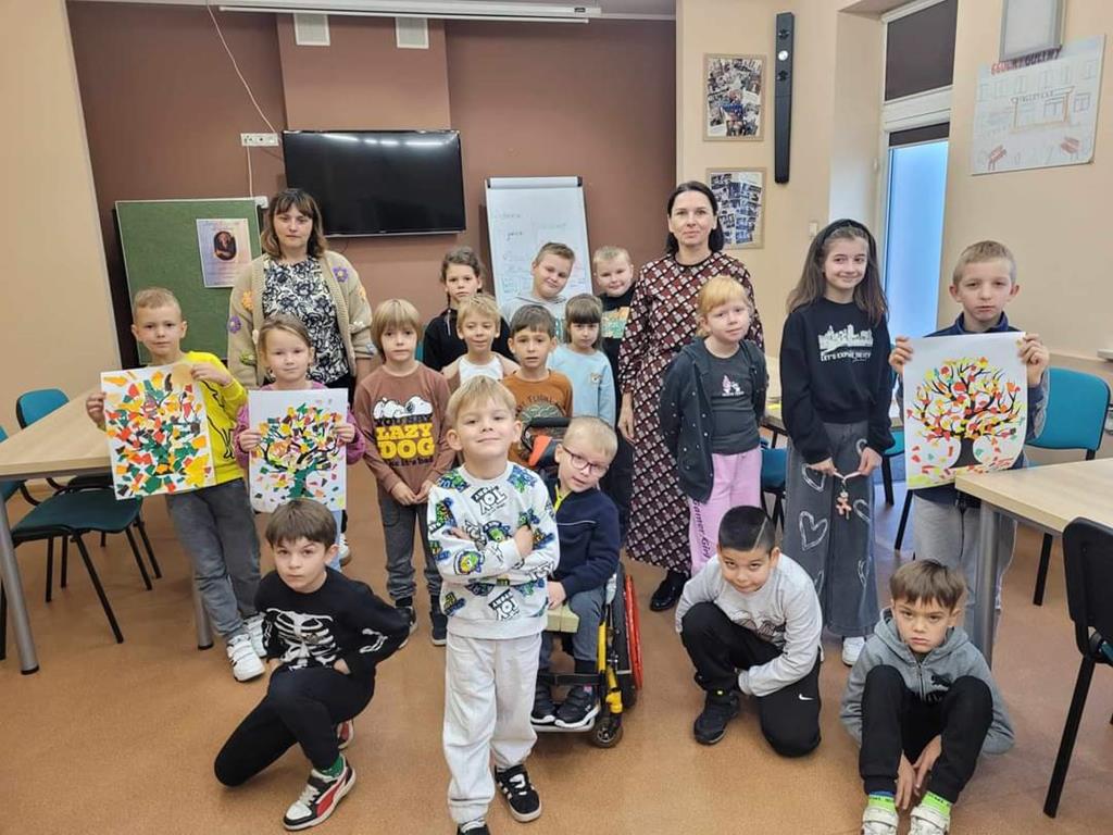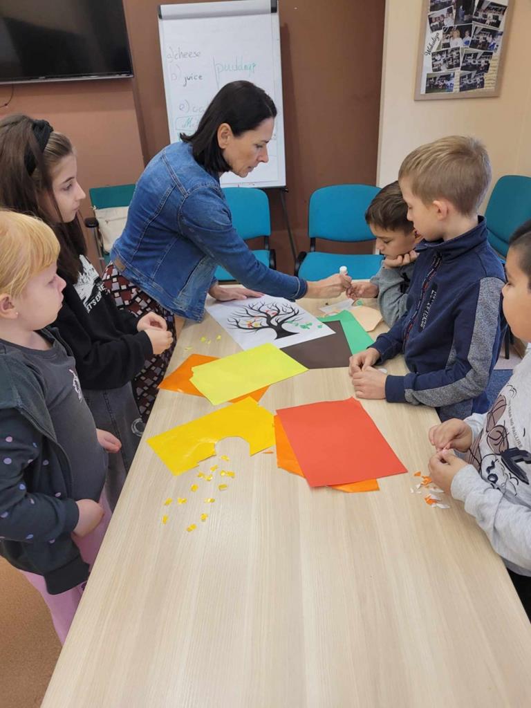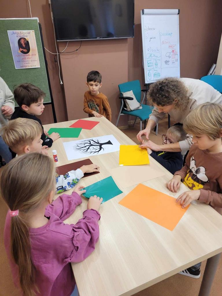 W danej chwili tylko jedno z nich przyklejało kawałek wycinanki. W ten sposób każdy uczeń miał swój wkład w powstanie drzewa Na zakończenie spotkania dzieci narysowały jesienny krajobraz.