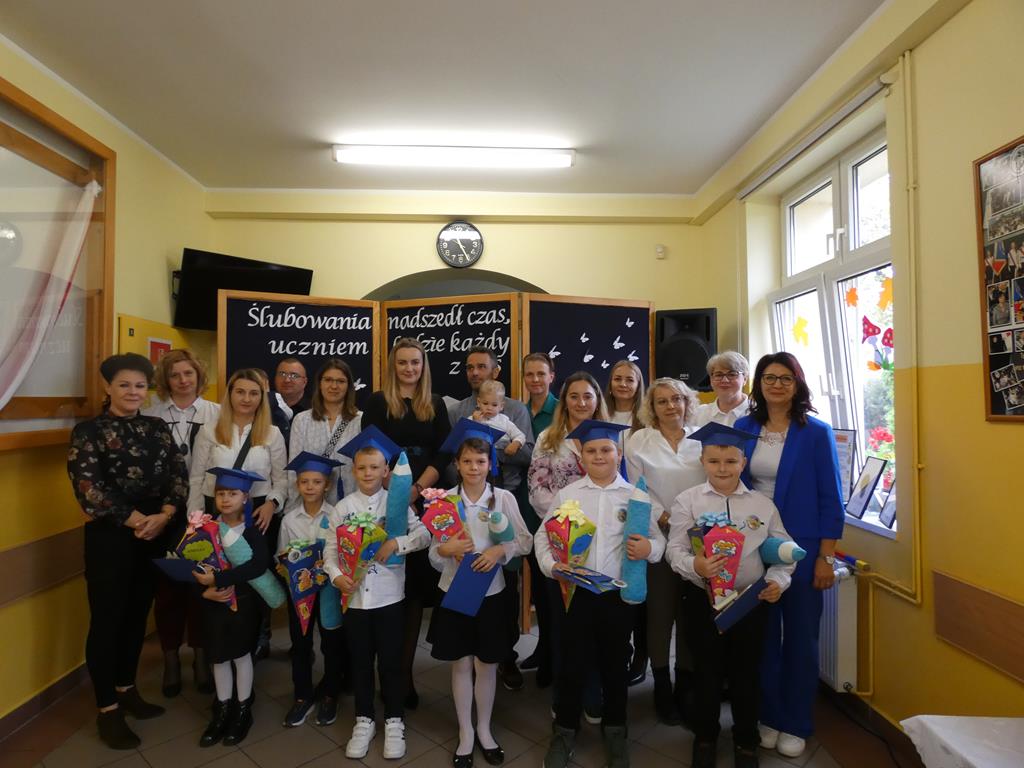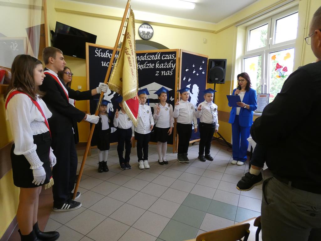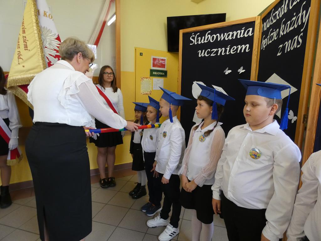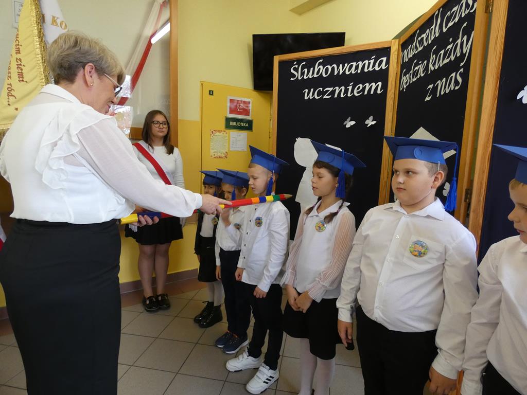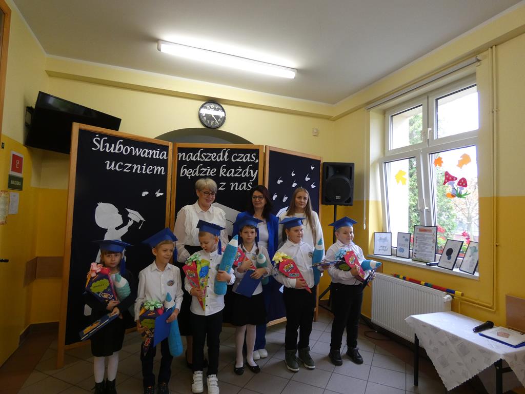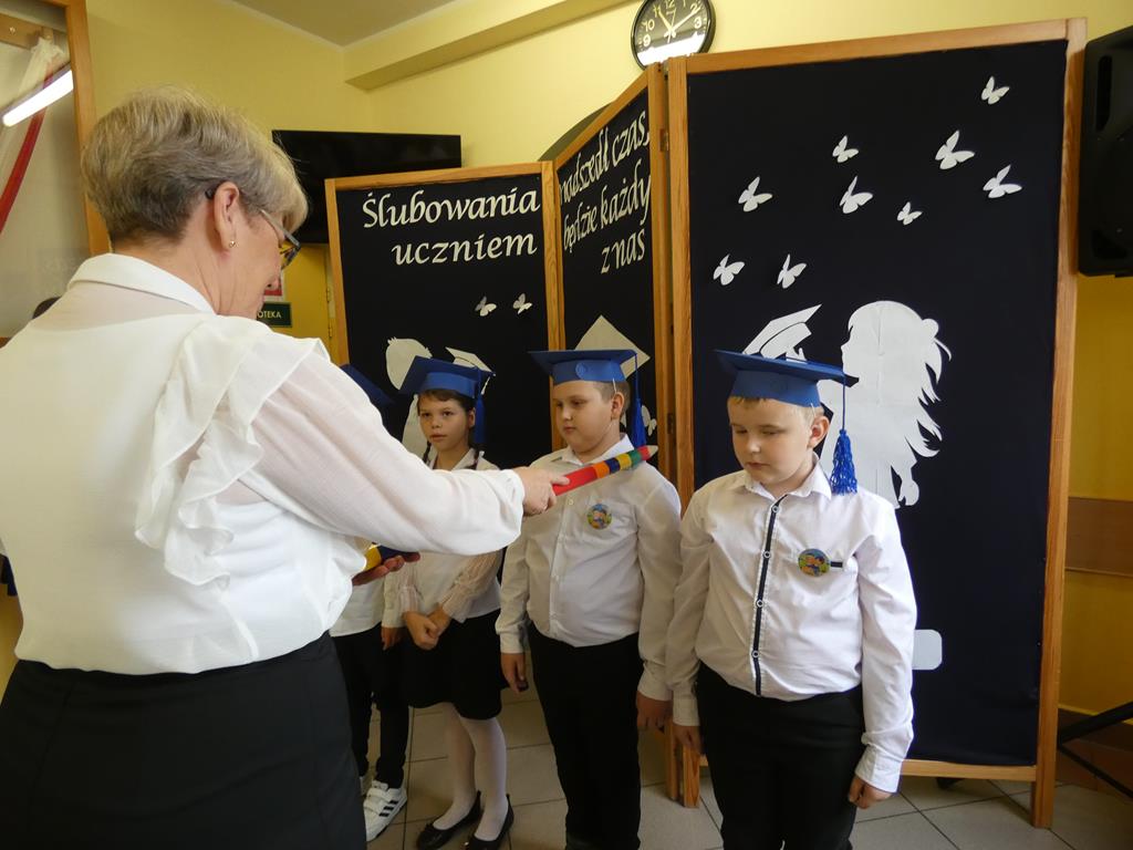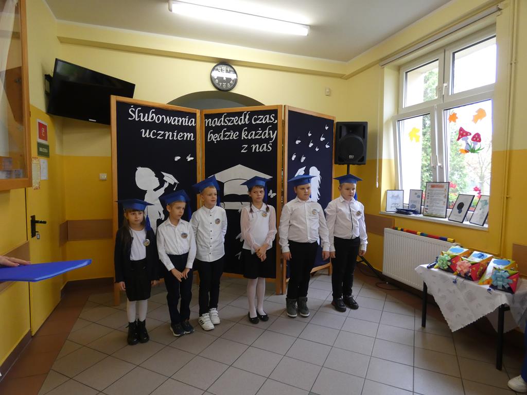 Klasa pierwsza pod okiem swojej wychowawczyni przygotowała na dzień ślubowania część artystyczną, aby zaprezentować swoje umiejętności. Następnie po odśpiewaniu hymnu państwowego nastąpiła część oficjalna uroczystości, podczas której pierwszoklasiści złożyli przysięgę na sztandar szkoły, a Pani Dyrektor dokonała uroczystego pasowania na uczniów SP w Radolinie. Złożyła też życzenia wielu sukcesów w nauce wszystkim uczniom. Następie głos zabrali uczniowie klasy VIII oraz przedstawiciele Rady Rodziców wręczając bohaterom dzisiejszego dnia przygotowane upominki. Po wspólnej fotografii pierwszoklasiści udali się do swojej sali, gdzie rodzice przygotowali słodki poczęstunek.