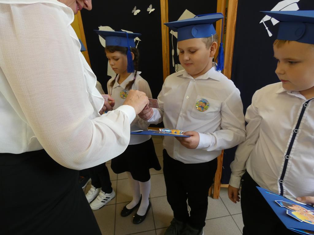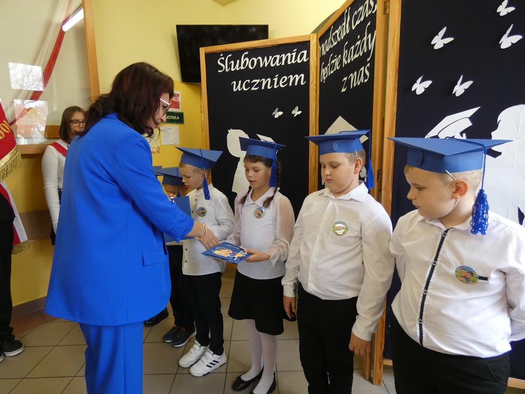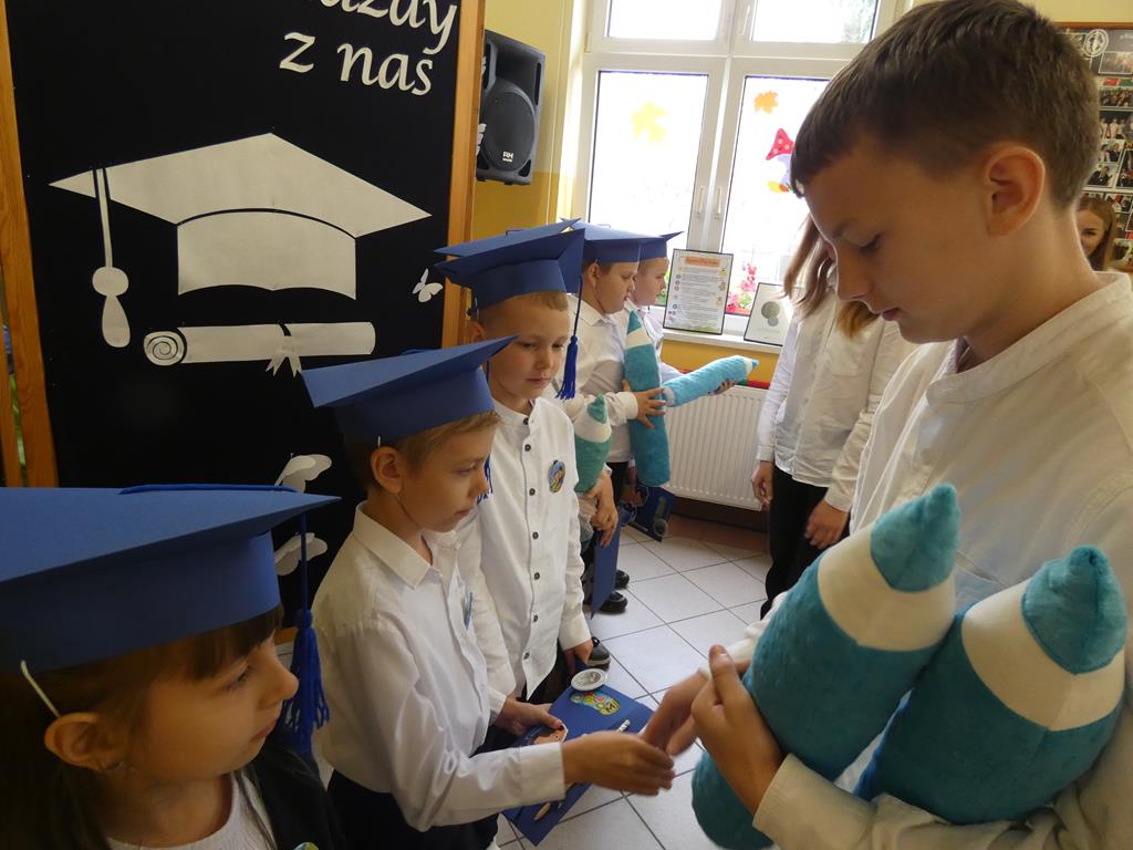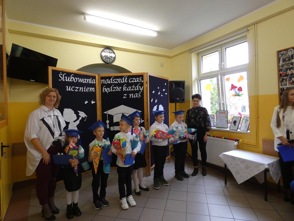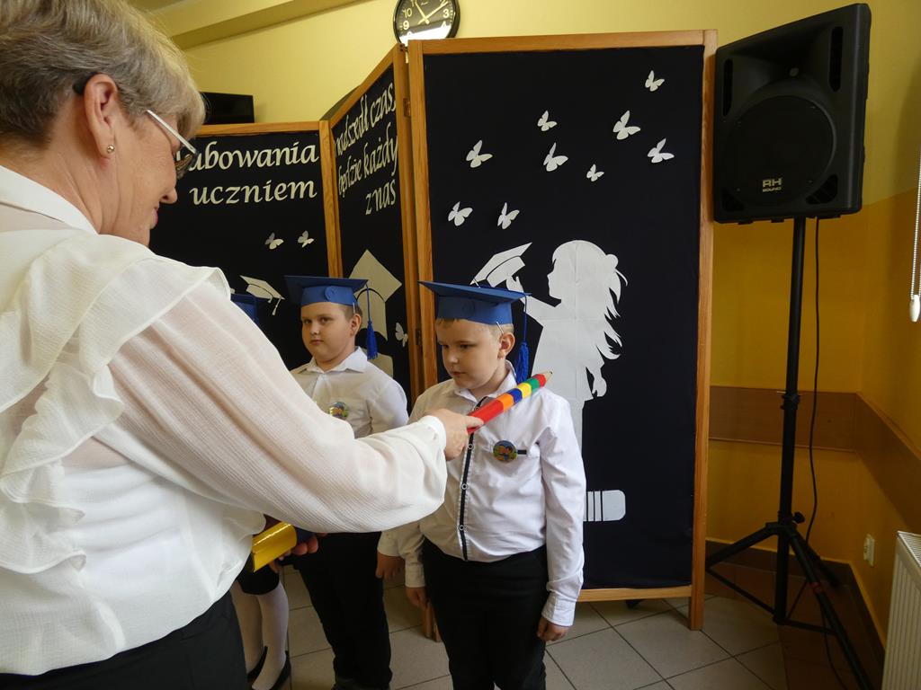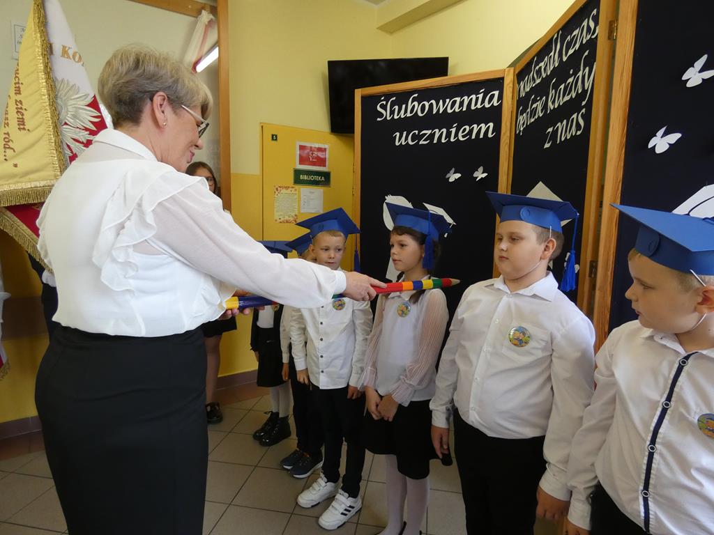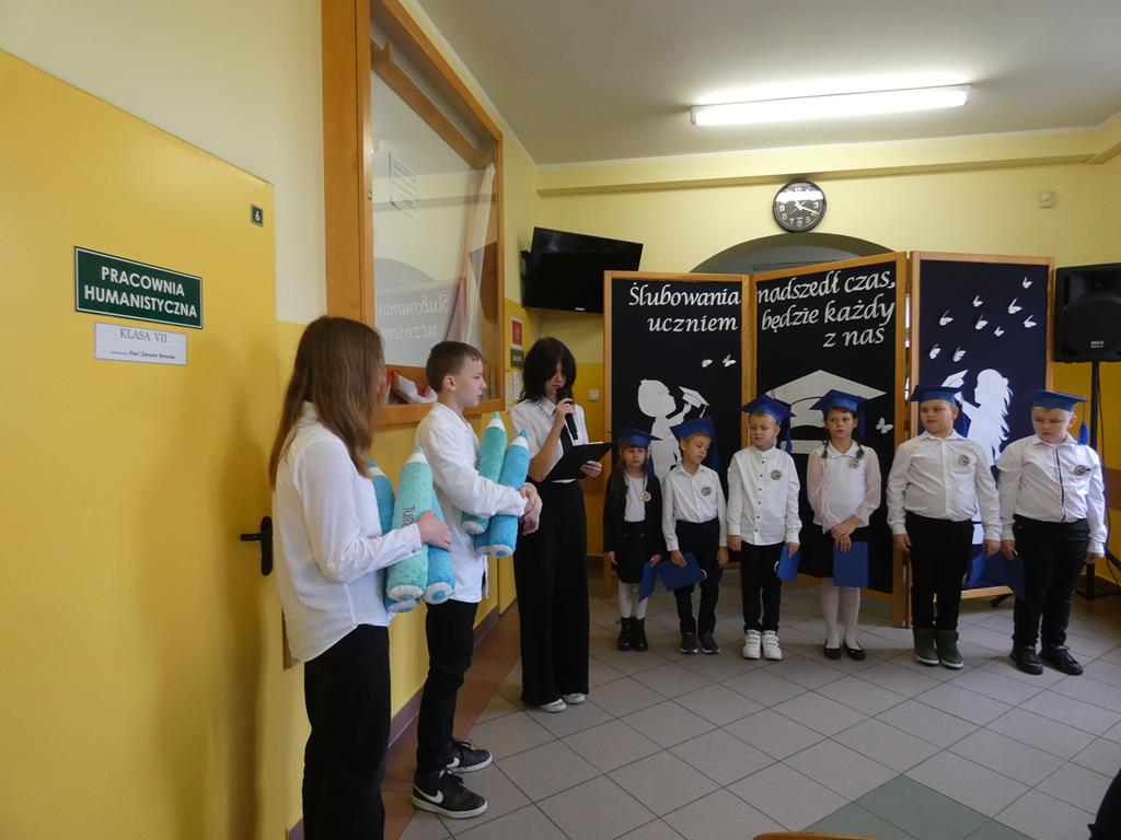Klasa pierwsza pod okiem swojej wychowawczyni przygotowała na dzień ślubowania część artystyczną, aby zaprezentować swoje umiejętności. Następnie po odśpiewaniu hymnu państwowego nastąpiła część oficjalna uroczystości, podczas której pierwszoklasiści złożyli przysięgę na sztandar szkoły, a Pani Dyrektor dokonała uroczystego pasowania na uczniów SP w Radolinie. Złożyła też życzenia wielu sukcesów w nauce wszystkim uczniom. Następie głos zabrali uczniowie klasy VIII oraz przedstawiciele Rady Rodziców wręczając bohaterom dzisiejszego dnia przygotowane upominki. Po wspólnej fotografii pierwszoklasiści udali się do swojej sali, gdzie rodzice przygotowali słodki poczęstunek.