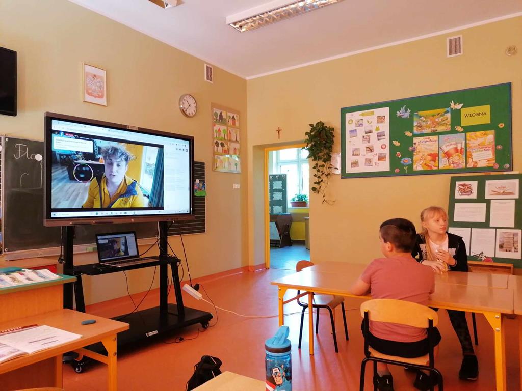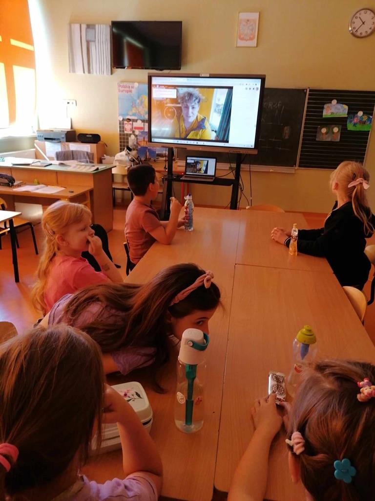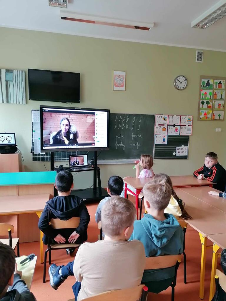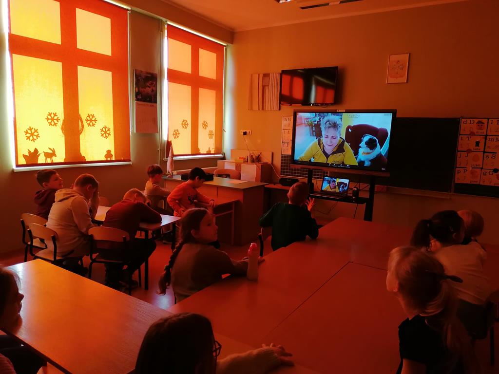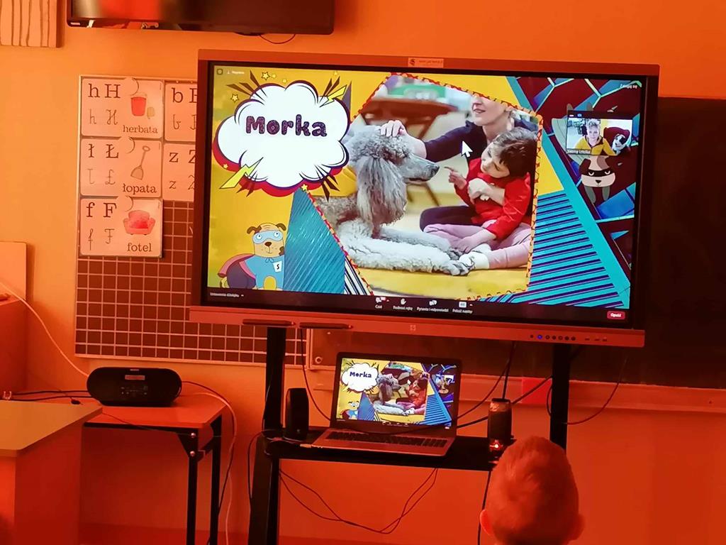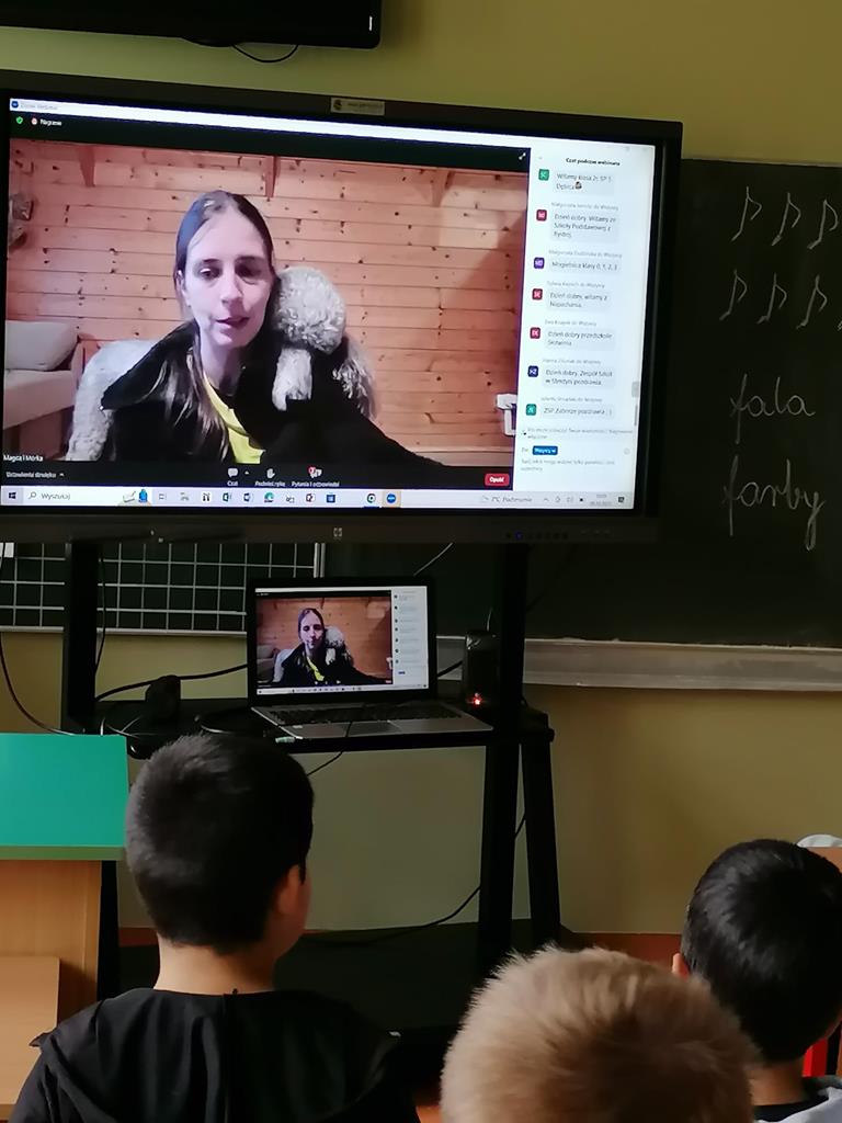 Spotykaliśmy się online i uczestniczyliśmy w bardzo ciekawych spotkaniach. Mogliśmy poznać psy, które chodzą na wizyty do szpitali , aby dzieci tam przebywające zapomniały o chorobie. Poznaliśmy Mordkę i Hultaja , którzy jak przystało na szkolone psy potrafią wykonywać polecenie swojego właściciele , wykonują różne sztuczki.
