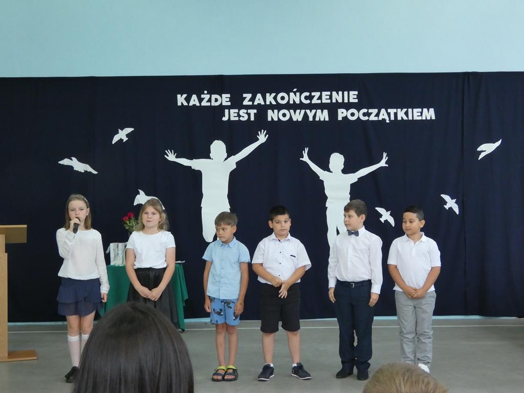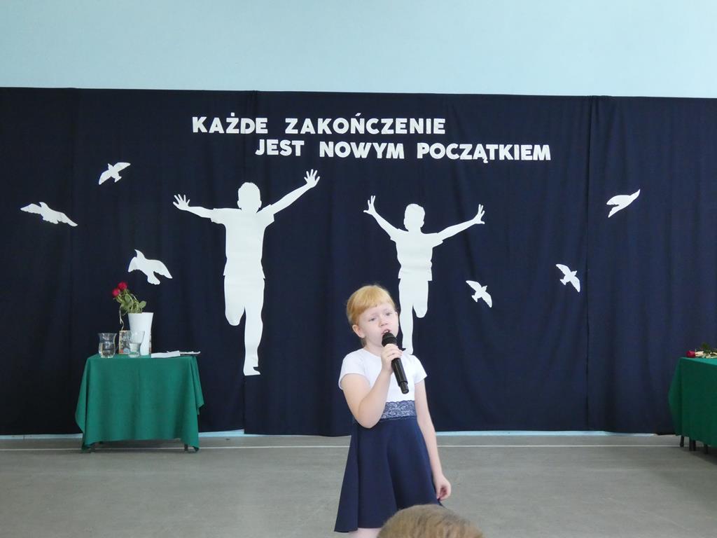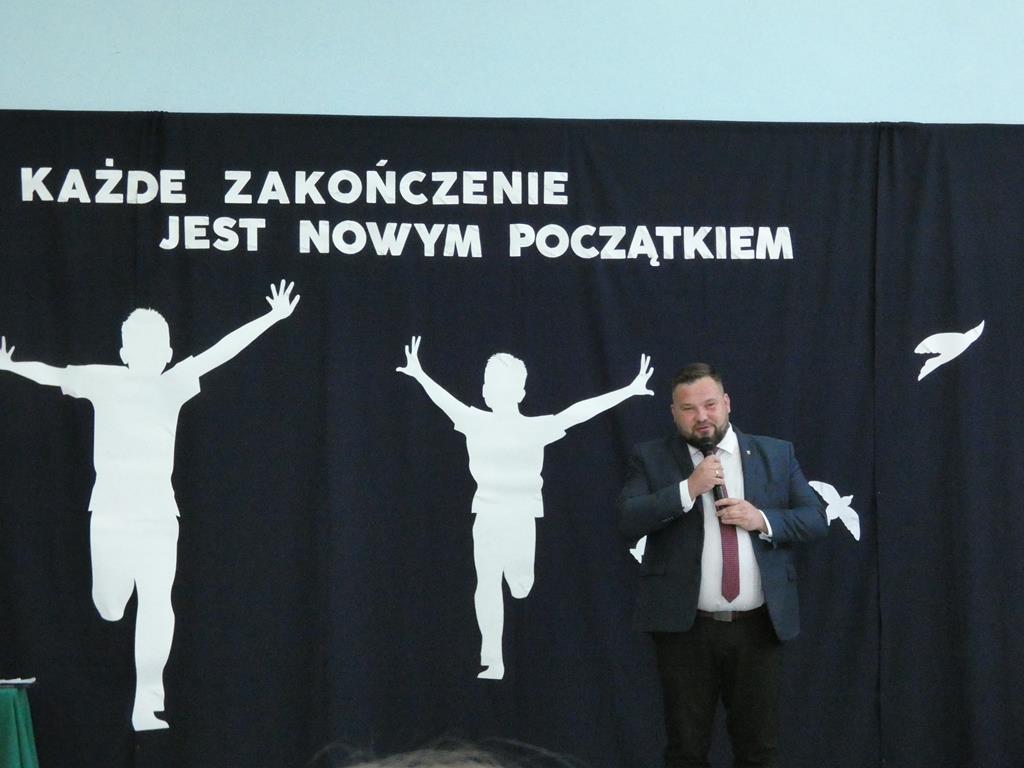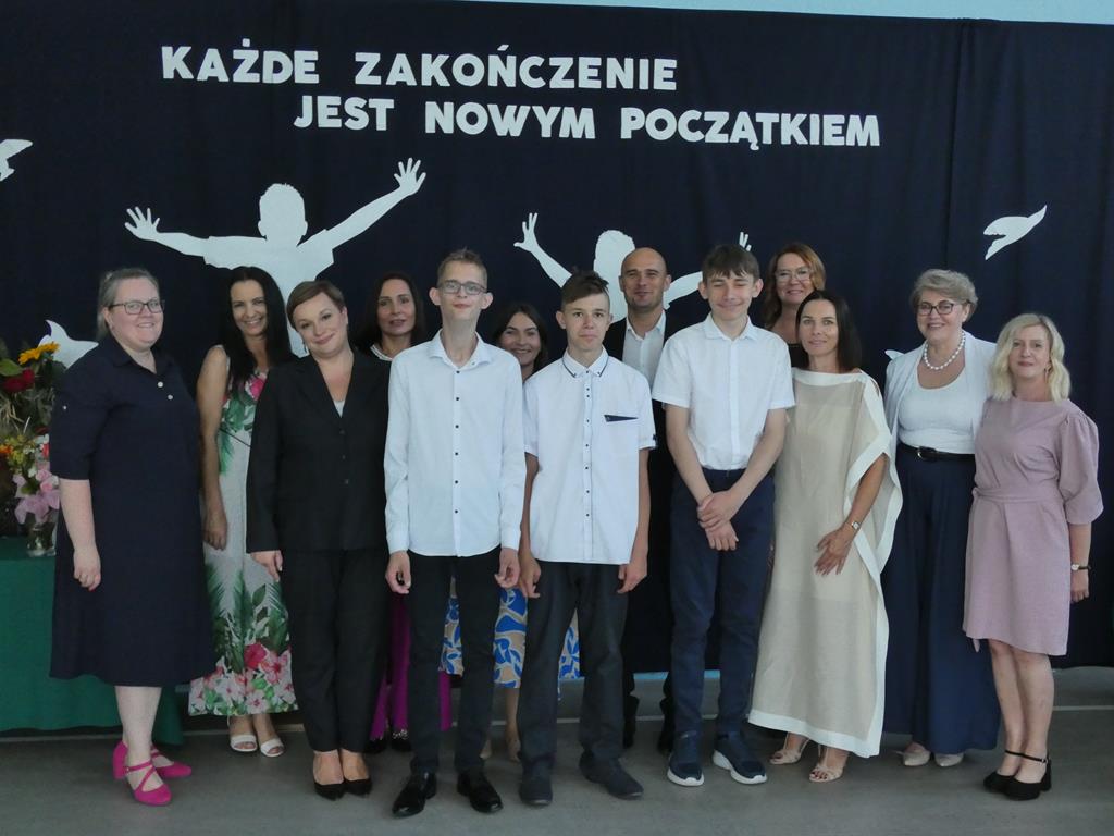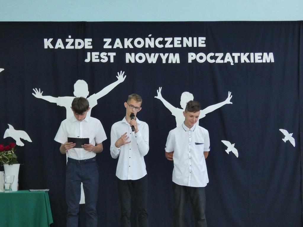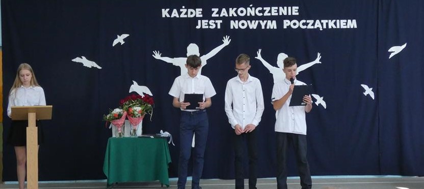 „Każde zakończenie jest nowym początkiem”, tym hasłem uczniowie klasy ósmej pożegnali się ze szkołą. Klasa ósma podziękowała symbolicznym kwiatkiem dyrektorowi szkoły, nauczycielom, pracownikom obsługi i administracji oraz zaproszonym gościom. Nie zabrakło wzruszeń i ciepłych słów dla absolwentów. Uczniowie klasy ósmej wręczyli na ręce pani dyrektor tablo, które zawisło na korytarzu szkolnym.