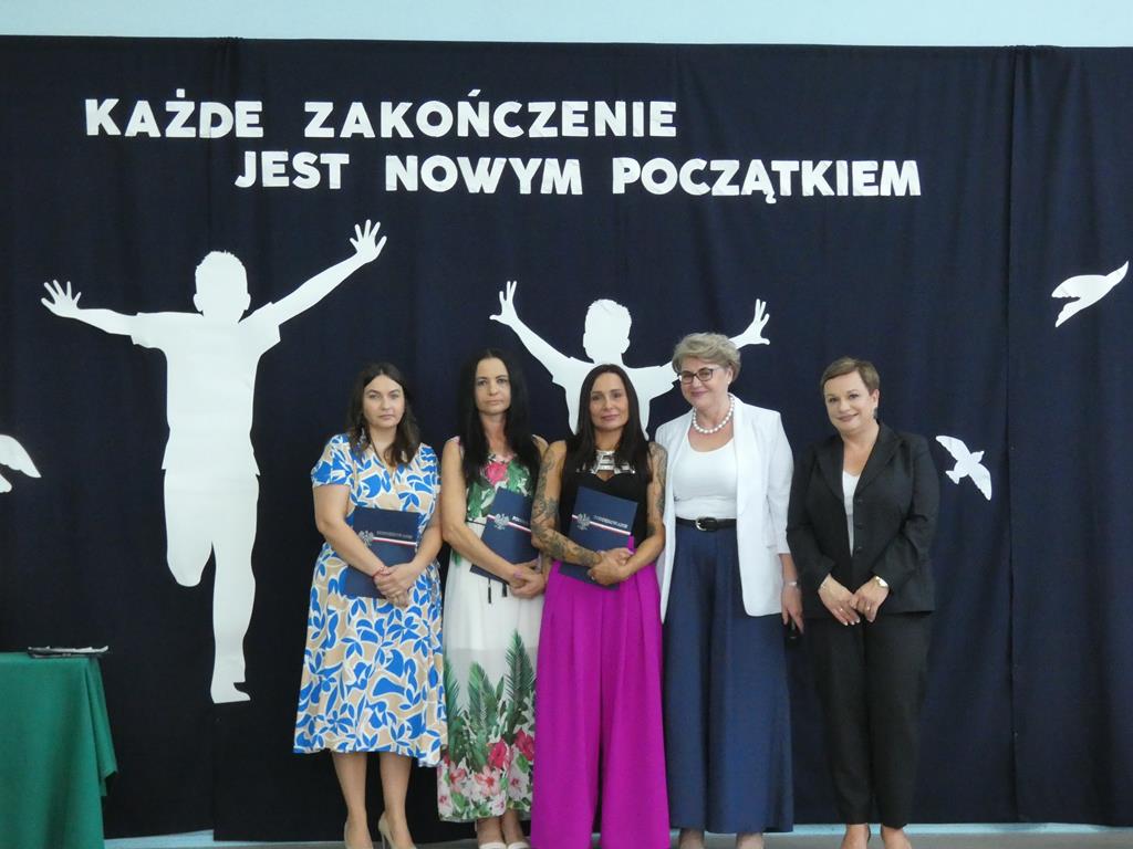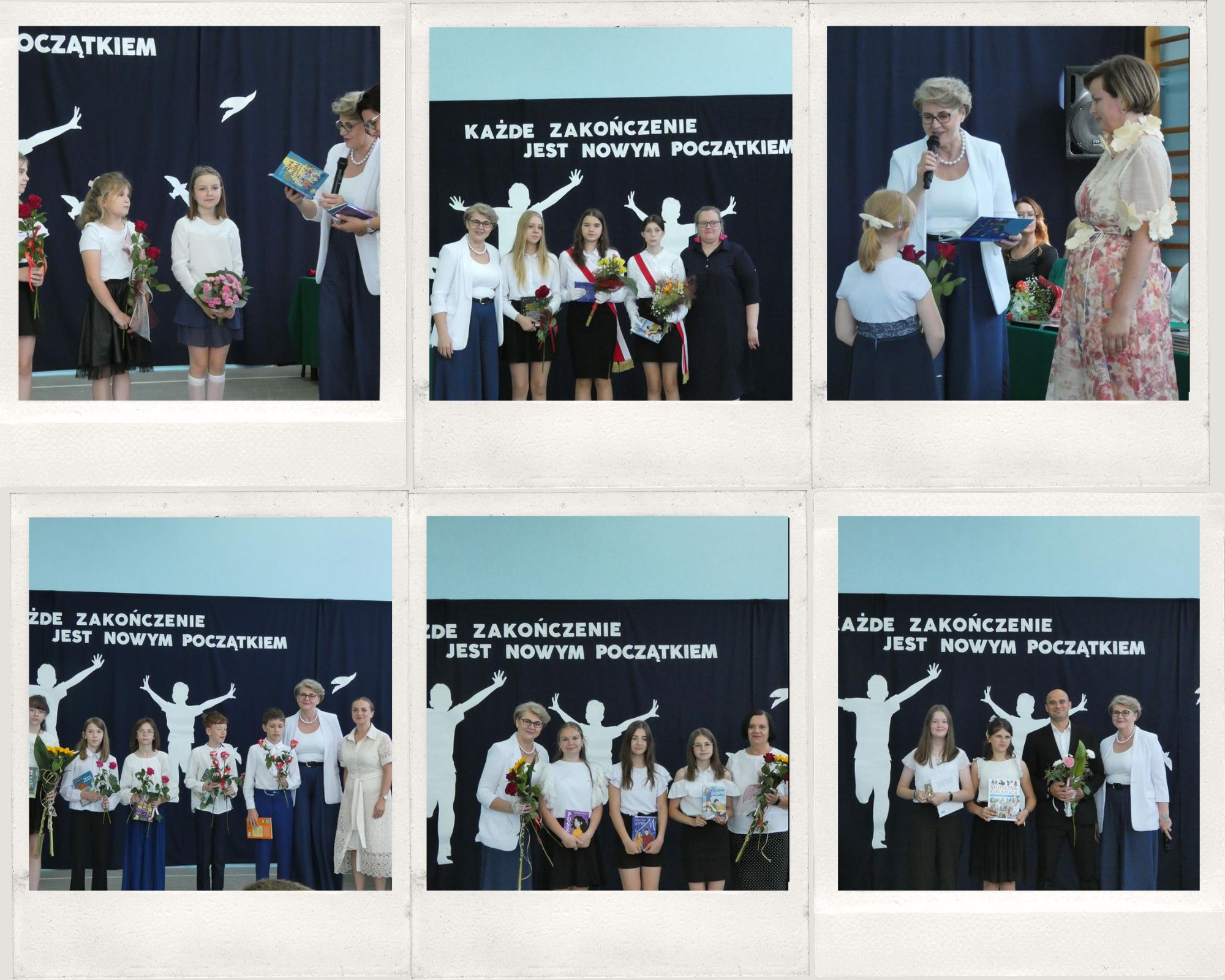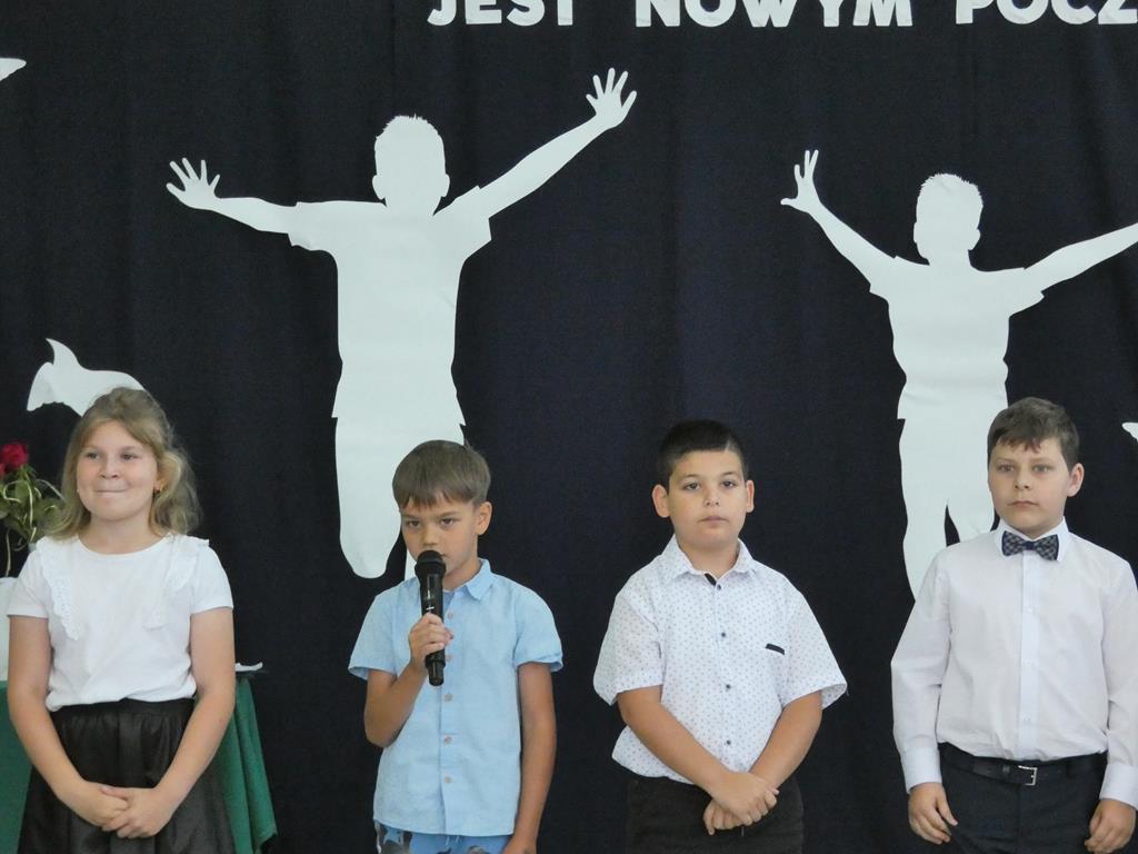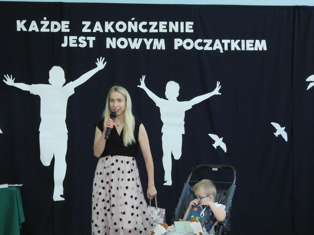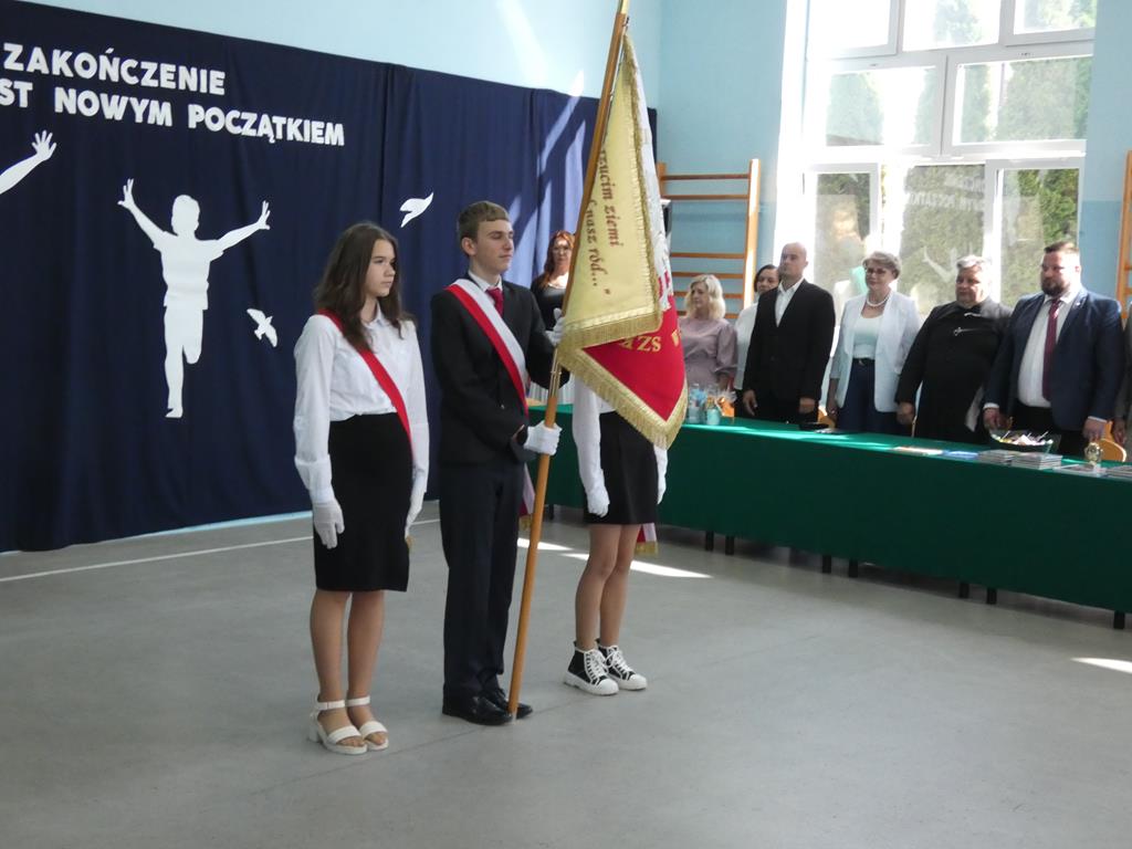 „Każde zakończenie jest nowym początkiem”, tym hasłem uczniowie klasy ósmej pożegnali się ze szkołą. Klasa ósma podziękowała symbolicznym kwiatkiem dyrektorowi szkoły, nauczycielom, pracownikom obsługi i administracji oraz zaproszonym gościom. Nie zabrakło wzruszeń i ciepłych słów dla absolwentów. Uczniowie klasy ósmej wręczyli na ręce pani dyrektor tablo, które zawisło na korytarzu szkolnym.
