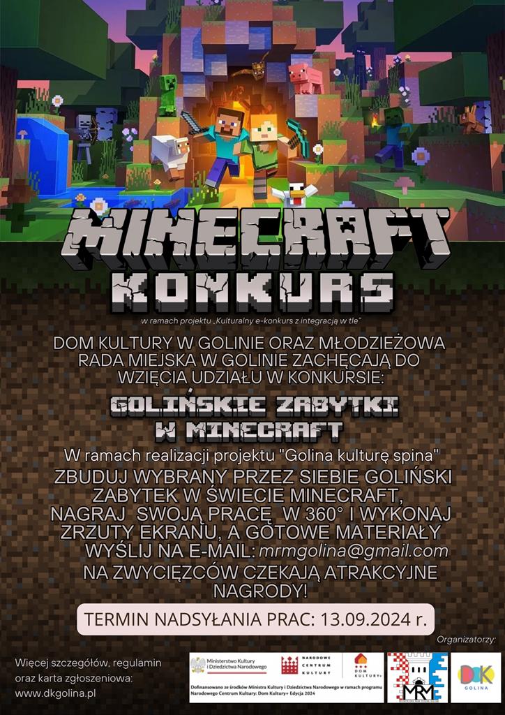 Młodzieżowa Rada Miejska w Golinie wraz z Domem Kultury w Golinie zapraszają wszystkich mieszkańców gminy do udziału w konkursie „Golińskie zabytki w Minecraft".