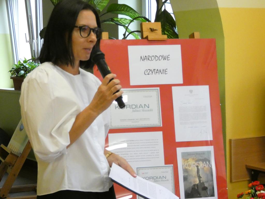 Narodowe Czytanie to coroczna akcja wspólnego czytania wybranej lektury, do której przyłączyć się mogą wszystkie chętne osoby prywatne oraz instytucje publiczne w kraju i za granicą. Celem jest promowanie najpiękniejszych dzieł polskiej literatury oraz promowanie czytelnictwa. Akcja Narodowego Czytania została zainicjowana w 2012 roku wspólną lekturą Pana Tadeusza Adama Mickiewicza. Lekturą tegorocznej odsłony Narodowego Czytania jest Kordian Juliusza Słowackiego. W Naszej szkole uczniowie oraz grupa przedszkolna mieli okazję wysłuchać obszerny fragment powieści, którą czytały uczennice z klasy VIII : Dominika, Wiktoria i Zuzanna. W dniu 8 września na Narodowym Czytaniu organizowanym przez Biblioteką Publiczną w Golinie nagrody otrzymały osoby, które wykonały prace na konkurs plastyczny " Wokół Słowackiego. Również nasi nauczyciele Pani Emilia Napierała oraz Bernadeta Kucharska otrzymały podziękowanie za przygotowanie dzieci do konkursu. Narodowe Czytanie było połączone ze spotkaniem ze znakomitą aktorką Emilią Krakowską.