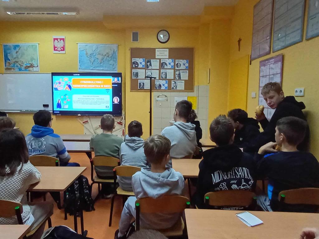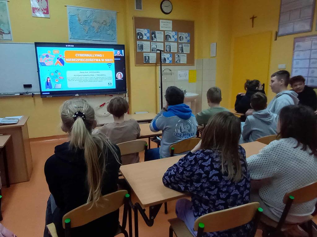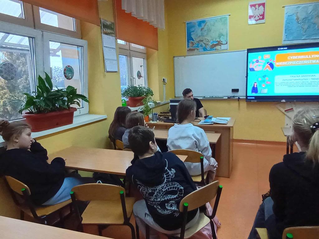 W czwartek 4 grudnia, uczniowie klas 5, 6, 7 i 8 wzięli udział w specjalnej lekcji online poświęconej tematyce cyberbullyingu, czyli przemocy rówieśniczej w internecie. Zajęcia zostały zorganizowane w ramach działań naszej szkoły na rzecz bezpieczeństwa w sieci. Podczas lekcji uczniowie dowiedzieli się: • czym dokładnie jest cyberbullying i jakie są jego najczęstsze formy, • jak rozpoznawać niebezpieczne sytuacje online, • jakie konsekwencje prawne i emocjonalne może mieć przemoc w internecie, • jak reagować, gdy jest się świadkiem lub ofiarą cyberprzemocy, • gdzie szukać pomocy i wsparcia. Prowadząca p. Paulina Sadowska omówiła również zasady bezpiecznego i kulturalnego korzystania z mediów społecznościowych, komunikatorów oraz gier online. Szczególną uwagę zwróciła na szacunek wobec innych użytkowników oraz budowanie pozytywnego klimatu w sieci. Dbamy o bezpieczeństwo w Internecie