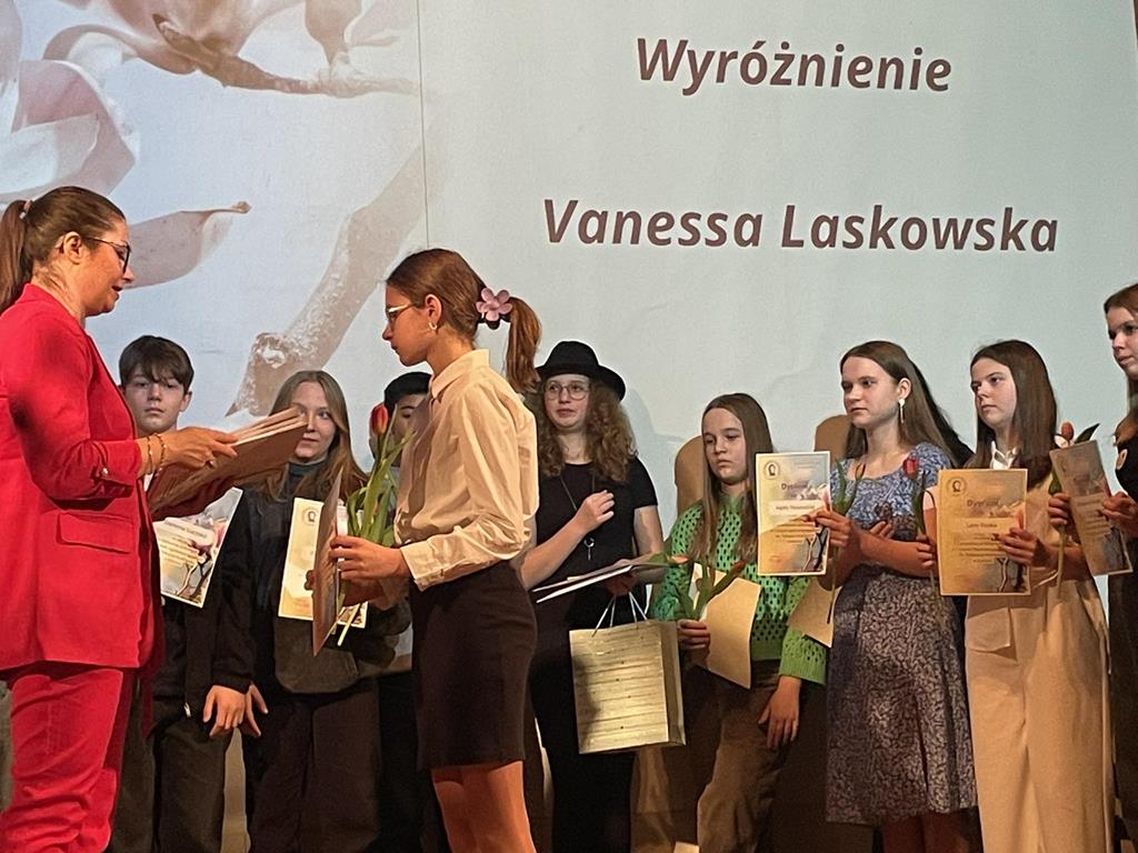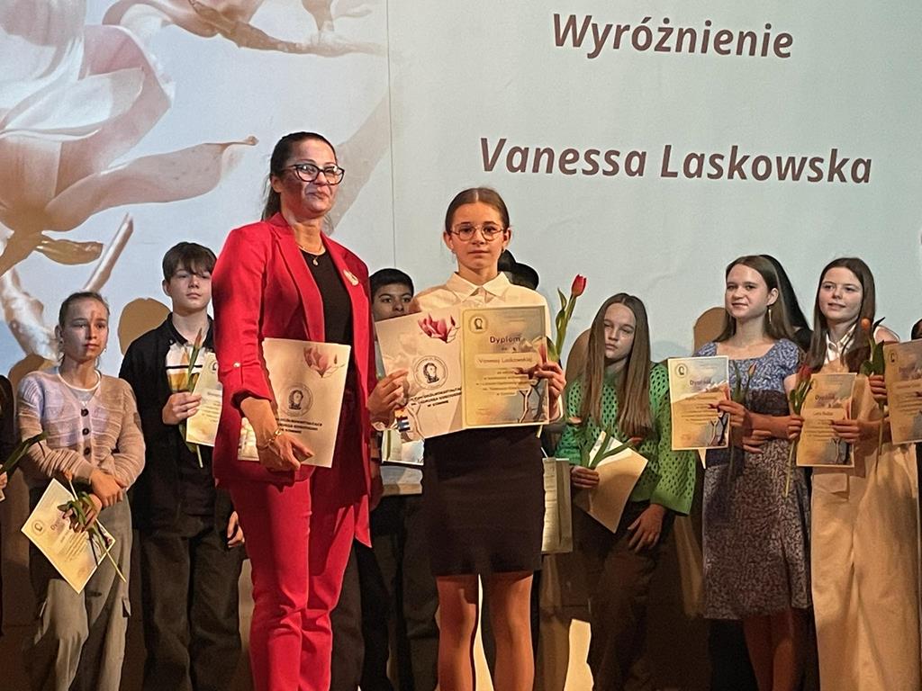 W dniu 21 marca w inauguracyjnym koncercie wiosennym w I LO w Koninie wzięła udział uczennica naszej szkoły Vanessa Laskowska. Prezentacje wokalne miały charakter konkursowy i wzięli w nim udział uczniowie klas VI- VIII szkół podstawowych powiatu konińskiego. Tematyka doboru repertuaru była dowolna. Dziewiętnaście prezentacji wokalnych obejrzało i oceniało specjalnie powołane profesjonalne jury. Vanessa piękną dykcją, nieskazitelną intonacją i swoją muzykalnością zaskarbiła sobie przychylność oceniających zdobywając wyróżnienie za wykonanie „Śpiewki 1920” muz. K. Dębski, sł. J. Cygan z filmu „Bitwa warszawska”. Talent naszej uczennicy wart jest uwagi i dalszego rozwoju!