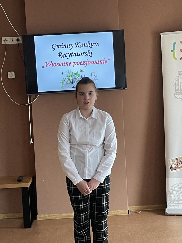 27 kwietnia b.r. odbyła się kolejna edycja Gminnego Konkursu Recytatorskiego „Wiosenne poezjowanie”, organizowanego przez Bibliotekę Publiczną w Golinie, skierowanego do uczniów szkół podstawowych z terenu gminy. Naszą szkołę reprezentowały: w kategorii klas I- III- Magdalena Gauza oraz Blanka Wilant, natomiast w kategorii klas IV- VI- Nadia Szczepańska, Vanessa Laskowska oraz Zuzanna Kurleto.