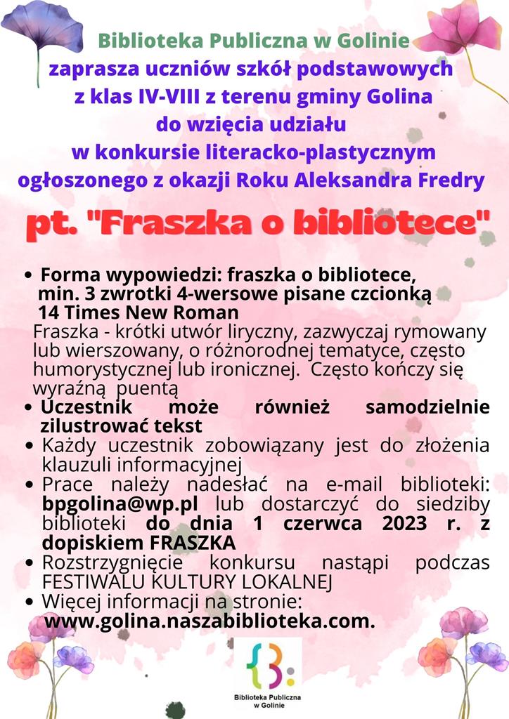 Biblioteka Publiczna w Golinie zaprasza uczniów z klas IV-VIII do wzięcia udziału w konkursie literacko-plastycznym.