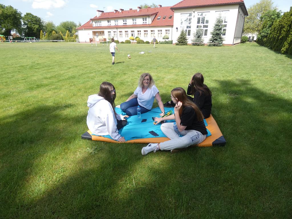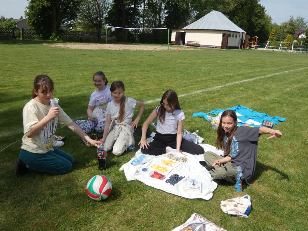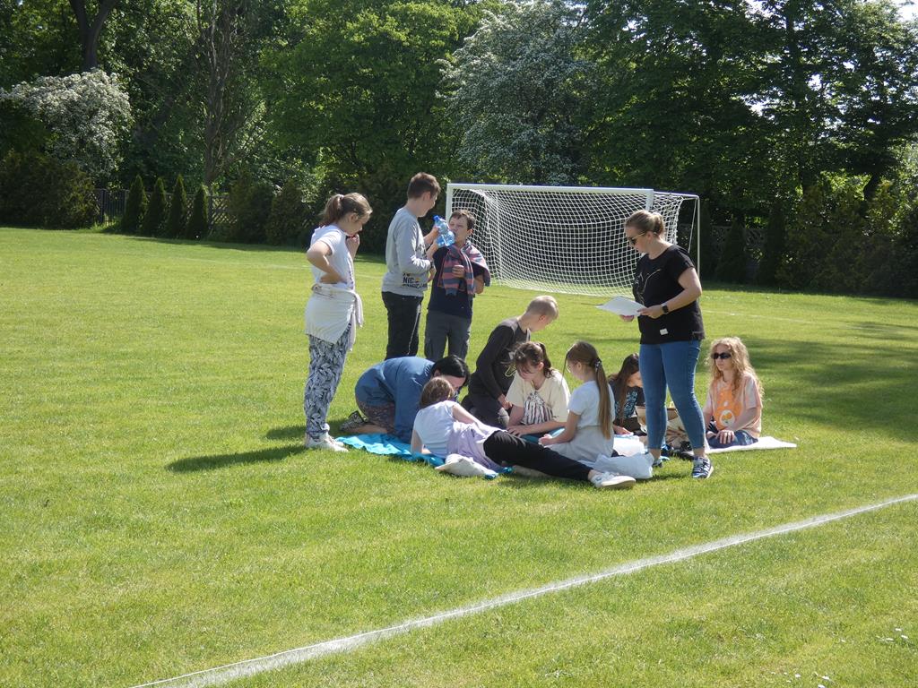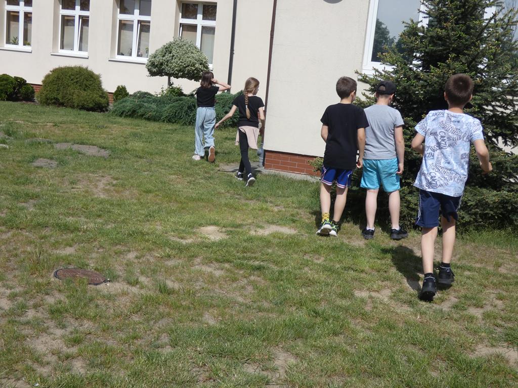 Po skończonych "podchodach" uczniowie wspólnie integrowali się na boisku szkolnym, uczestnicząc w wybranych przez siebie grach zespołowych.