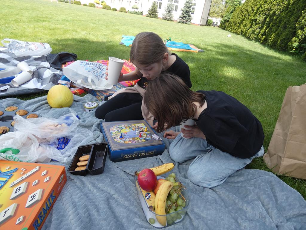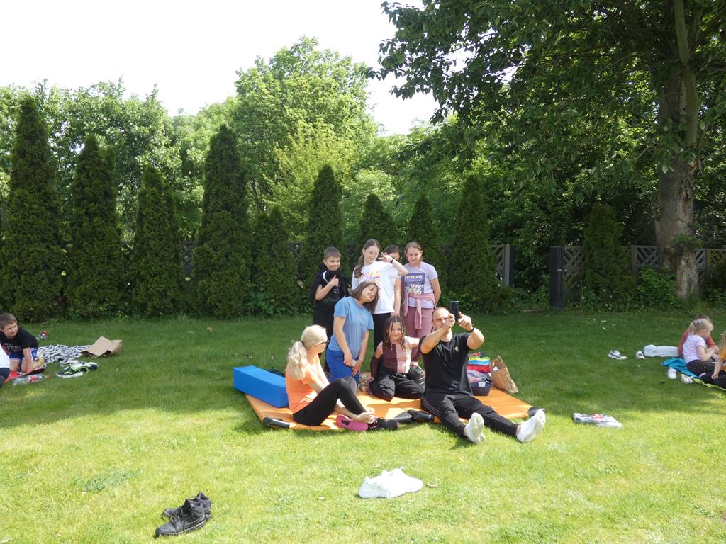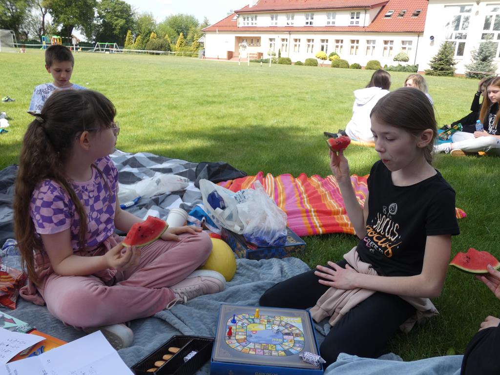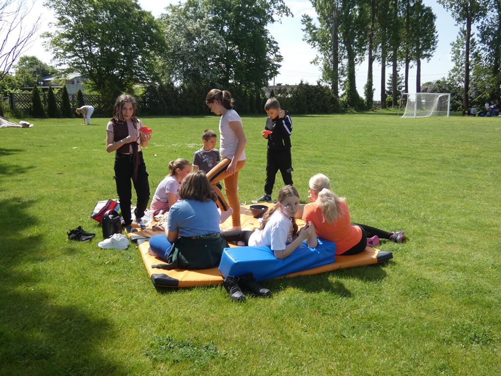 Po skończonych "podchodach" uczniowie wspólnie integrowali się na boisku szkolnym, uczestnicząc w wybranych przez siebie grach zespołowych.