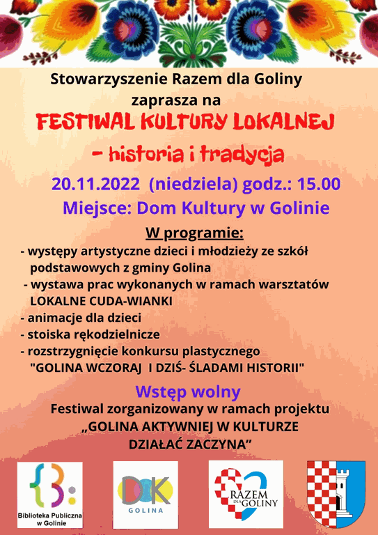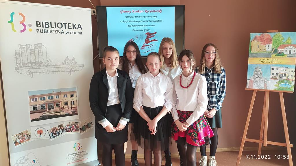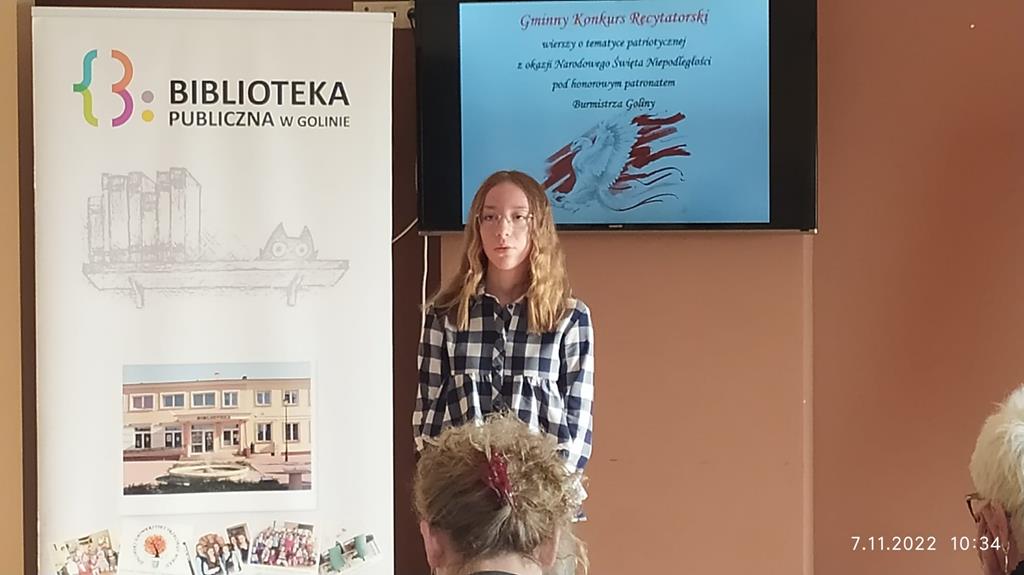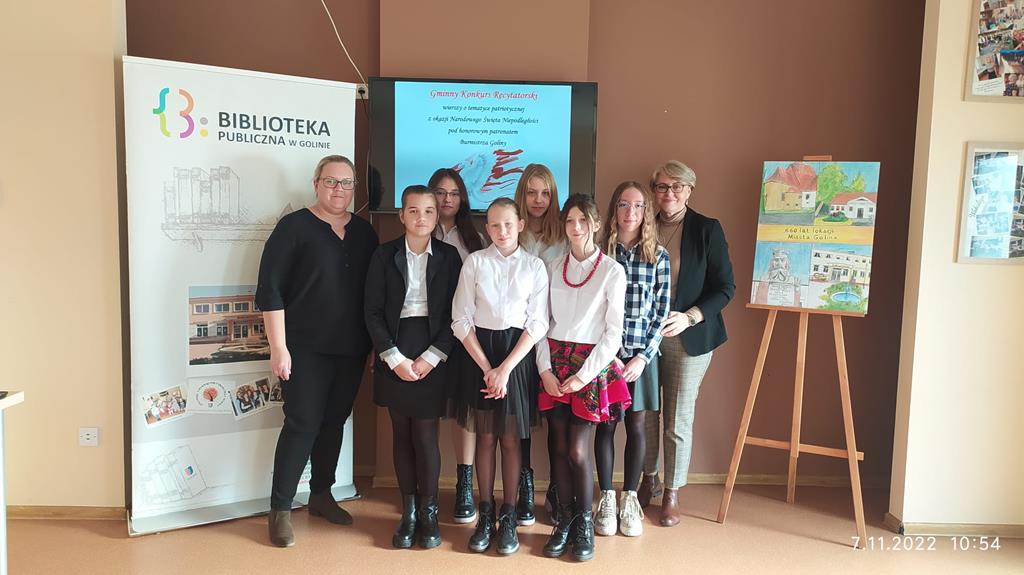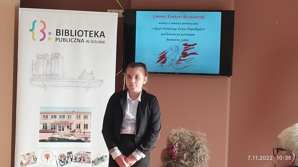 7 listopada 2022 r. w Bibliotece Publicznej w Golinie odbył się Gminny Konkurs Recytatorski wierszy o tematyce patriotycznej pod honorowym patronatem Burmistrza Goliny - Mirosława Durczyńskiego.