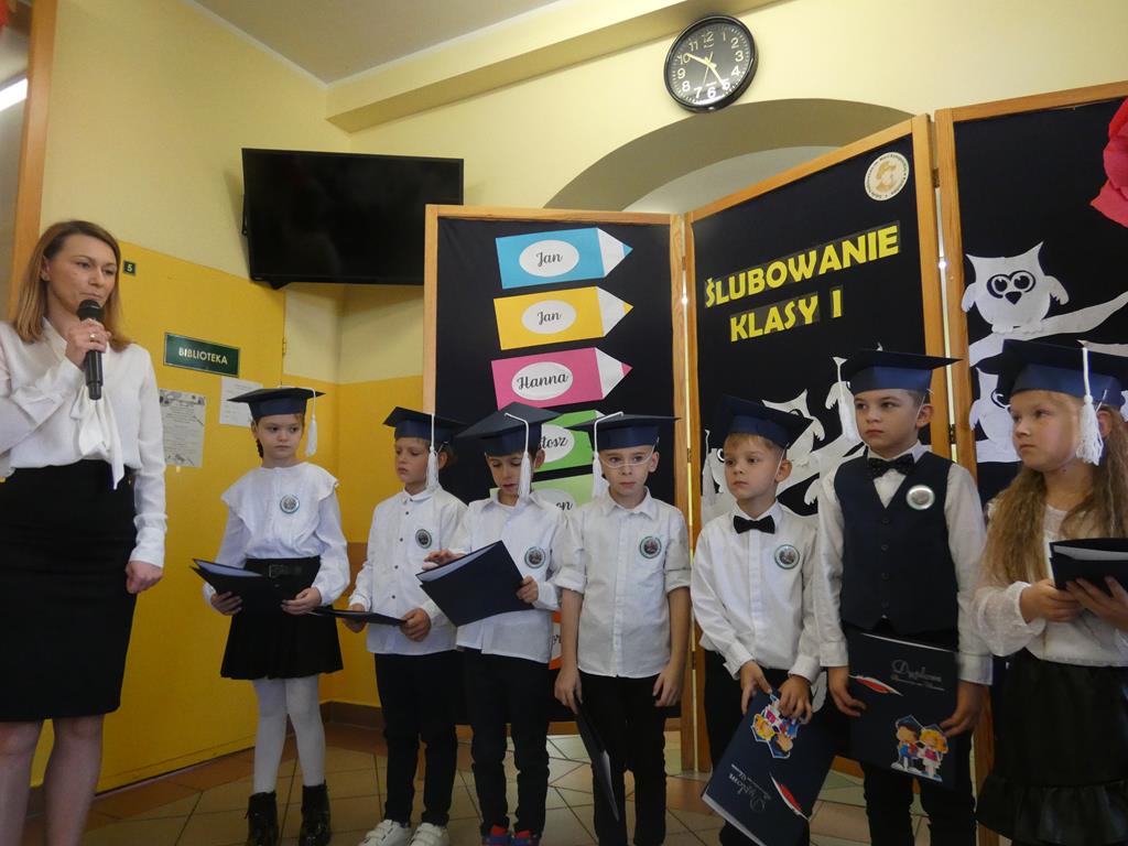 Tymi słowami 20 października b.r. pierwszaki z naszej szkoły złożyli uroczyste ślubowanie oraz zostali pasowani na pełnoprawnych uczniów Szkoły Podstawowej im. M. Konopnickiej w Radolinie. W tej ważnej chwili naszym małym bohaterom towarzyszyli: Burmistrz Goliny pan Mirosław Durczyński, Grono Pedagogiczne, rodzice oraz cała społeczność szkolna. Pierwszoklasiści przedstawili swoje umiejętności artystyczne w krótkim montażu słowno- muzycznym, grając, śpiewając i recytując. Wśród uczniów powitali ich również starsi koledzy z klasy VIII, wręczając drobne upominki, a także przewodnicząca Rady Rodziców pani Justyna Jabłońska. Dyrektor szkoły podziękowała małym bohaterom za przygotowanie do tego uroczystego dnia, a rodzicom i wychowawczyni życzyła wielu sukcesów, zadowolenia z dzieci i owocnej współpracy.
