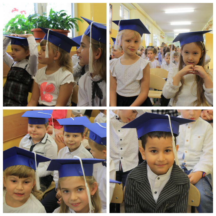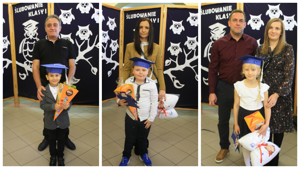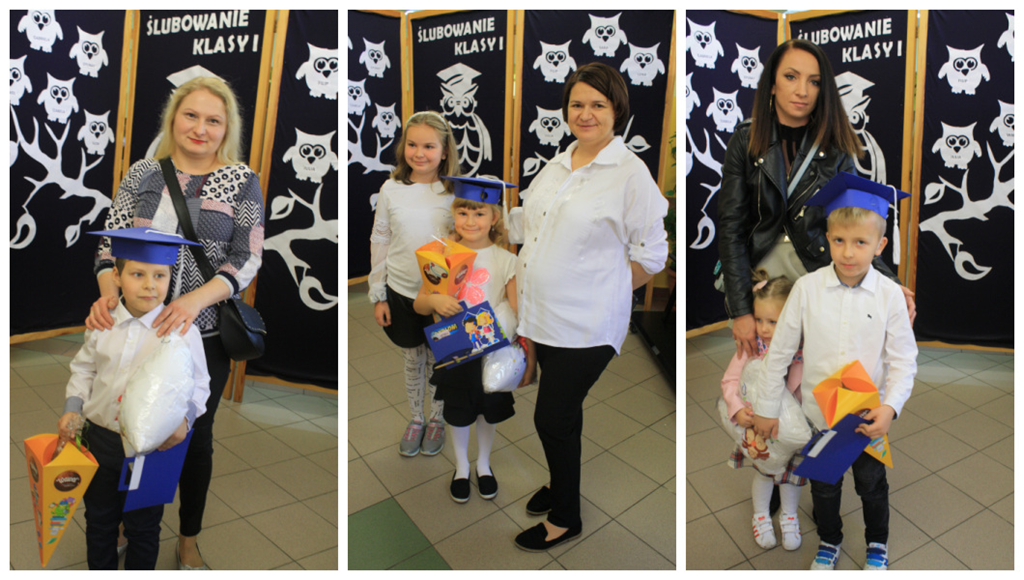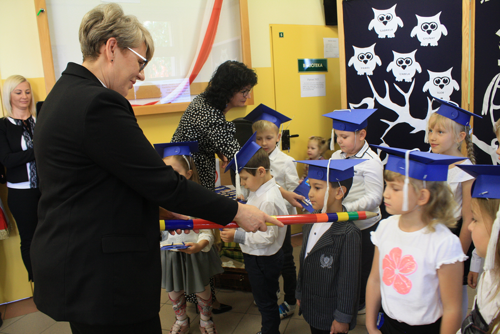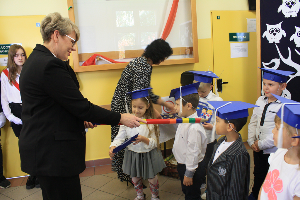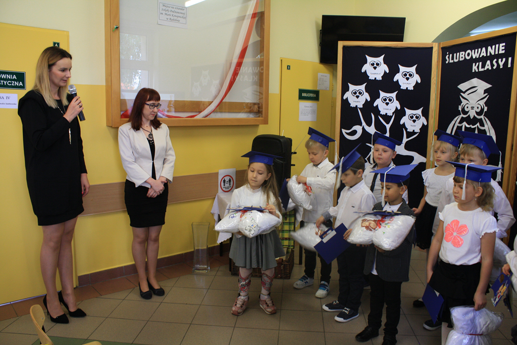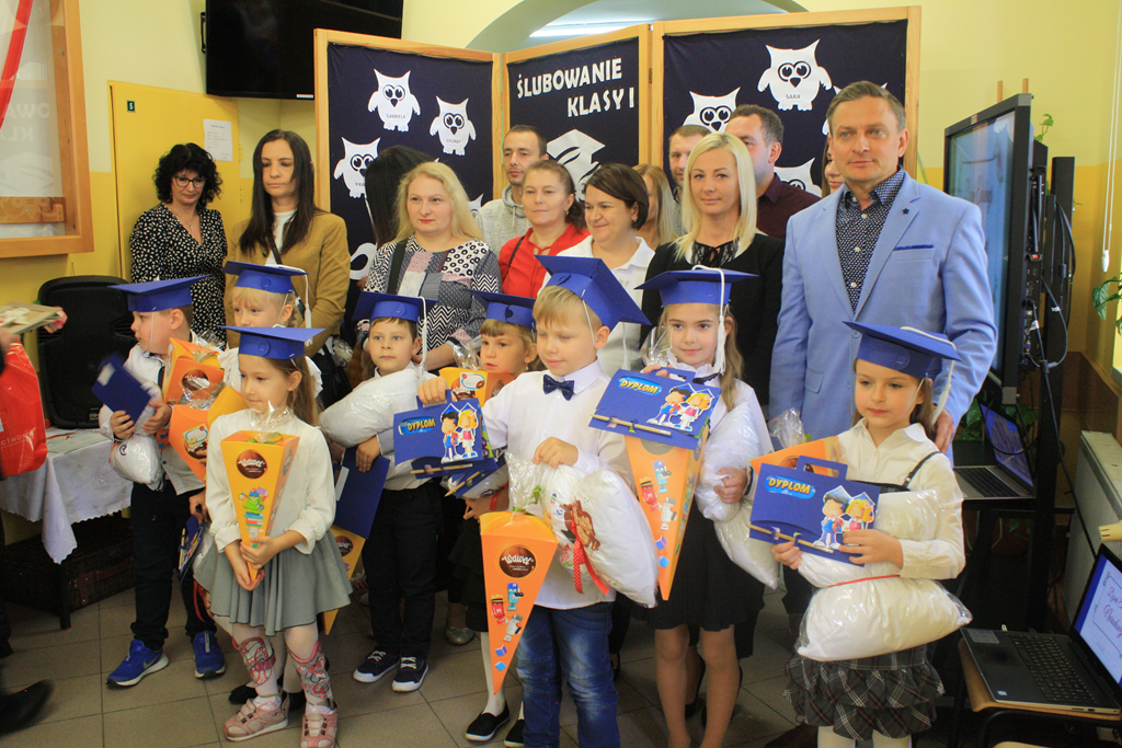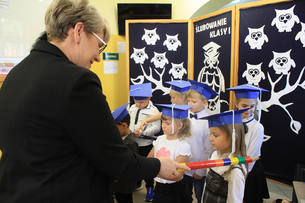 Następnie oddano głos klasie pierwszej. W części artystycznej, na którą składały się wiersze, piosenki oraz zagadki, bohaterowie dzisiejszego dnia przedstawili się z jak najlepszej strony, aby godnie wejść do grona uczniów naszej szkoły. Po prezentacji umiejętności i wiadomości pierwszoklasistów nastąpił uroczysty akt ślubowania i pasowania na ucznia. Kolorowym ołówkiem tego symbolicznego aktu dokonała Pani Dyrektor Alina Kozłowska. Następnie klasa VIII , jak to już jest zwyczajem naszej szkoły, wręczyła pamiątki klasie pierwszej. Rada Rodziców również obdarowała ich prezentami. Uroczysty dzień zakończyły pamiątkowe zdjęcia.