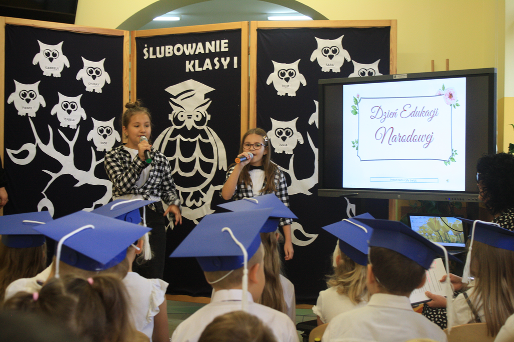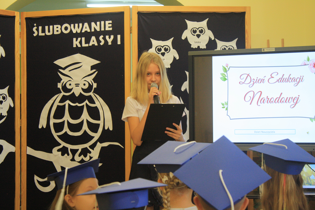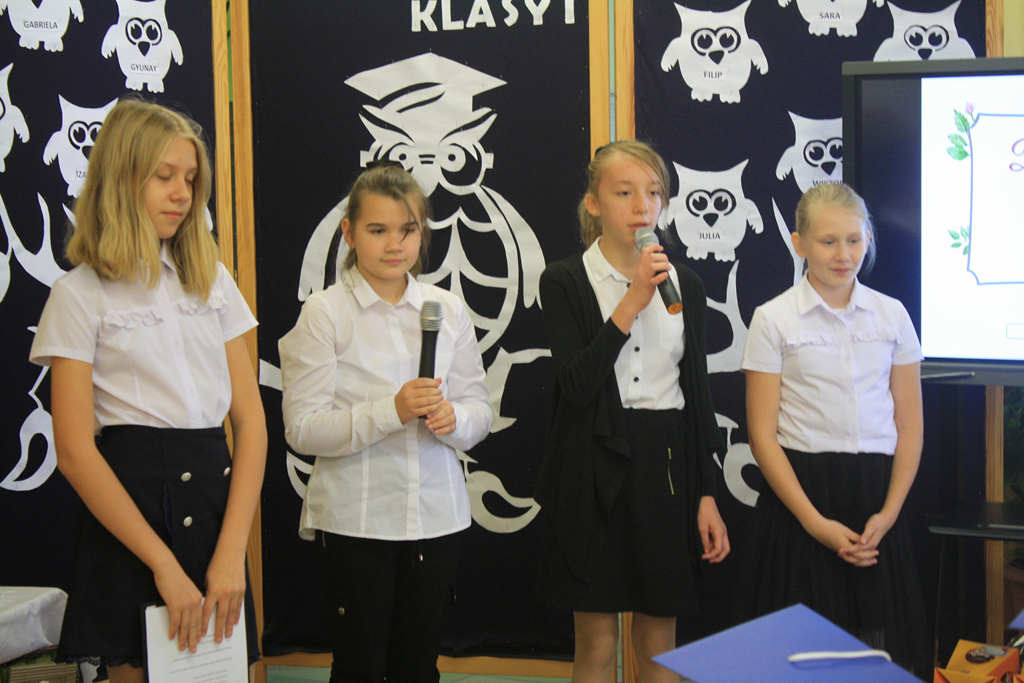 Najpierw jednak uczennice z klasy V w imieniu społeczności szkolnej złożyły życzenia naszym nauczycielom, wychowawcom i pracownikom obsługi, ponieważ 14 października obchodzony jest DEN. Do życzeń dołączyli się również przedstawiciela Rady Rodziców.