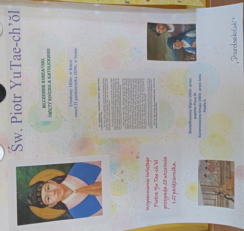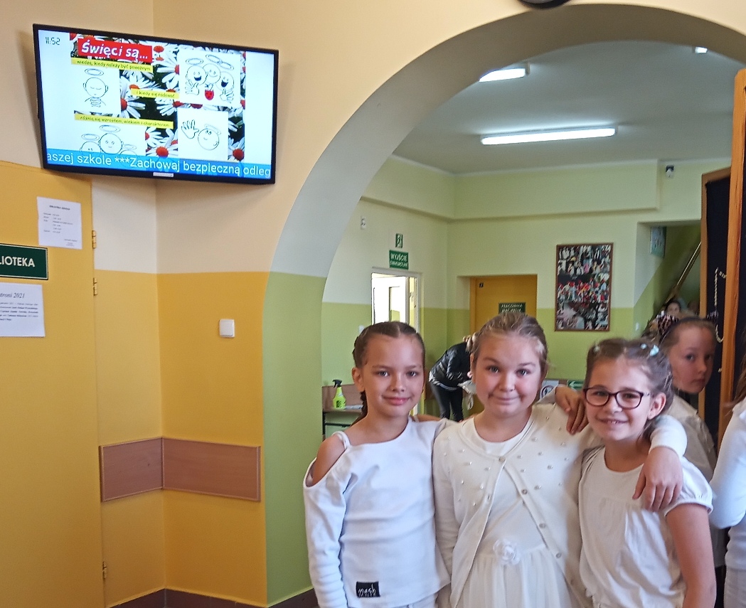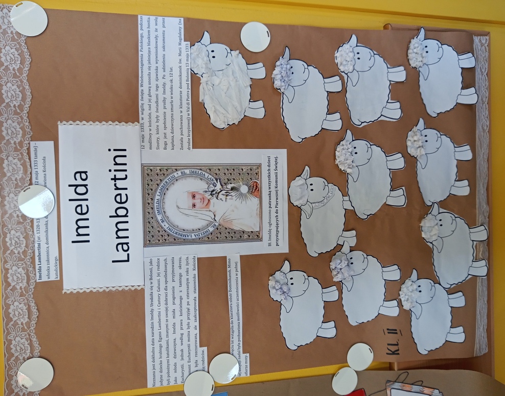 Wszystkie przygotowane prace zostały zaprezentowane na szkolnym korytarzu a podczas przerw na telebimie mogliśmy przyglądać się świętym patronom naszych imion, poczytać cytaty o świętości oraz obejrzeć galerię zdjęć obchodów Dnia Świętych sprzed lat.