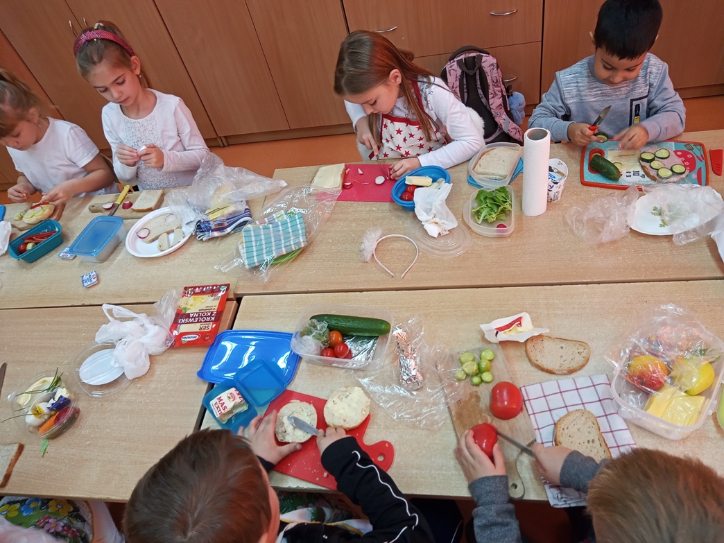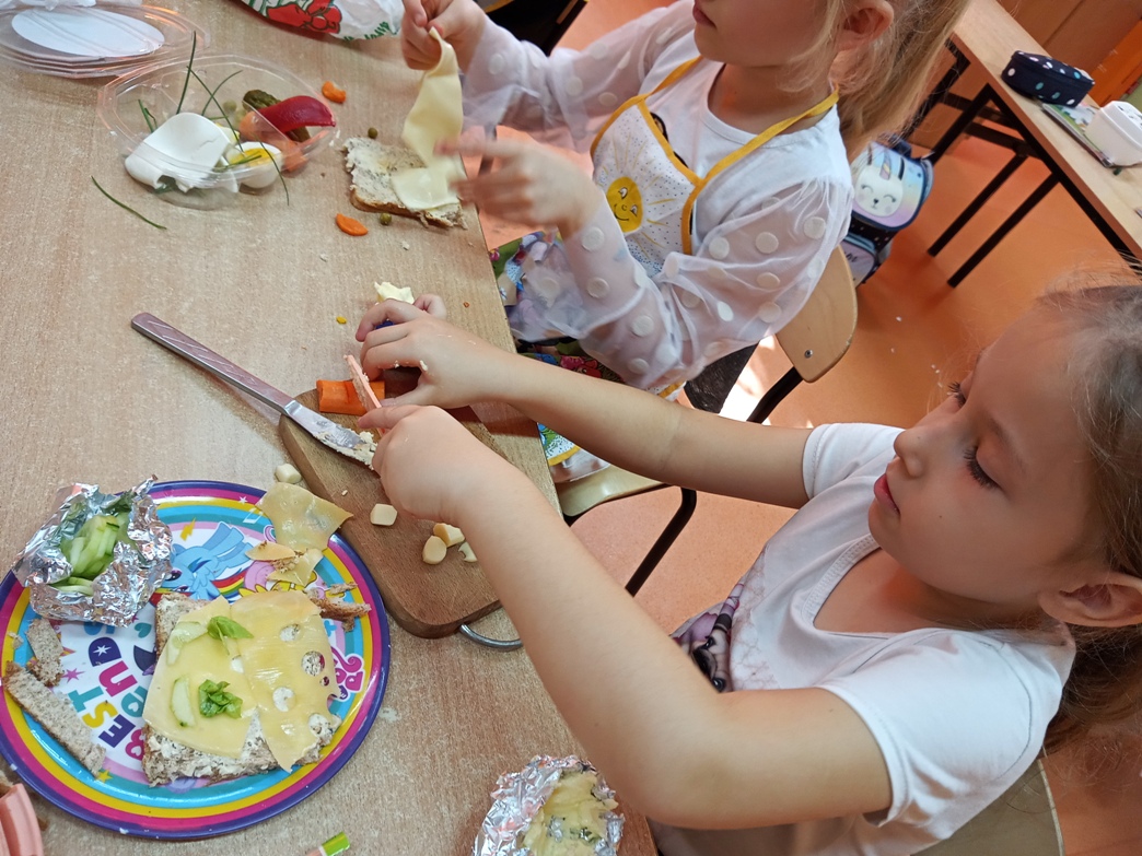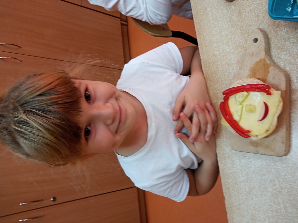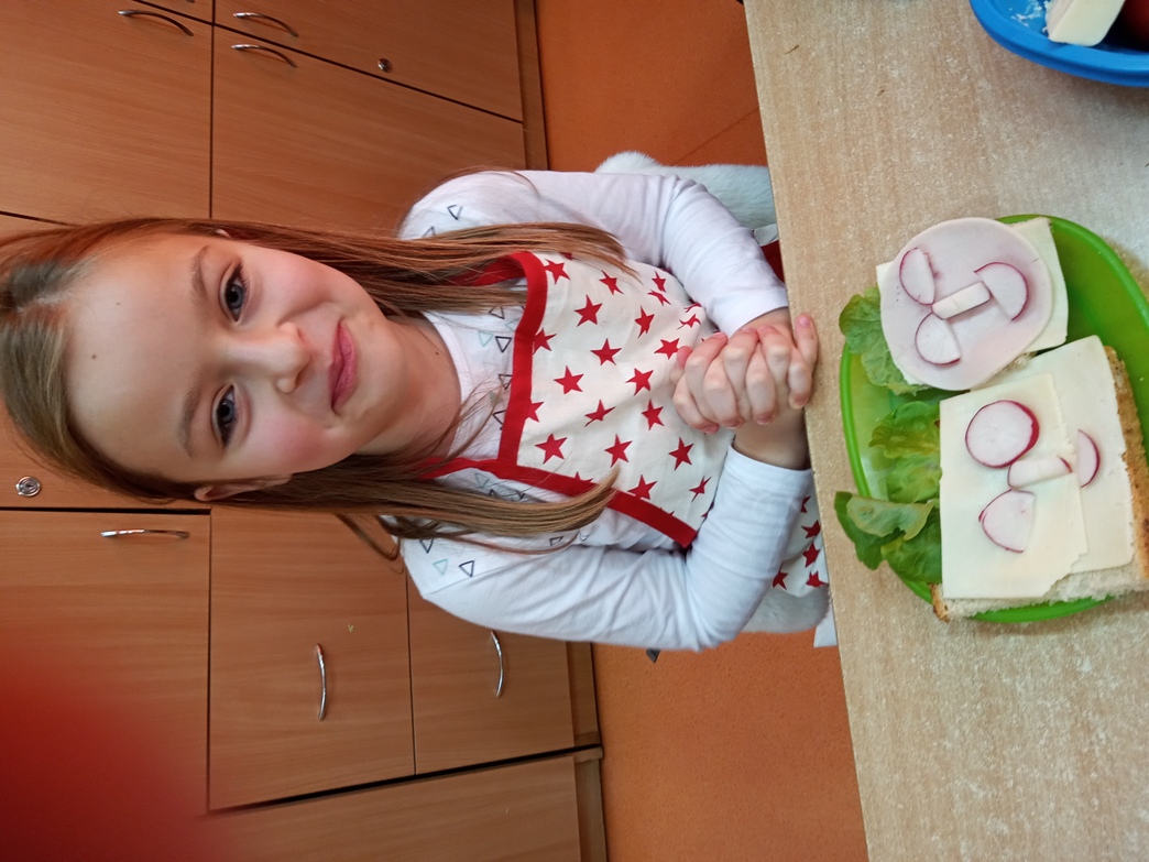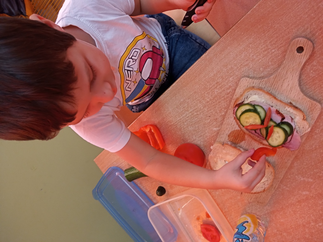 Po wysłuchaniu materiałów filmowych i wykonaniu zadań w Kartach pracy wszyscy zabrali się do przygotowania zdrowych kanapek. Dzieci radziły sobie doskonale a efektem ich pracy były kolorowe kanapki, które ze smakiem zjadły :)
