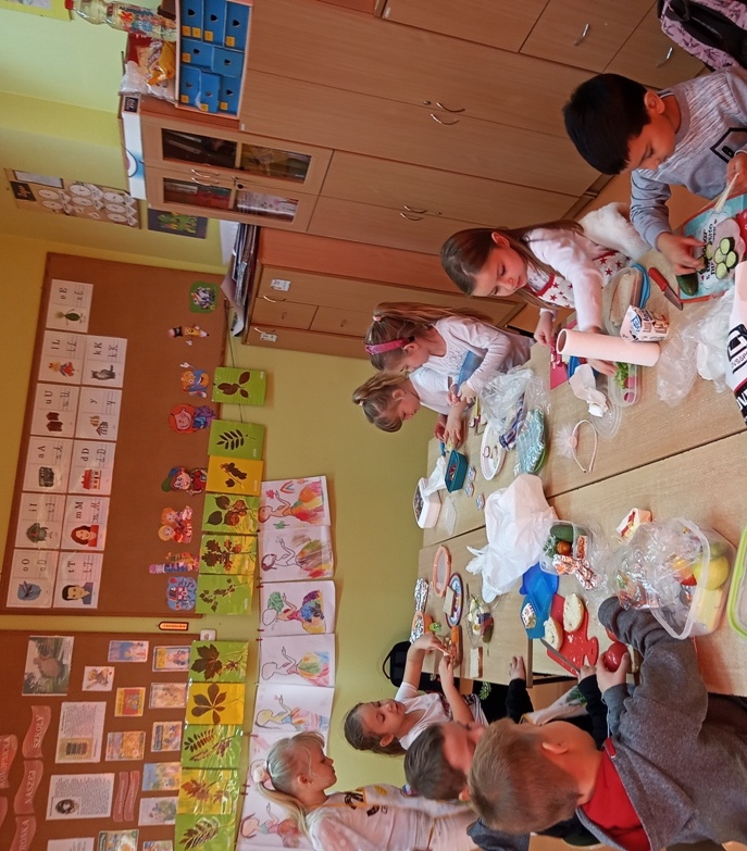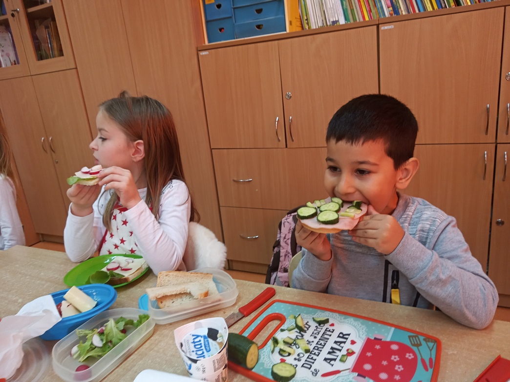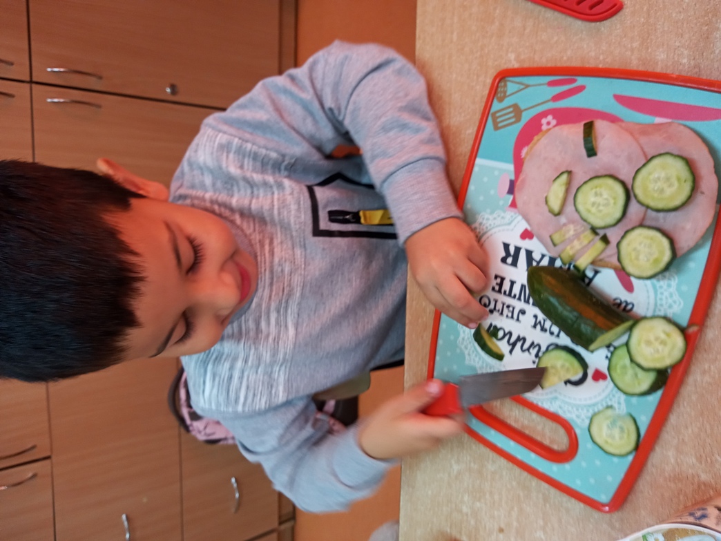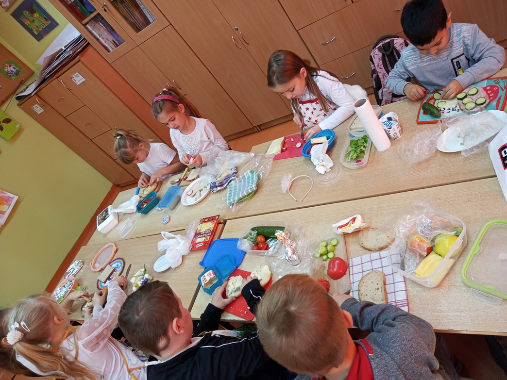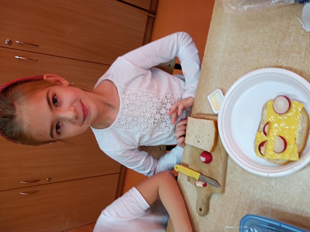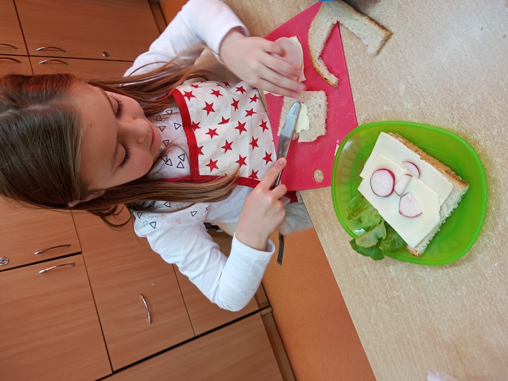 Po wysłuchaniu materiałów filmowych i wykonaniu zadań w Kartach pracy wszyscy zabrali się do przygotowania zdrowych kanapek. Dzieci radziły sobie doskonale a efektem ich pracy były kolorowe kanapki, które ze smakiem zjadły :)