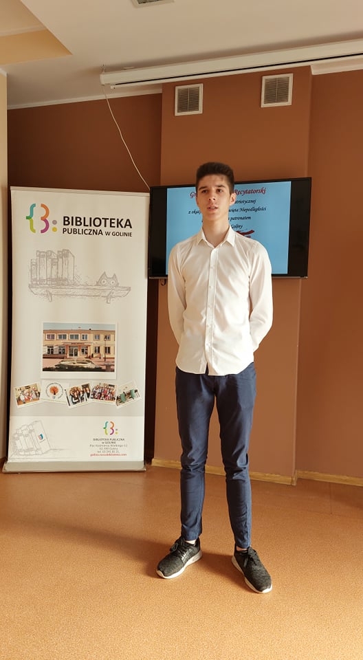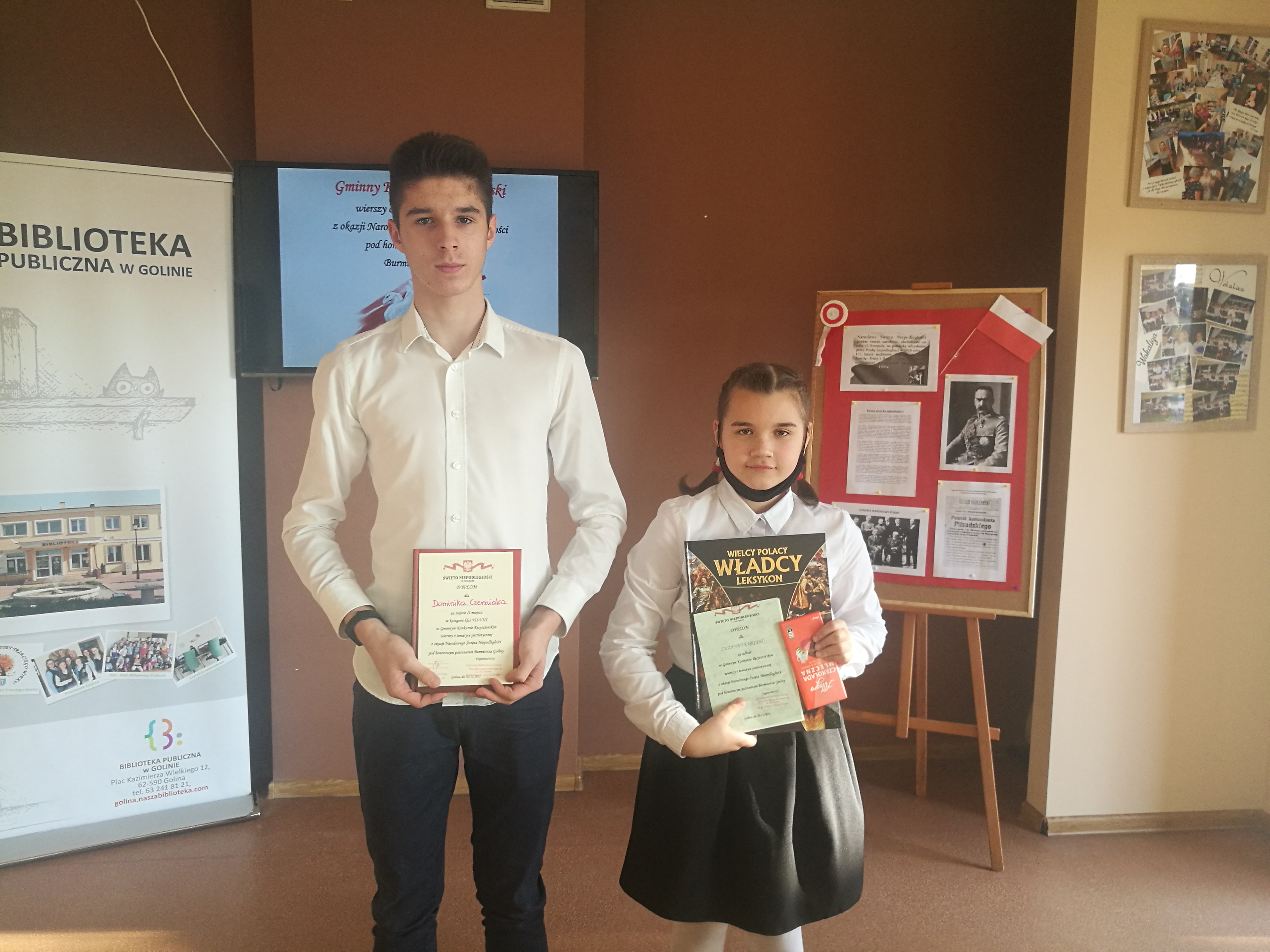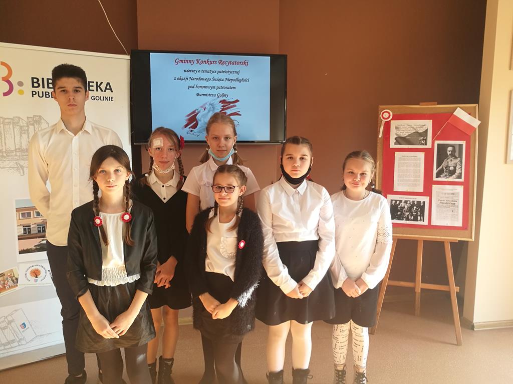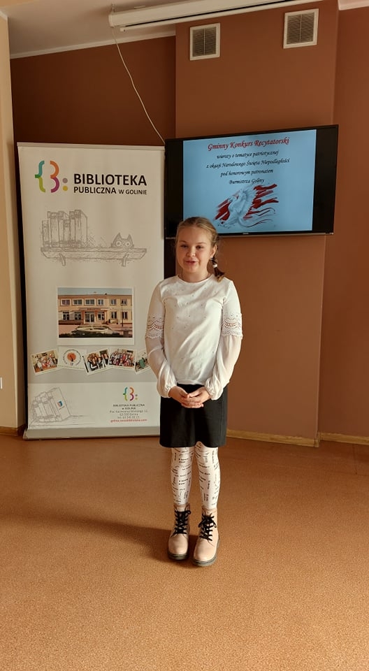 Dnia 3 listopada 2021r. uczniowie ze Szkoły Podstawowej im. Marii Konopnickiej w Radolinie wzięli udział w Gminnym Konkursie Recytatorskim na Wiersz o Tematyce Patriotycznej zorganizowanym przez Bibliotekę Publiczną w Golinie. Naszą szkołę reprezentowali uczniowie w dwóch kategoriach (IV - VI oraz VII - VIII). Reprezentantami naszej szkoły byli: Vanessa Laskowska, Weronika Żabierek, Paulina Czerniak, Daria Karnafel, Wiktoria Urbańska oraz Dominik Czerniak, który zajął 2 miejsce recytując wiersz "Bagnet na broń" Władysława Broniewskiego i Zuzanna Kurleto, której wręczono Wyróżnienie za wiersz "Być może "Stanisława Dobrowolskiego.