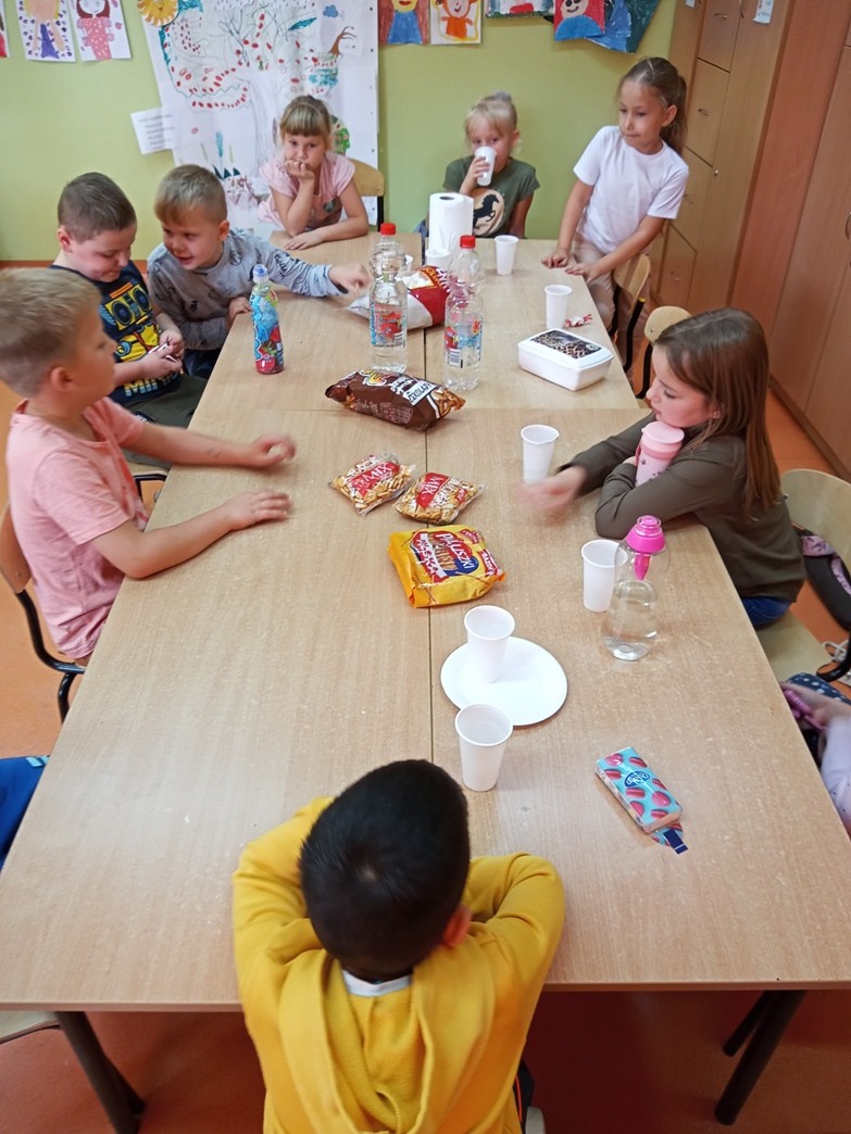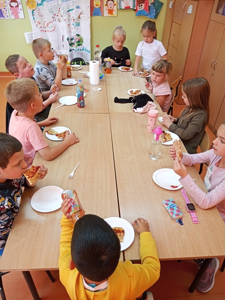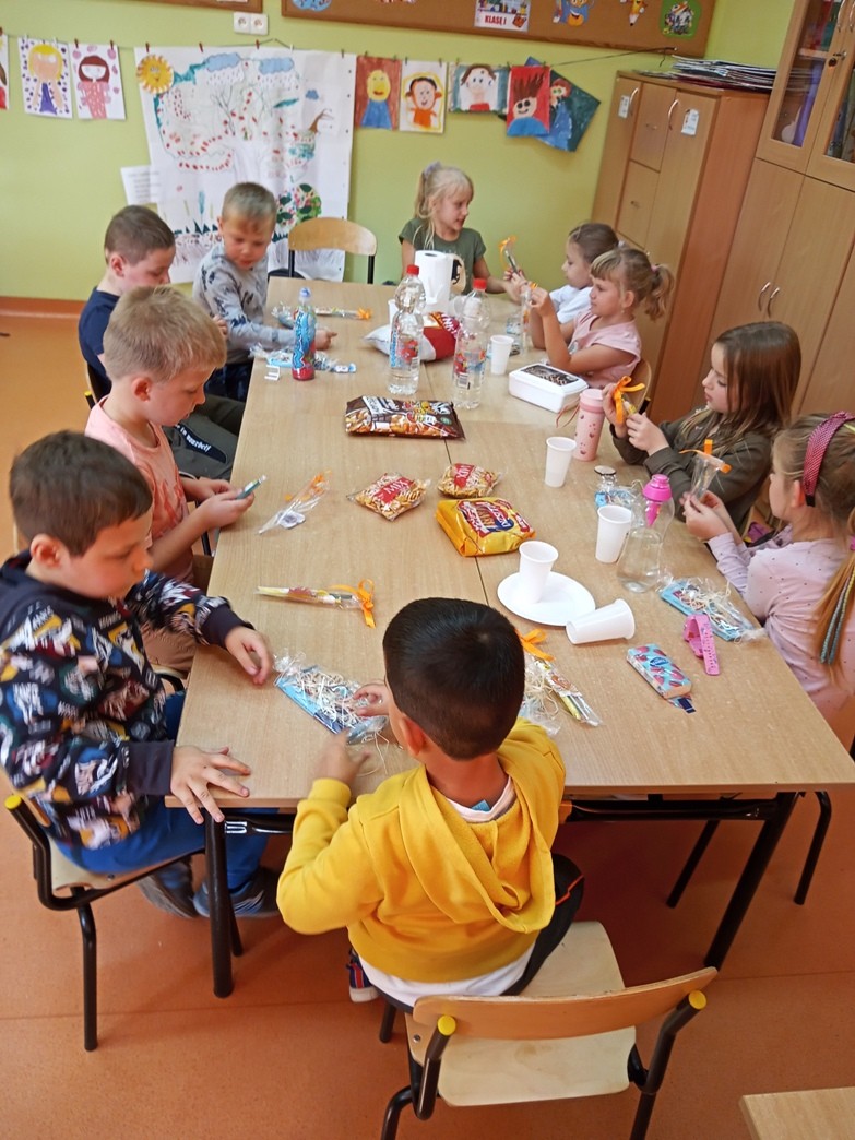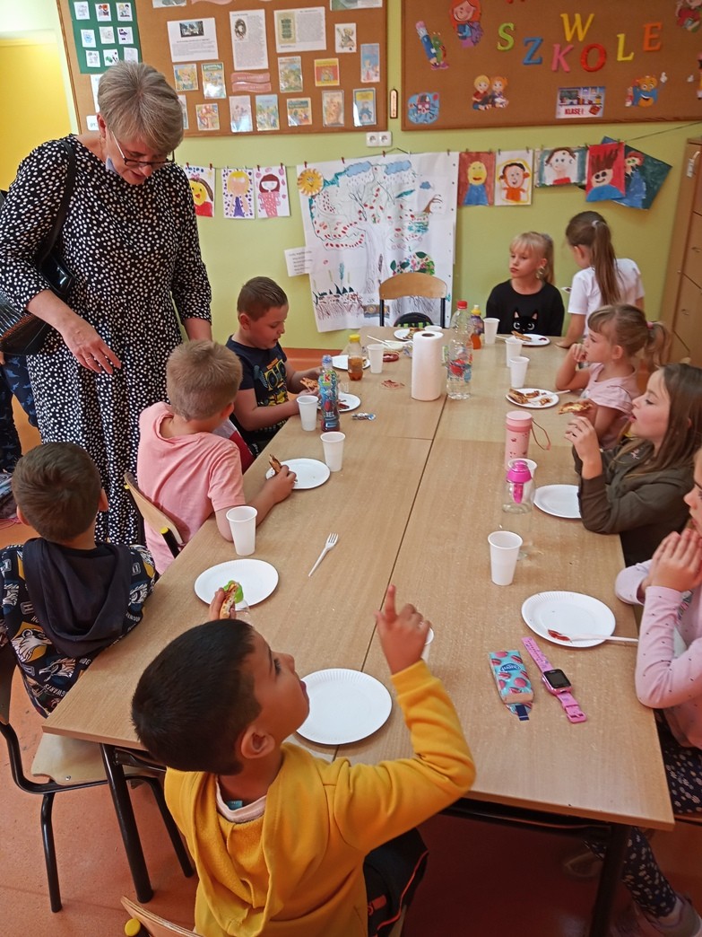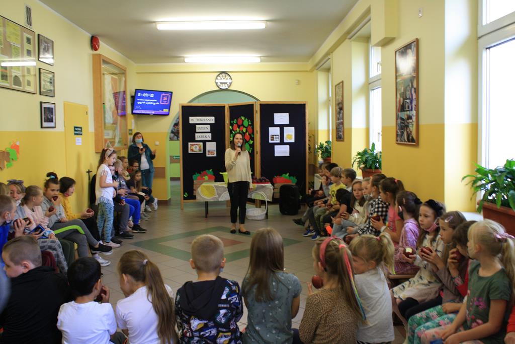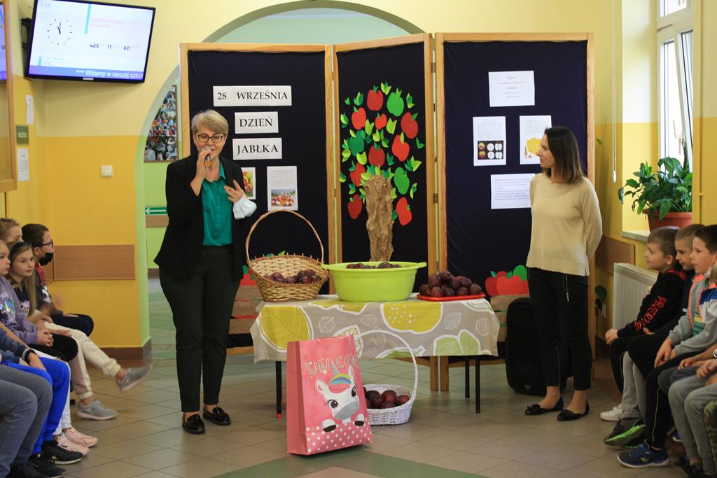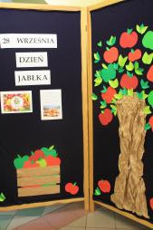 W tym dniu odbyły się zajęcia biblioteczne w grupach przedszkolnych .W zajęciach uczestniczyła p. Dyrektor Alina Kozłowska oraz pedagog szkolny p. Bernadetta Kucharska. Celem zajęć była integracja dzieci oraz zachęcanie ich do spożywania owoców, a w szczególności jabłek i to pod różnymi postaciami z powodu jego walorów zdrowotnych i ożywczych. Zdobywały wiadomości na temat potraw i przetworów z jabłek. Niespodziankę dla najmłodszych przygotowali uczniowie klas I- III z koła aktorskiego, które przedstawiły utwór J. Brzechwy pt. „Entliczek - Pentliczek”. Dzieci ćwiczyły również sprawność manualną, wykonując czerwone jabłuszko z bibuły. To był bardzo ciekawy dzień w przedszkolu.
