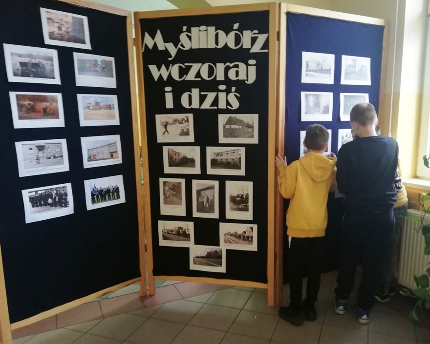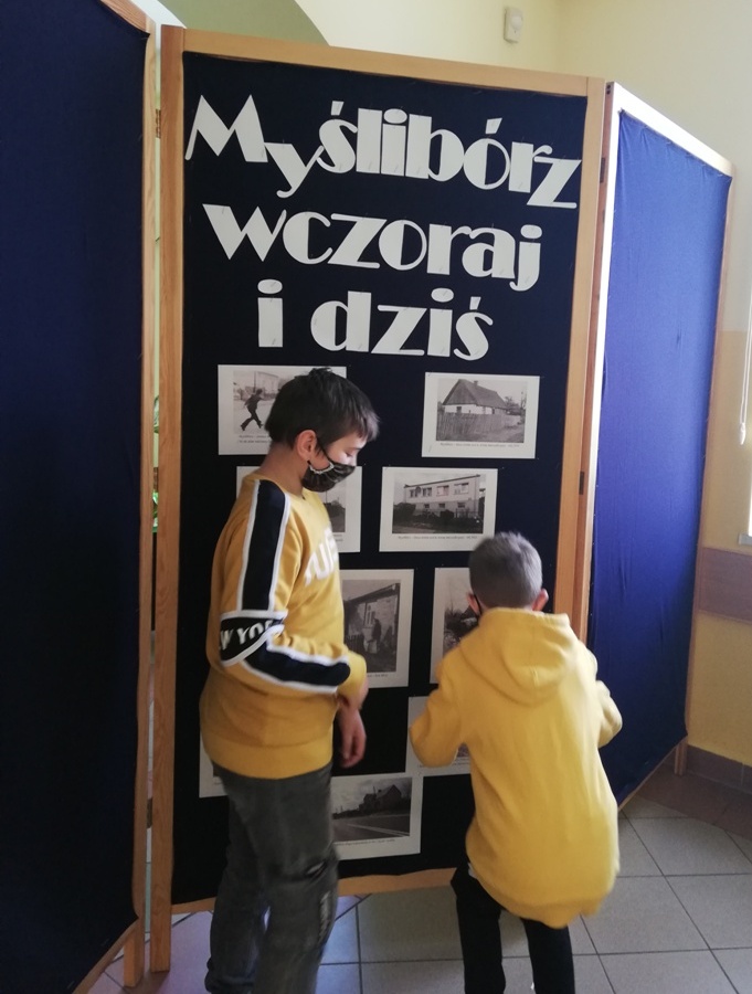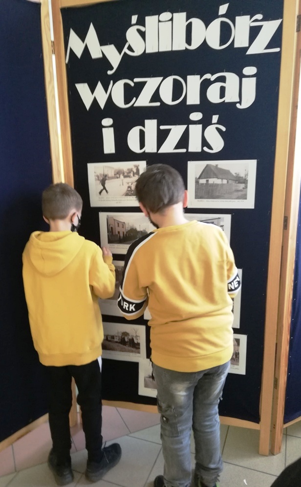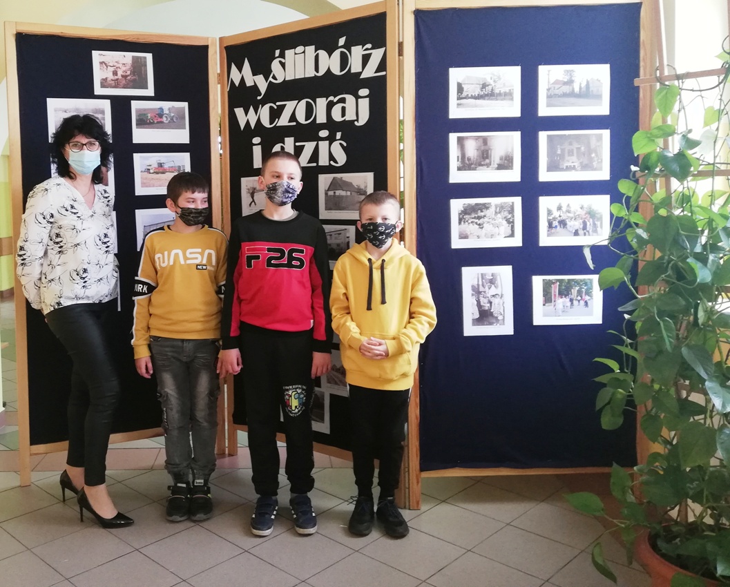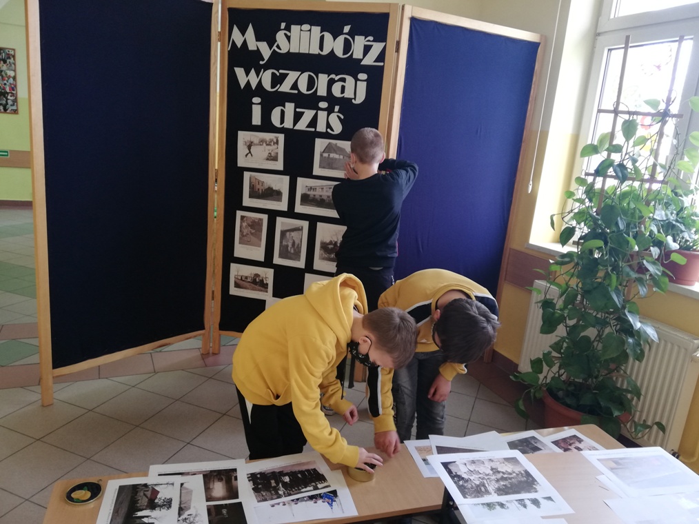 W piątek 23 kwietnia chłopcy z grupy projektowej „ Dzieci Marysi” – Kacper, Kuba i Kaspian, przyjechali do szkoły w celu przygotowania wystawy „ Myślibórz wczoraj i dziś”. To już jedno z końcowym założeń naszego planu w ramach podprojektu Cyfrowej Szkoły Wielkopolski: „Moja babcia zwykła czy niezwykła”. Do przygotowania wystawy wykorzystaliśmy przekazane nam od naszych rozmówców stare fotografie Myśliborza oraz jego mieszkańców, nowe zdjęcia wykonane podczas naszego ostatniego spaceru po Myśliborzu, oraz zdjęcia pochodzące z kroniki parafii Myślibórz prowadzonej przez panią katechetkę Barbarę Jarońską.