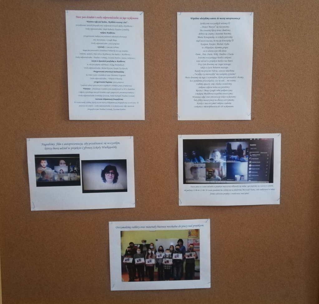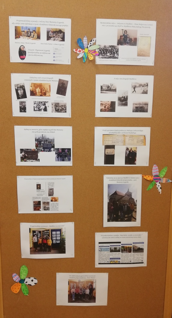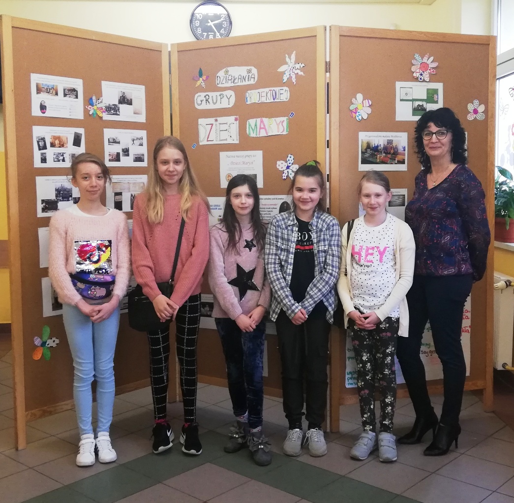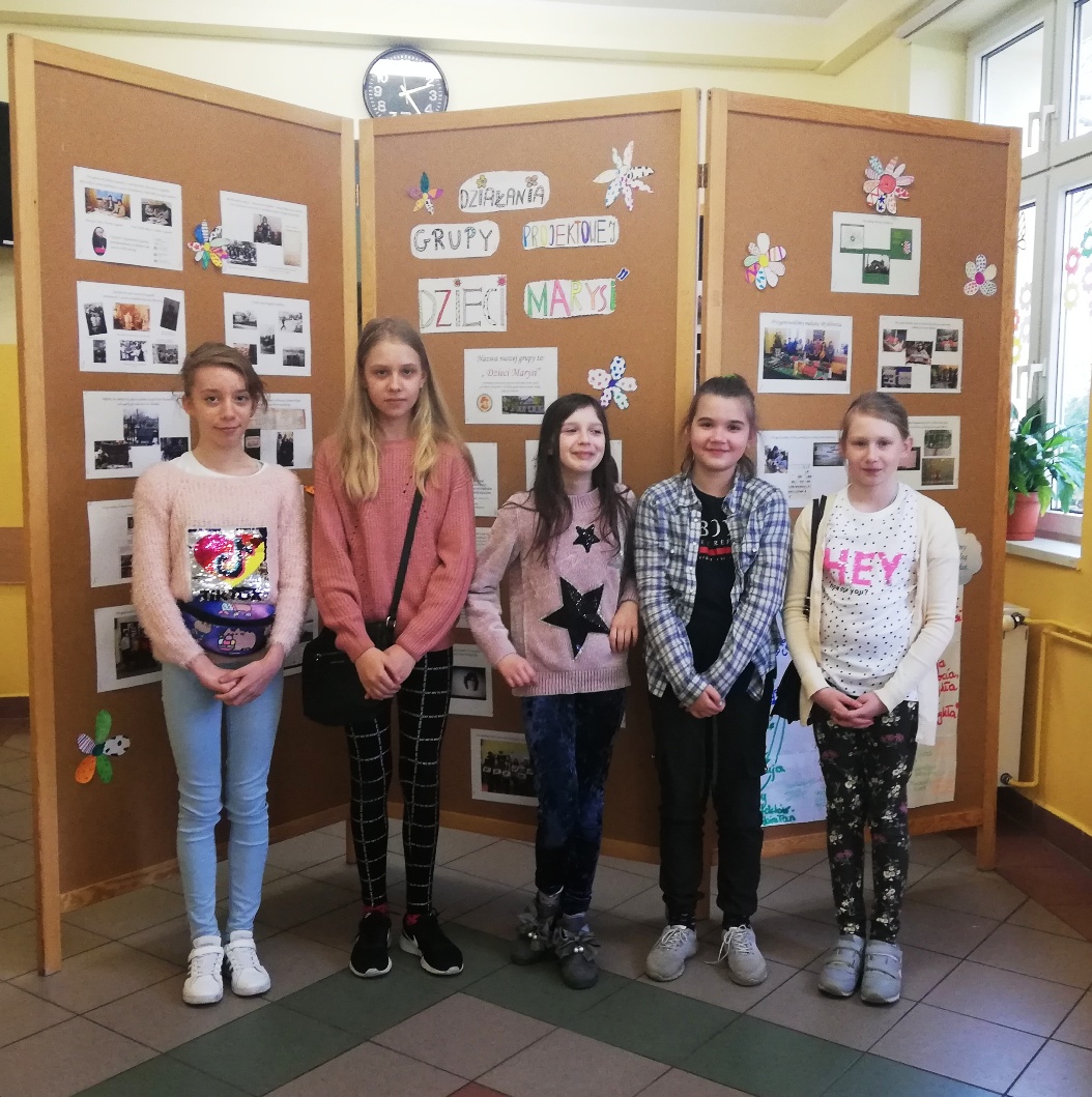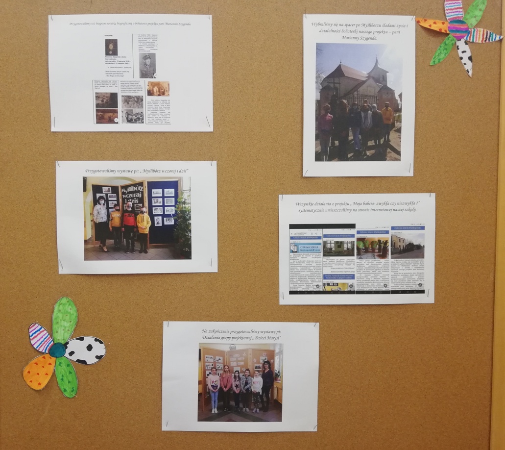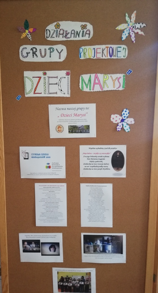 W piątek 30 kwietnia dziewczynki z grupy projektowej „ Dzieci Marysi” przyjechały do szkoły, aby przygotować wystawę na temat działań naszej grupy w ramach projektu Cyfrowa Szkoła Wielkopolska. To już ostatni punkt z planu, który sobie założyliśmy. Uwzględniliśmy w niej informacje oraz zdjęcia ilustrujące wszystkie nasze działania, a było ich sporo: • Zapoznaliśmy się z działaniem Cyfrowej Szkoły Wielkopolski i dowiedzieliśmy się czym jest Cyfrowa Dziecięca Encyklopedia Wielkopolan; • Wybraliśmy nazwę „ Dzieci Marysi” dla naszej grupy , ponieważ patronką naszej szkoły jest Maria Konopnicka i chcieliśmy godnie reprezentować szkołę ,jako jej uczniowie; • Wspólnie wybraliśmy tytuł dla projektu: „Moja babcia – zwykła czy niezwykła?”. Na jego bohaterkę została wybrana Pani Marianna Szygenda- lokalny społecznik, działaczka na rzecz rozwoju kultury na wsi- współzałożycielka teatru; działaczka na rzecz parafii Myślibórz; • Stworzyliśmy pan działań i wybraliśmy osoby odpowiedzialne za jego wykonanie; • Nagraliśmy film z autoprezentacją, aby przedstawić się wszystkim, którzy biorą udział w projekcie Cyfrowej Szkoły Wielkopolski; • Wspólnie ułożyliśmy wiersz do naszej autoprezentacji; • Niestety nasze prace w czasie udziału w projekcie najczęściej odbywały się online, spotykaliśmy się zawsze w piątek od godziny 13:00 do 15:00. W czasie pandemii łączyliśmy się na platformie Microsoft Teams, żeby realizować w takiej formie założenia projektu i zrealizować nasz plan! • Przygotowaliśmy makietę Myśliborza- wszystkie budynki, które potrzebowaliśmy do jej przygotowania zrobiliśmy w swoich domach; • Poznaliśmy historię Myśliborza; • Przeprowadziliśmy wywiady z rodziną Pani Marianny Szygenda: Państwem I. M Szygenda oraz E. Piętka, aby zdobyć cenne informacje o życiu i działalności bohaterki naszego projektu. Z ks.prał. Zbigniewem Szygendą kontaktowaliśmy się telefonicznie i pocztą elektroniczną; • Rozmawialiśmy także z Sołtysem wsi Myślibórz – Panią Małgorzatą Czerniak oraz z przewodniczącą KGW w Myśliborzu-Panią Jadwigą Maciejewską; • pozyskaliśmy wiele fotografii związanych z działalnością pani Marianny oraz stare fotografie Myśliborza; • Dzięki uprzejmości księdza proboszcza Andrzeja Czubaszewskiego pozyskaliśmy dane z archiwum Parafialnego; • Byliśmy na cmentarzu, gdzie znajduje się grób Pani Marianny oraz groby jej rodziców oraz bliskich; • Przygotowaliśmy drzewo genealogiczne rodziny Pani Marianny; • Opracowaliśmy biogram pani Marianny Szygenda; • Korzystając z aplikacji komputerowej lub w formie tradycyjnej, każdy z nas przygotował drzewo genealogiczne swojej rodziny; • Otrzymaliśmy tablety oraz materiały biurowe niezbędne do pracy nad projektem; • Wybraliśmy się na spacer po Myśliborzu śladami życia i działalności bohaterki naszego projektu – pani Marianny Szygenda; • Przygotowaliśmy wystawę pt: „ Myślibórz wczoraj i dziś” • Na zakończenie przygotowaliśmy wystawę pt: Działania grupy projektowej „ Dzieci Marysi”; • Wszystkie działania z projektu „ Moja babcia- zwykła czy niezwykła ?” systematycznie umieszczaliśmy na stronie internetowej naszej szkoły.
