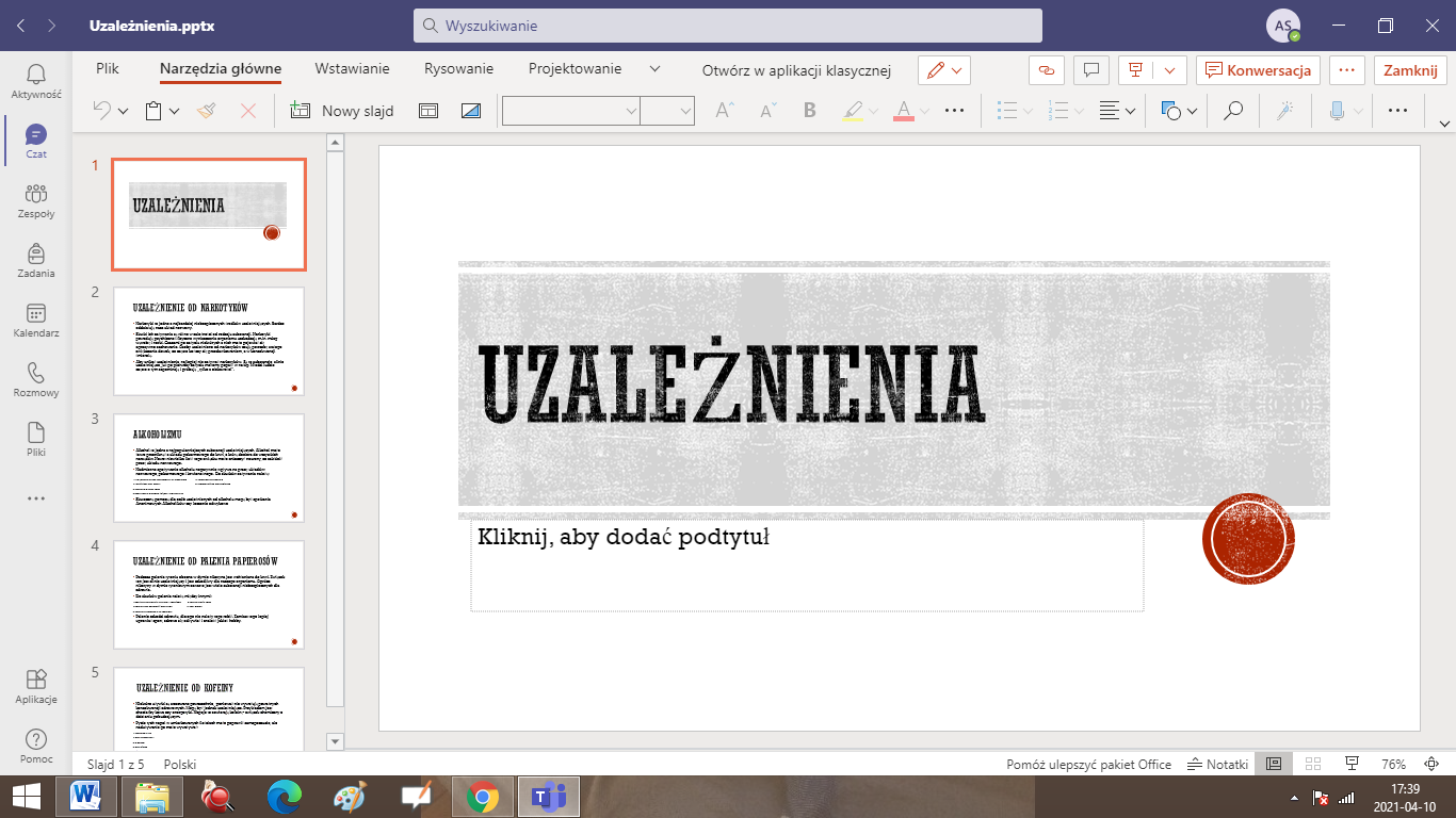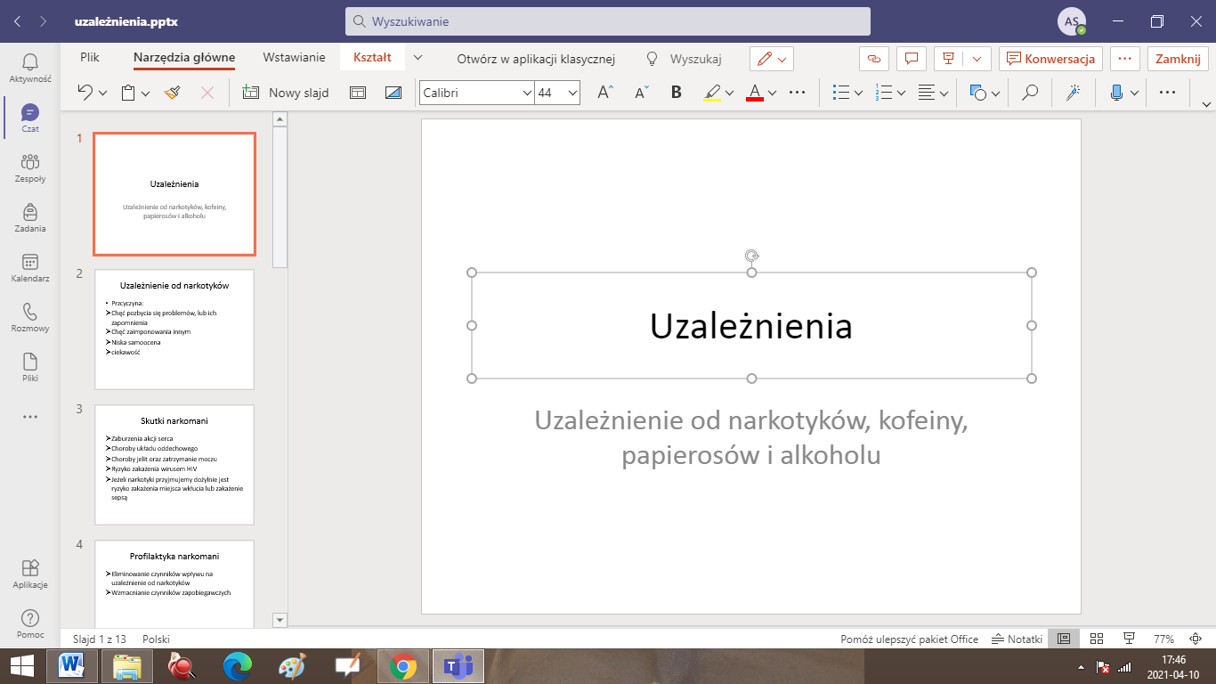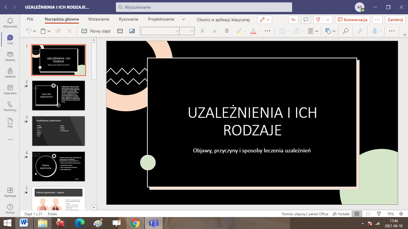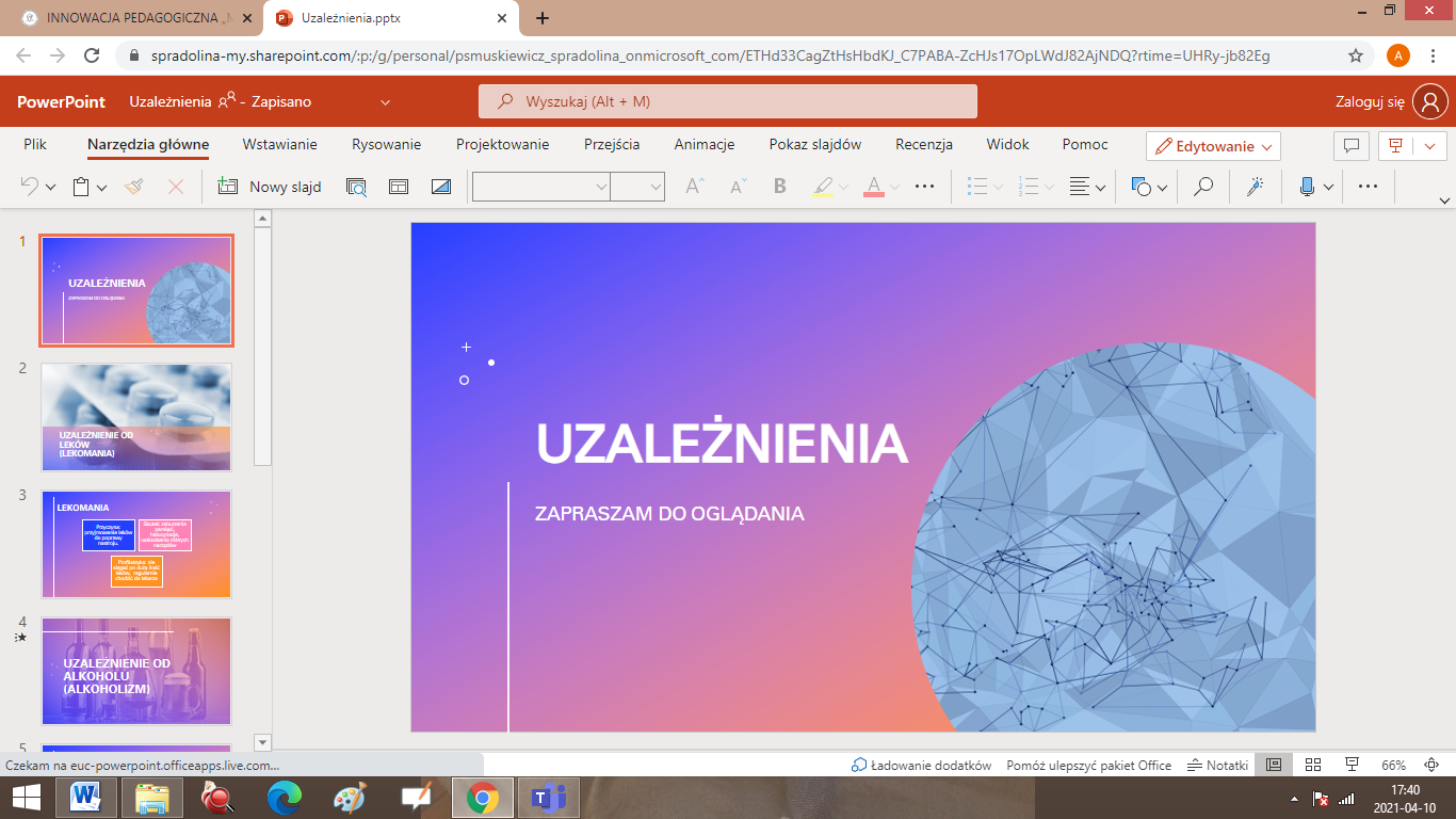 Uzależnienie to choroba układu nerwowego. Stanowi stan zaburzenia zdrowia psychicznego i fizycznego, który charakteryzuje się okresowym lub stałym przymusem wykonywania określonej czynności lub zażywania psychoaktywnej substancji chemicznej. W ramach innowacji pedagogicznej „Na tropach biologii” realizowanej przez Agnieszkę Sołtysiak, uczniowie klas VII ze Szkoły Podstawowej im. Marii Konopnickiej w Radolinie na lekcjach biologii, zaprojektowali oraz wykonali plakaty i prezentacje multimedialne dotyczące uzależnień. Szczególną uwagę zwrócili na przyczyny, skutki oraz profilaktykę wspomnianej choroby układu nerwowego. Takie działania pomogły uświadomić uczniom, że ważne jest, aby być świadomym tego, jak bardzo wszelkie nałogi są niebezpieczne. Na zakończenie warto dodać, iż w profilaktyce uzależnień pomocne może być rozwijanie swoich pasji i zainteresowań oraz budowanie pozytywnych relacji z bliskimi.