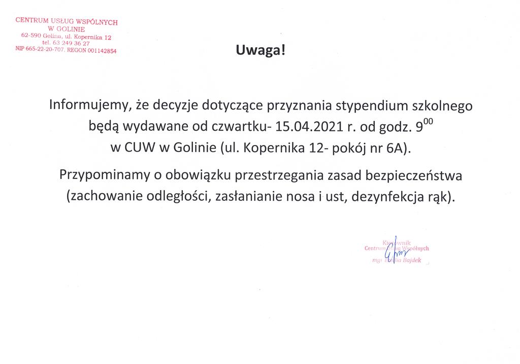 Centrum Usług Wspólnych w Golinie przekazuje wiadomość o wypłacaniu stypendium szkolnego. Szczegółowe informacje dostępne są na załączonym zdjęciu.