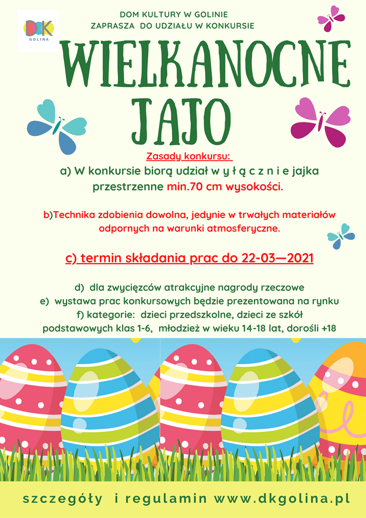 Wszystkie informacje o konkursie, regulamin oraz karta zgłoszeniowa znajdują się na stronie organizatora https://dkgolina.pl/n,wielkanocne-jajo