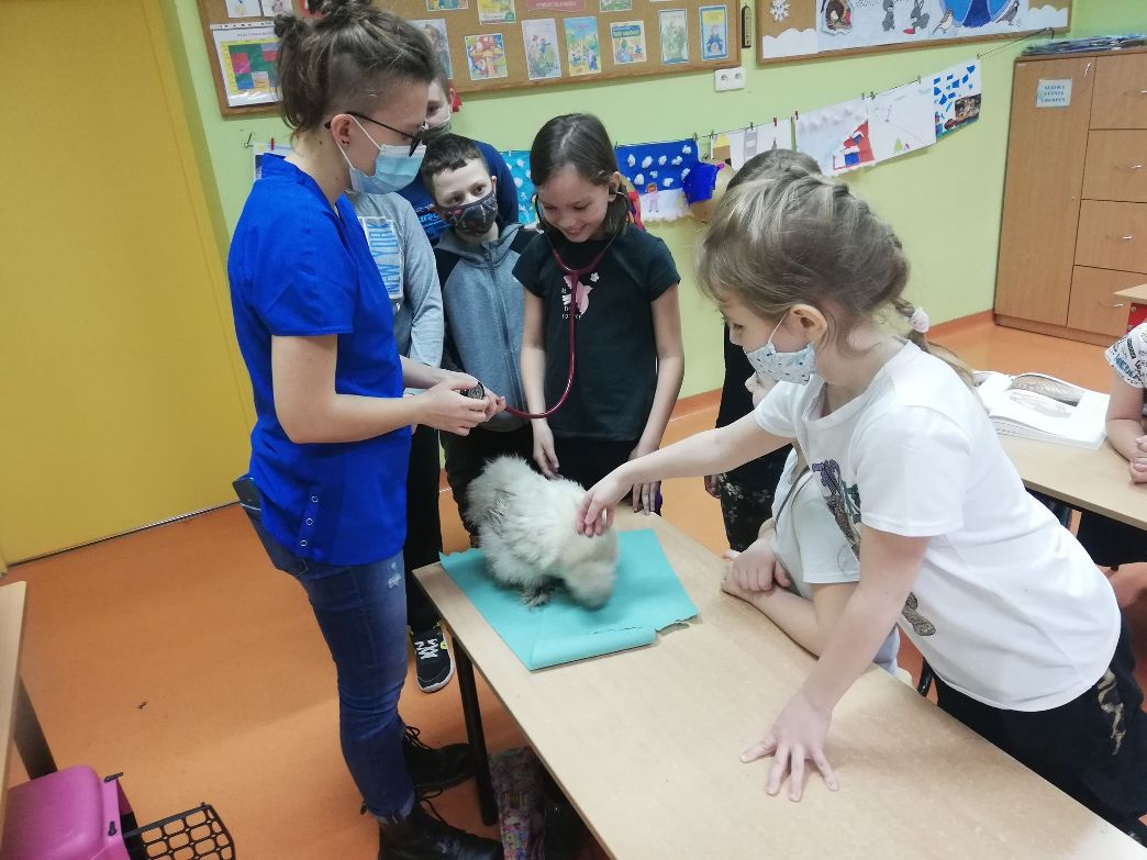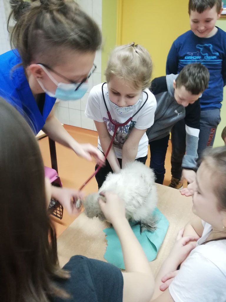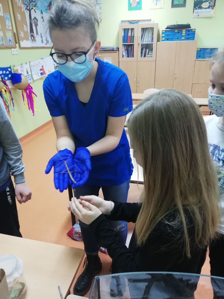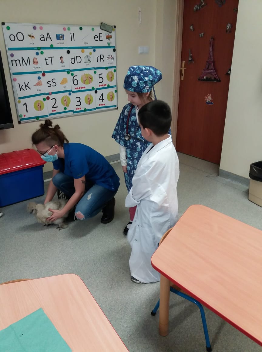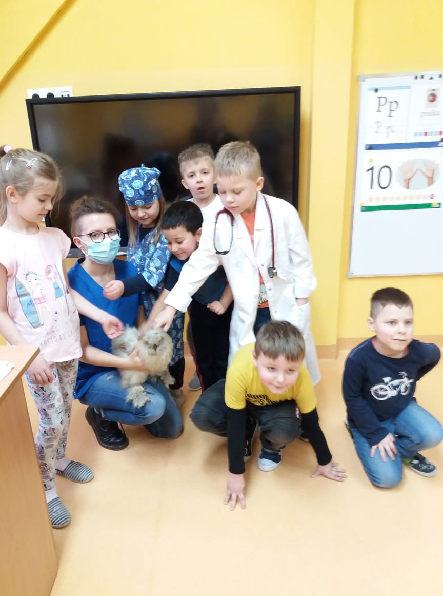 Uczniowie klas I-III i przedszkoli mieli okazję zobaczyć patyczaki. O tym, w jaki sposób hodować patyczaki i zajmować się nimi opowiedziała Pani Agnieszka - studentka medycyny weterynaryjnej. Bo Zippi – to patyczak, ulubieniec Tiga, jednego z bohaterów opowiadań w programie, który zamieszkał w naszej szkole. Dodatkowo uczniowie dowiedzieli się jak dbać o zwierzęta domowe: psy, koty, a także mogli zbadać kurę, usłyszeć jak bije jej serce. Przymierzali również fartuch weterynaryjny i poznali jak działa stetoskop.