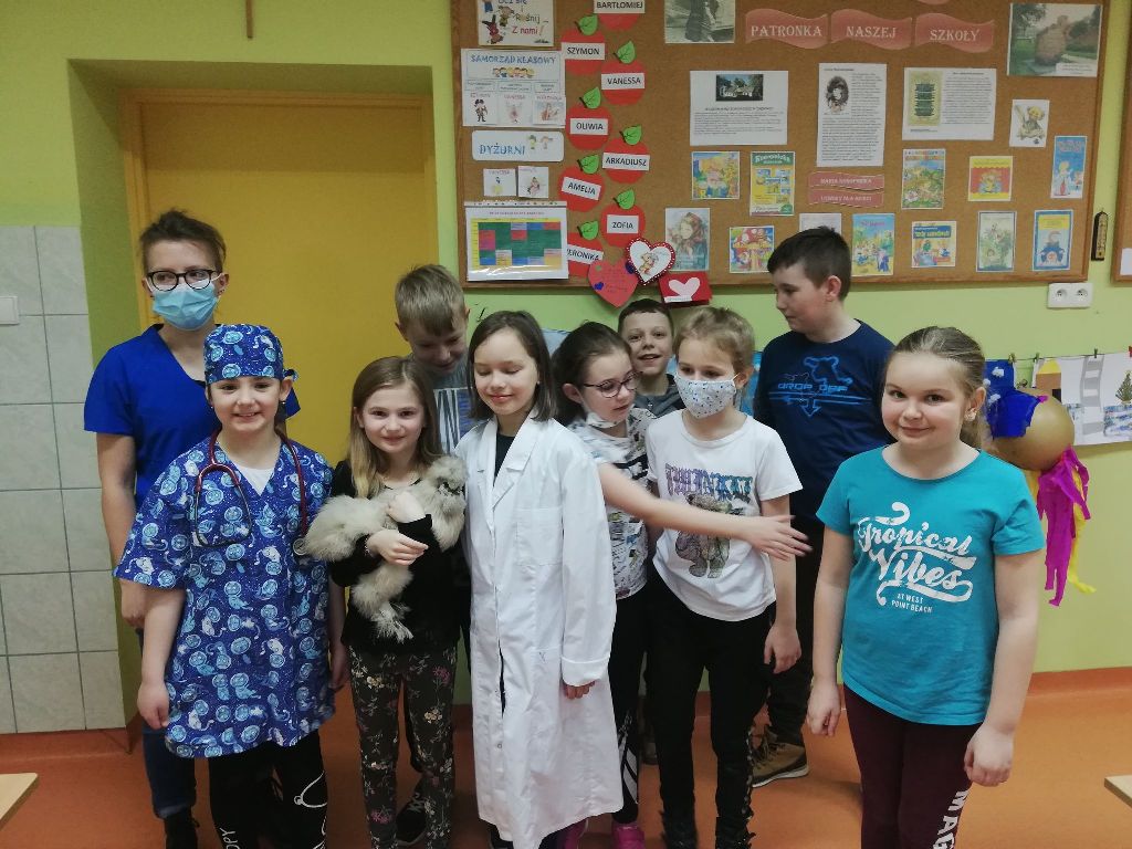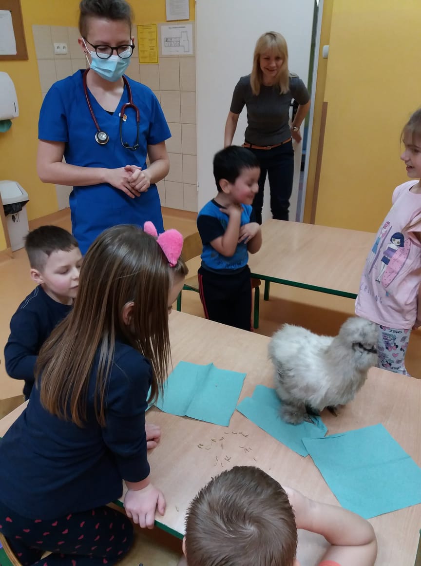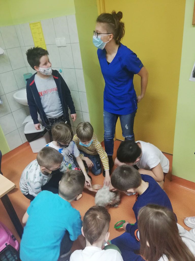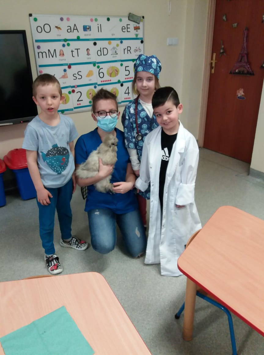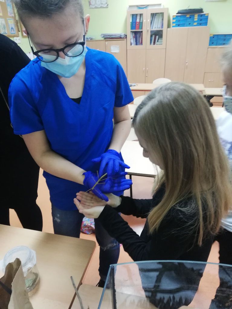 Uczniowie klas I-III i przedszkoli mieli okazję zobaczyć patyczaki. O tym, w jaki sposób hodować patyczaki i zajmować się nimi opowiedziała Pani Agnieszka - studentka medycyny weterynaryjnej. Bo Zippi – to patyczak, ulubieniec Tiga, jednego z bohaterów opowiadań w programie, który zamieszkał w naszej szkole. Dodatkowo uczniowie dowiedzieli się jak dbać o zwierzęta domowe: psy, koty, a także mogli zbadać kurę, usłyszeć jak bije jej serce. Przymierzali również fartuch weterynaryjny i poznali jak działa stetoskop.