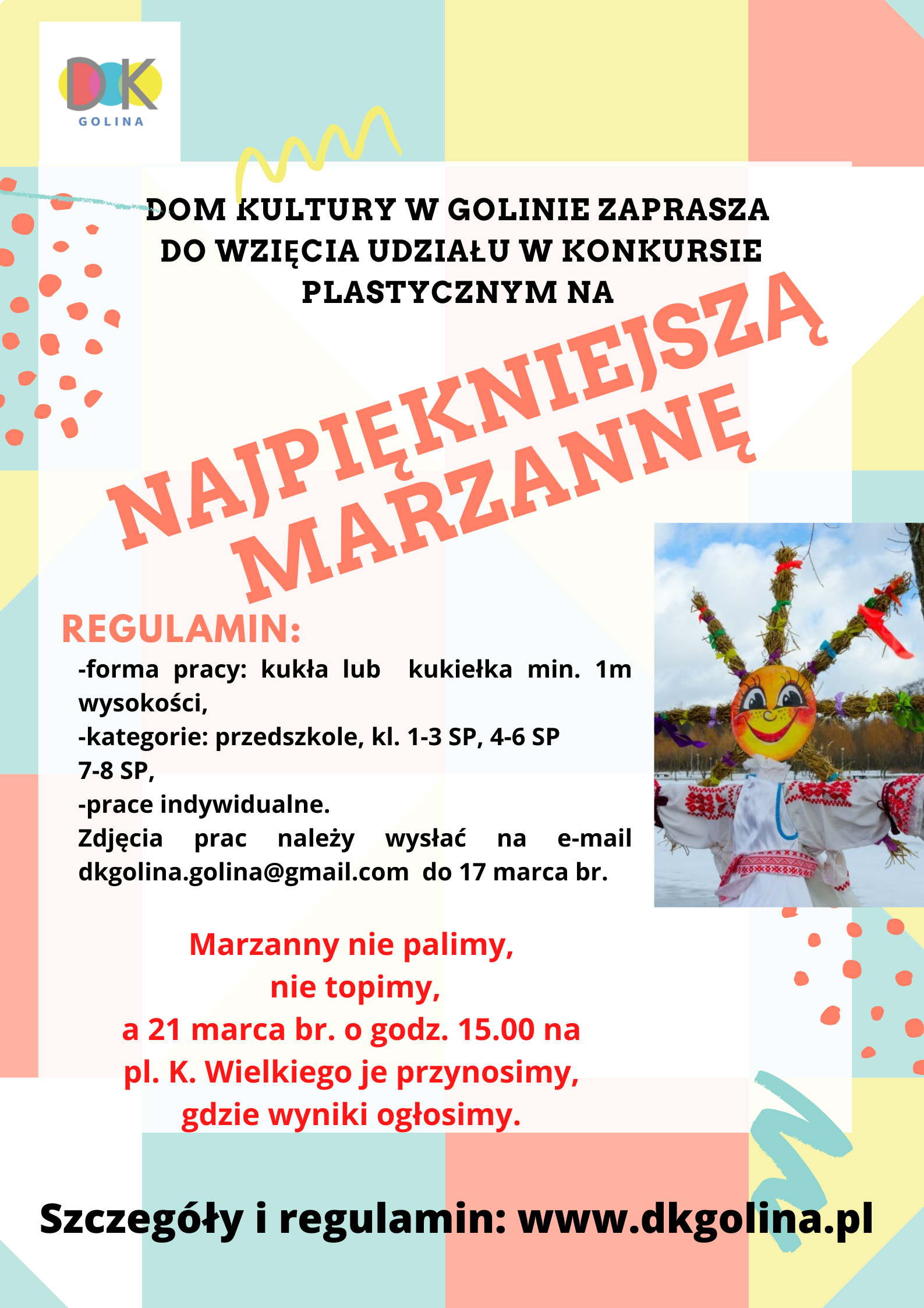Dom Kultury w Golinie zaprasza przedszkolaków oraz uczniów klas I-VIII do udziału w konkursie! Wszystkie najważniejsze informacje znajdują się na załączonym plakacie, a karta zgłoszeniowa oraz regulamin konkursu dostępne na stronie internetowej Domu Kultury https://dkgolina.pl/n,konkurs-plastyczny-marzanna