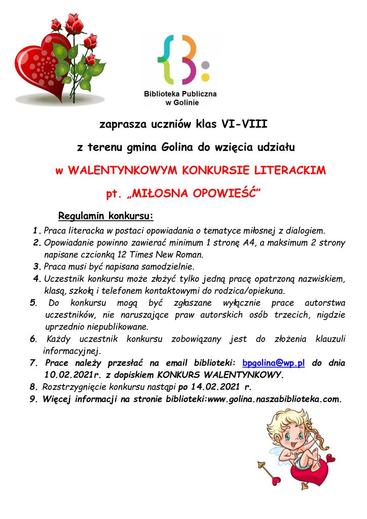 Biblioteka Publiczna w Golinie zaprasza wszystkich uczniów klas VI-VIII z terenu gminy Golina do udziału w konkursie walentynkowym pt. "Miłosna opowieść". Na naszej stronie w zakładce Dokumenty znajdują się regulamin konkursu oraz klauzula informacyjna. Więcej informacji dostępnych jest na stronie internetowej Biblioteki oraz na załączonym plakacie.