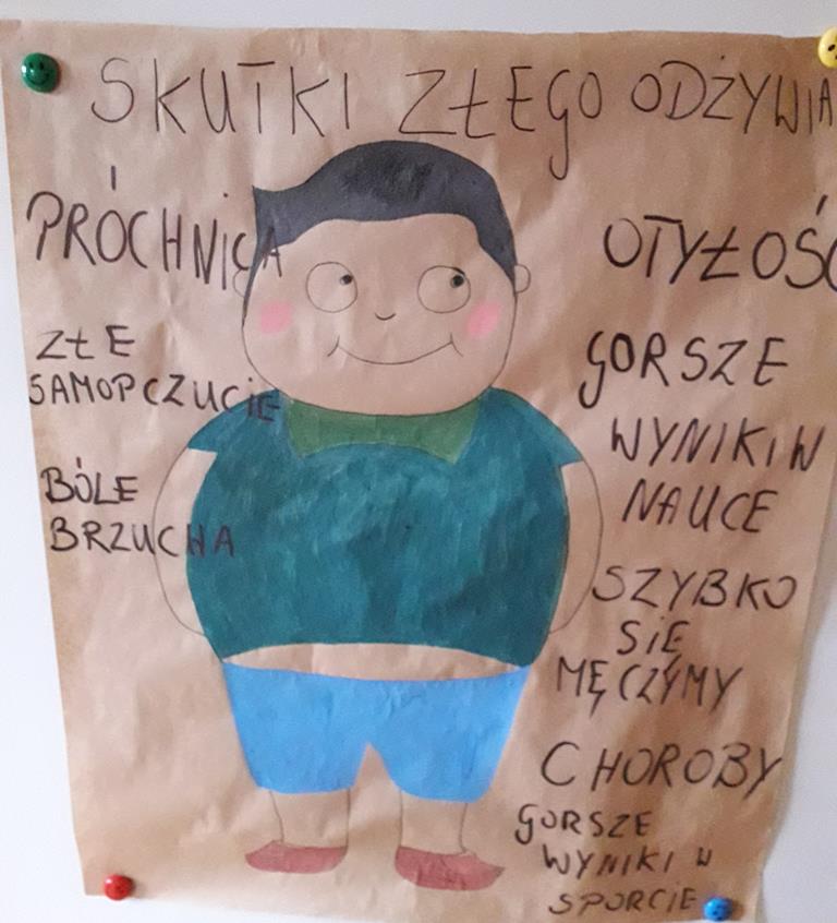 W ramach dzielenia się wiedzą i dokonaniami dzieci ze społecznością szkolną, została wykonana wystawa prac. Owe prace plastyczne oraz plakaty powstały podczas prowadzonych zajęć. W trakcie zebrania online rodzice zostali zapoznani z poszczególnymi zadaniami i efektami pracy dzieci. Rodzice otrzymali również do zapoznania się tekst pt. „Kolorowy talerz, czyli garść informacji o warzywach i owocach” mgr inż. Joanna Jaczewska-Schuetz, Instytut Żywności i Żywienia.