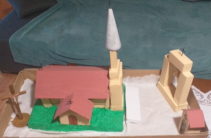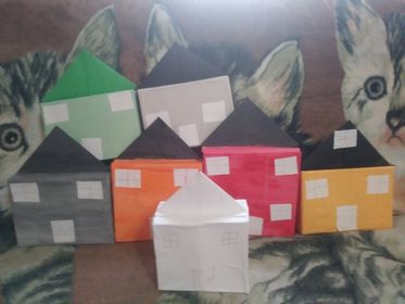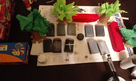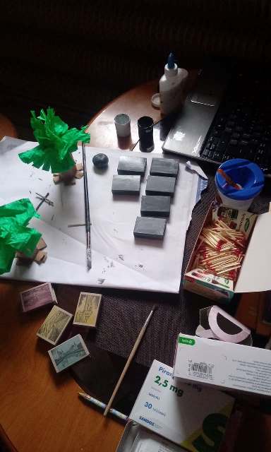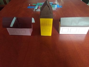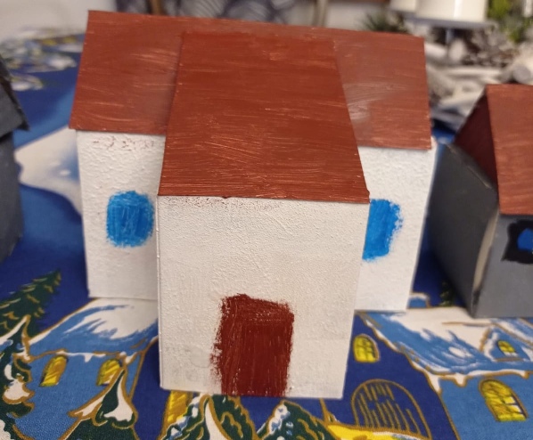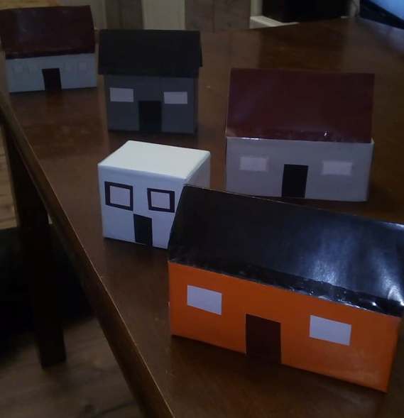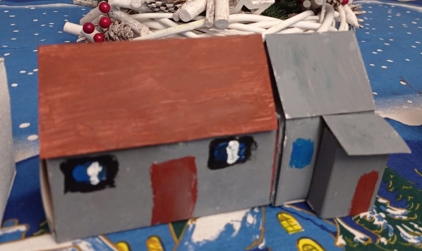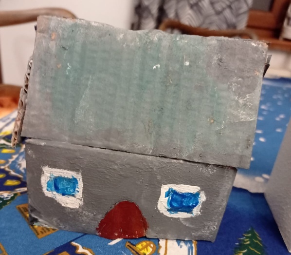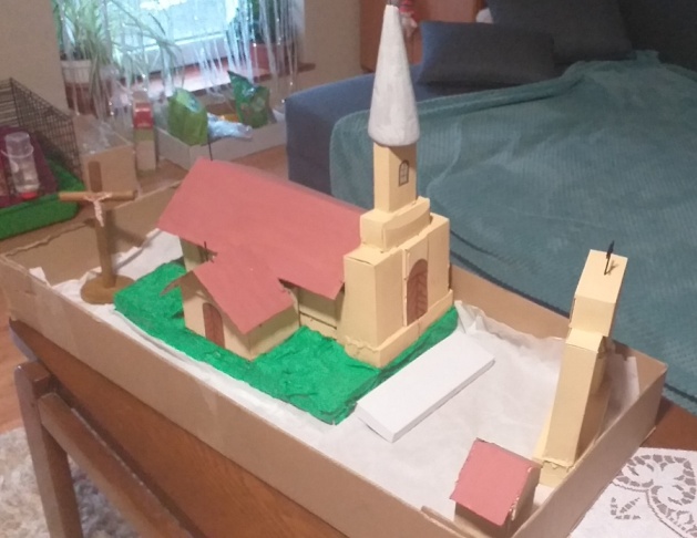 Wykorzystując także mapę Google oraz własne obserwacje, rozpoczęliśmy naszą pracę od przygotowania domów i innych charakterystycznych elementów Myśliborza, potrzebnych do stworzenia makiety miejscowości. Przez cały grudzień podczas zajęć online robiliśmy budynki z pudełek i innych materiałów przeznaczonych do recyklingu, starając się odwzorować ich rzeczywisty wygląd.