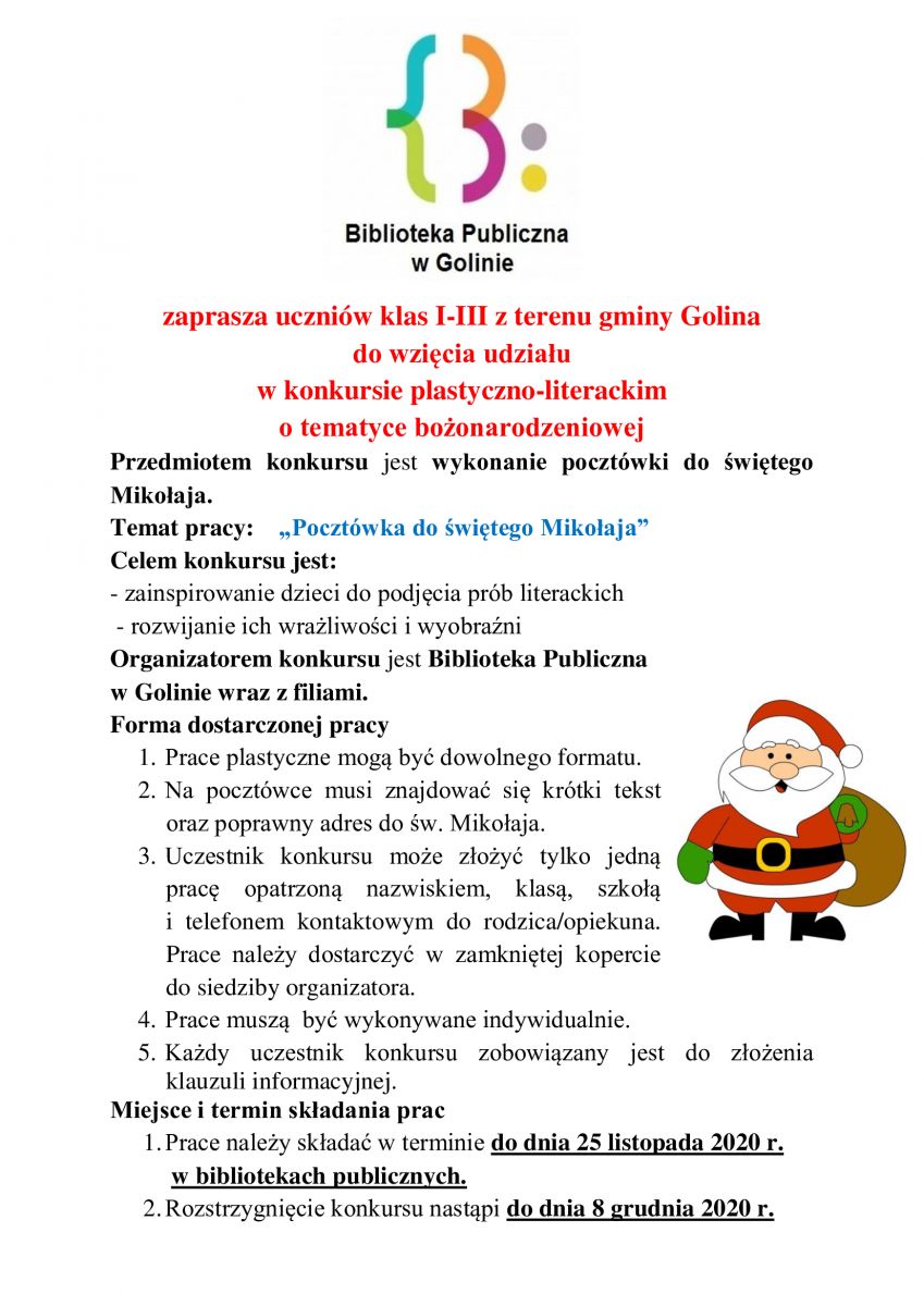 Biblioteka Publiczna w Golinie zaprasza uczniów klas I-III z terenu gminy Golina do wzięcia udziału w konkursie plastyczno-literackim o tematyce bożonarodzeniowej. Szczegóły konkursu znajdują się na załączonym plakacie.