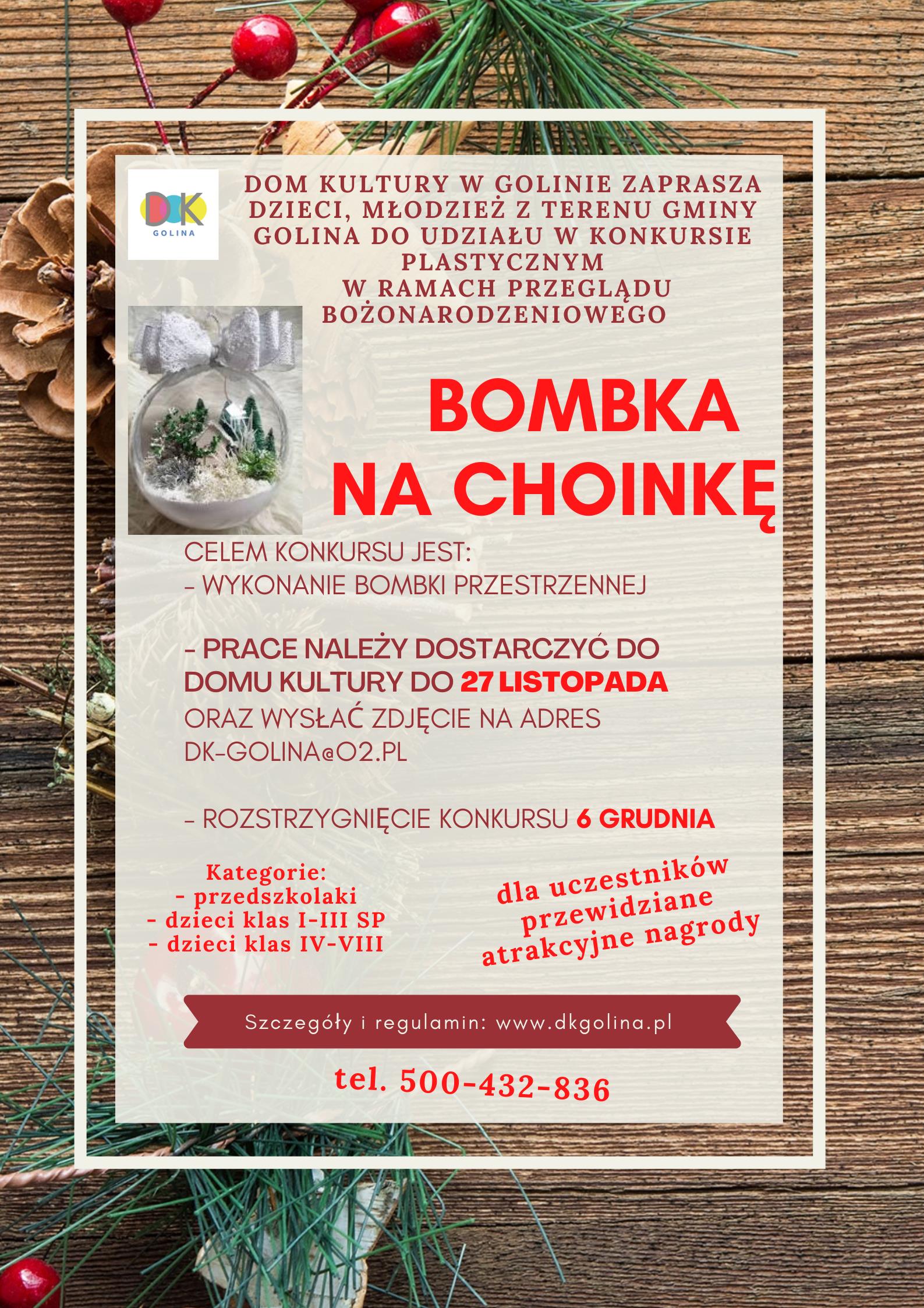 Dom Kultury w Golinie zaprasza wszystkie dzieci oraz młodzież z terenu Gminy Golina do udziału w konkursie plastycznym "Bombka na choinkę". Szczegóły konkursu znajdują się na załączonym plakacie oraz na stronie internetowej Domu Kultury.