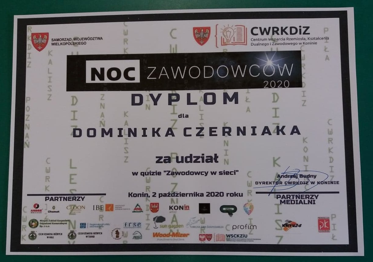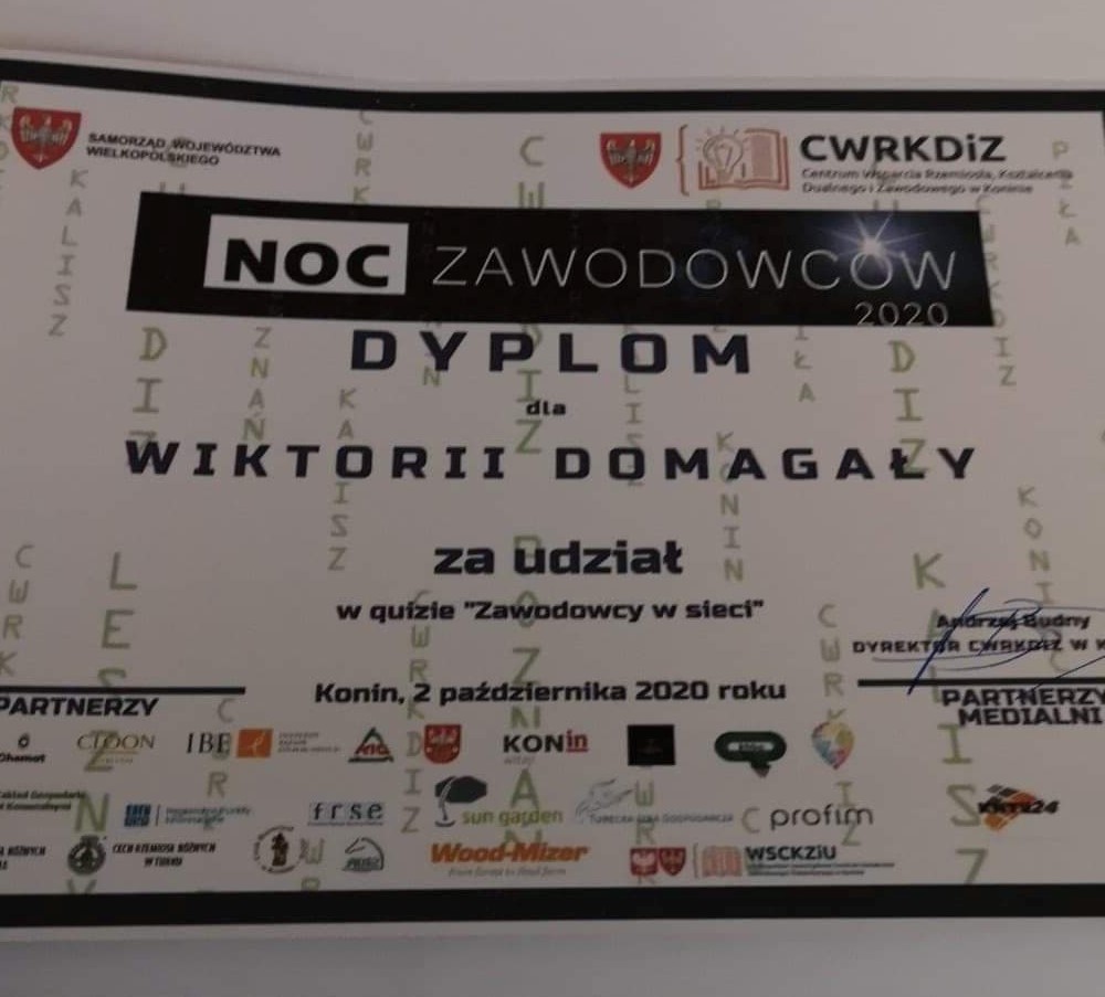 2 października 2020 roku nasi uczniowie z klasy VII i VIII uczestniczyli w NOCY ZAWODOWCÓW, której organizatorem było Centrum Wsparcia Rzemiosła Kształcenia Dualnego i Zawodowego w Koninie. Hasło tegorocznej imprezy, która odbywała się online brzmiało: „Wielkopolska w sieci zawodów”. Honorowy patronat nad wydarzeniem objął Marszałek Województwa Wielkopolskiego Marek Woźniak, natomiast celem Nocy Zawodowców była popularyzacja kształcenia dualnego i zawodowego wśród uczniów szkół podstawowych, a także pogłębienie wiedzy na temat różnych zawodów. Program wydarzenia obejmował m.in.: konkursy, quiz, prezentacje zawodów i szans zatrudnienia w regionie poprzez przedsiębiorstwa i szkoły kształcące w zawodach, prezentacja zawodów przyszłości i szlakiem ginących zawodów - rzemieślnicy w regionie, prezentacja programu Erasmus+, doradztwo zawodowe i wiele atrakcji z nagrodami.
