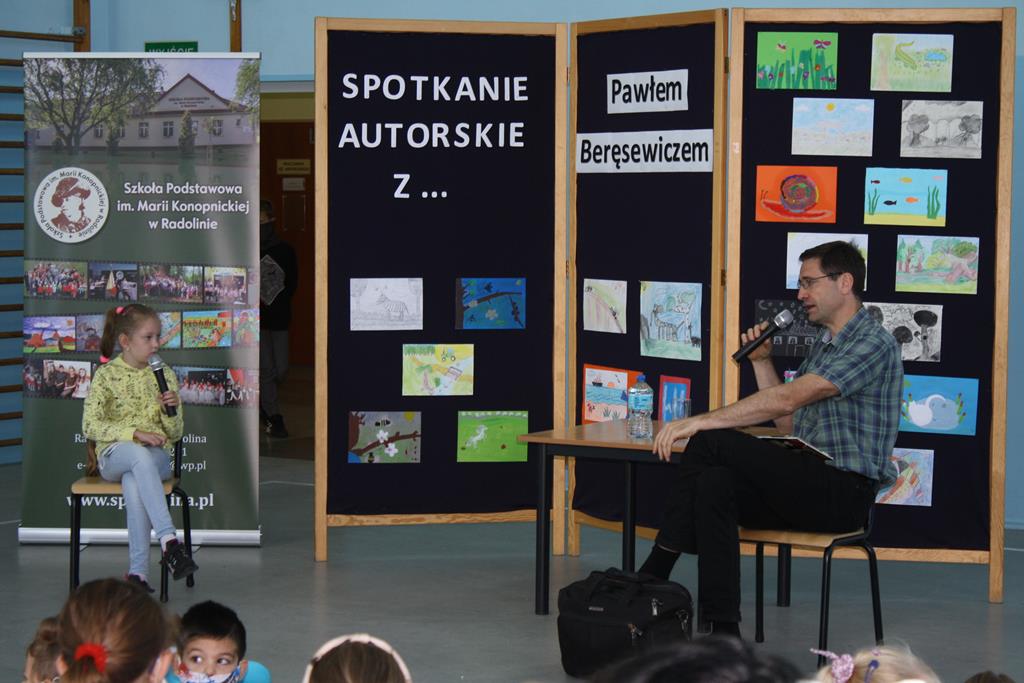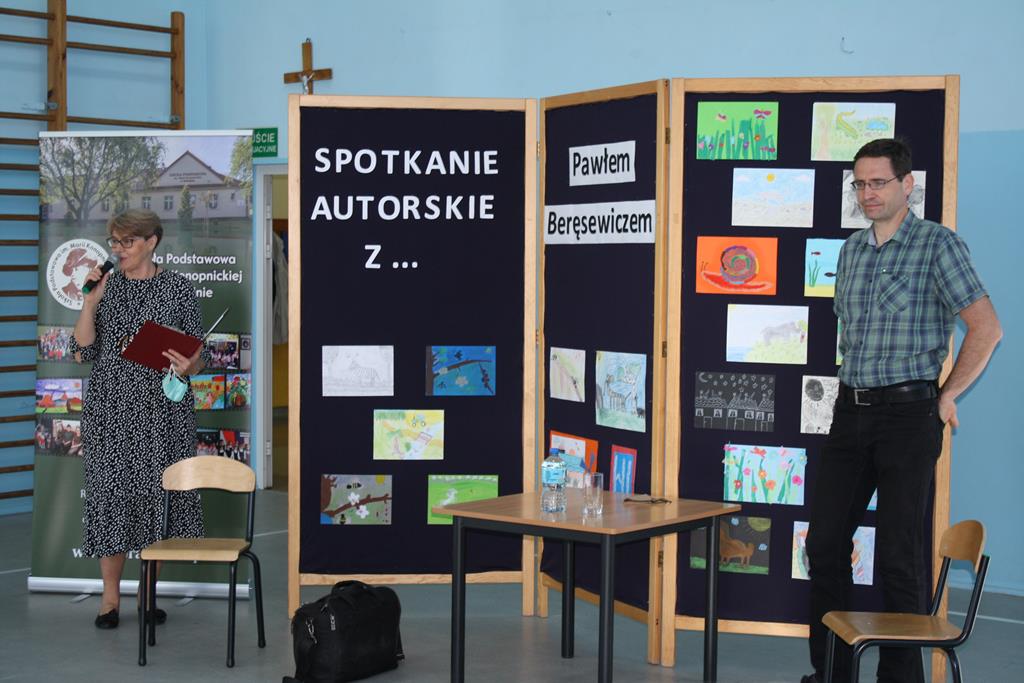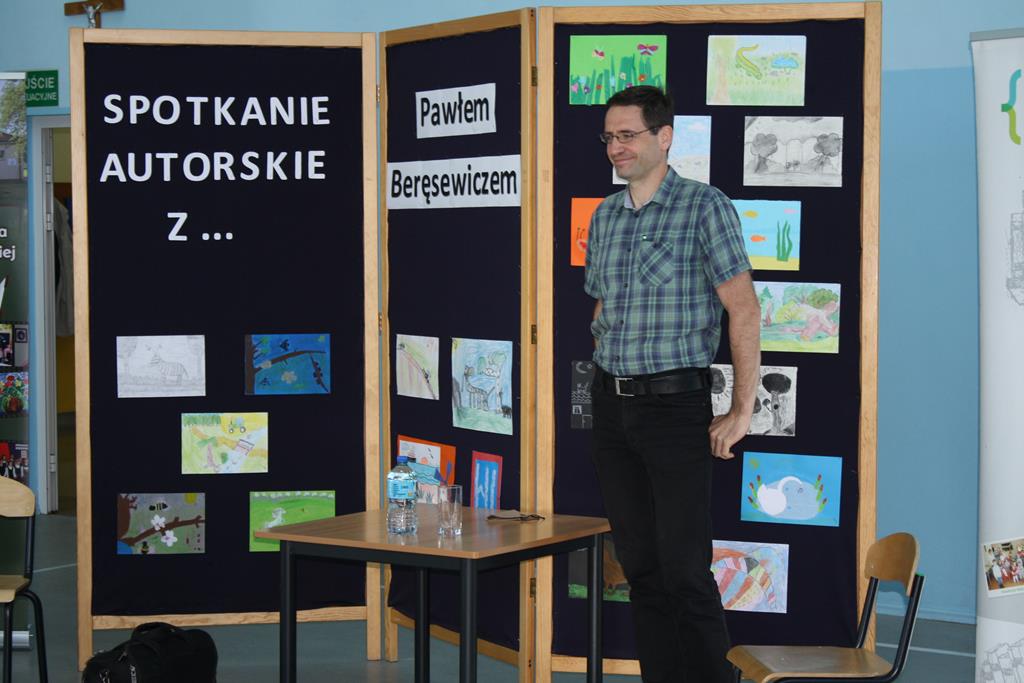 Paweł Beręsewicz jest autorem licznych powieści, opowiadań i wierszy dla dzieci oraz laureatem wielu nagród literackich. Zanim przedstawił się jako pisarz, wspomniał, że wcześniej był „najgroźniejszym” nauczycielem języka angielskiego, ale też tłumaczem. Jest współautorem słowników angielsko-polskich i polsko-angielskich. Podczas spotkania wybrani uczniowie mieli przyjemność osobiście pogawędzić z pisarzem, m.in. o książkach, o pierwszych miłościach, jak również o wspomnieniach wojennych. Autor prezentował swoje książki, krótko je omawiając. W pogadankach z autorem brali udział: Nadia z klasy II, Efe i Nikodem z klasy I. Uczniowie wcześniej zapoznali się z opowiadaniami autora i wykonali ilustracje, które można było zobaczyć na korytarzu szkolnym. Po spotkaniu autor rozdawała autografy do wcześniej zakupionych książek.