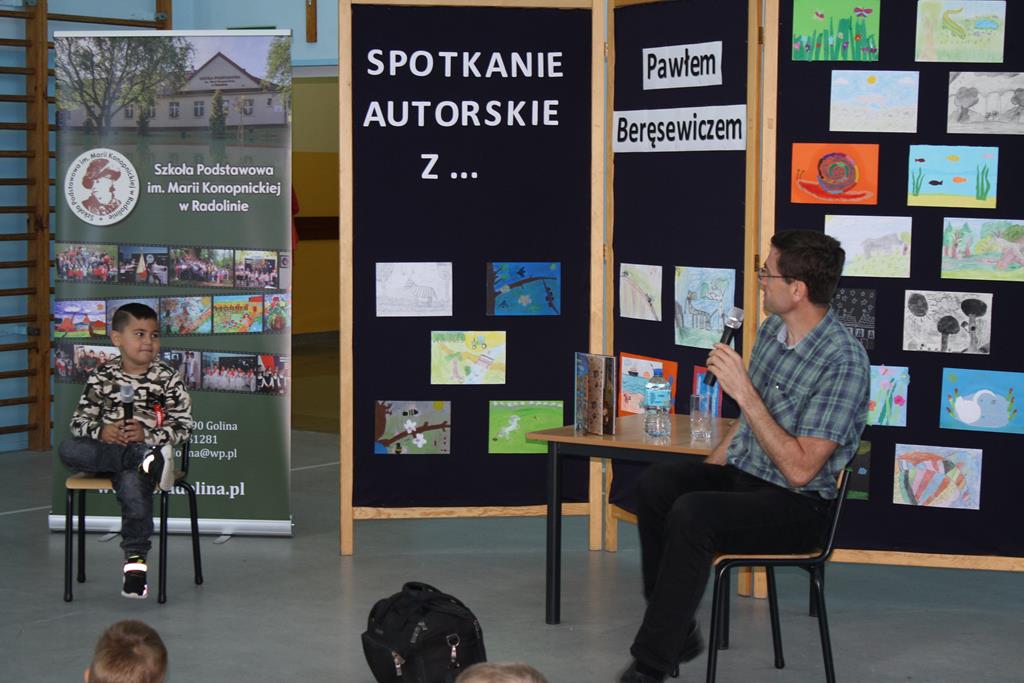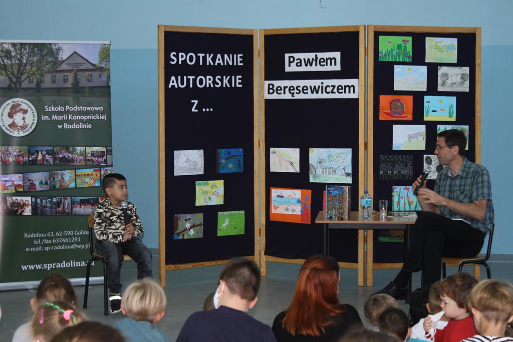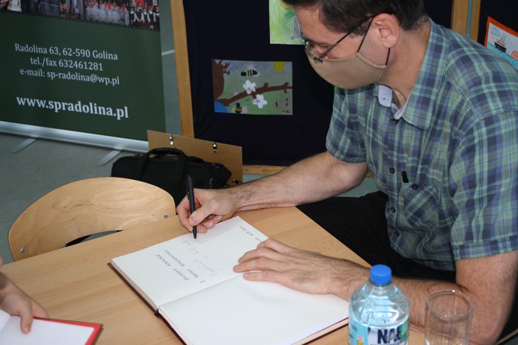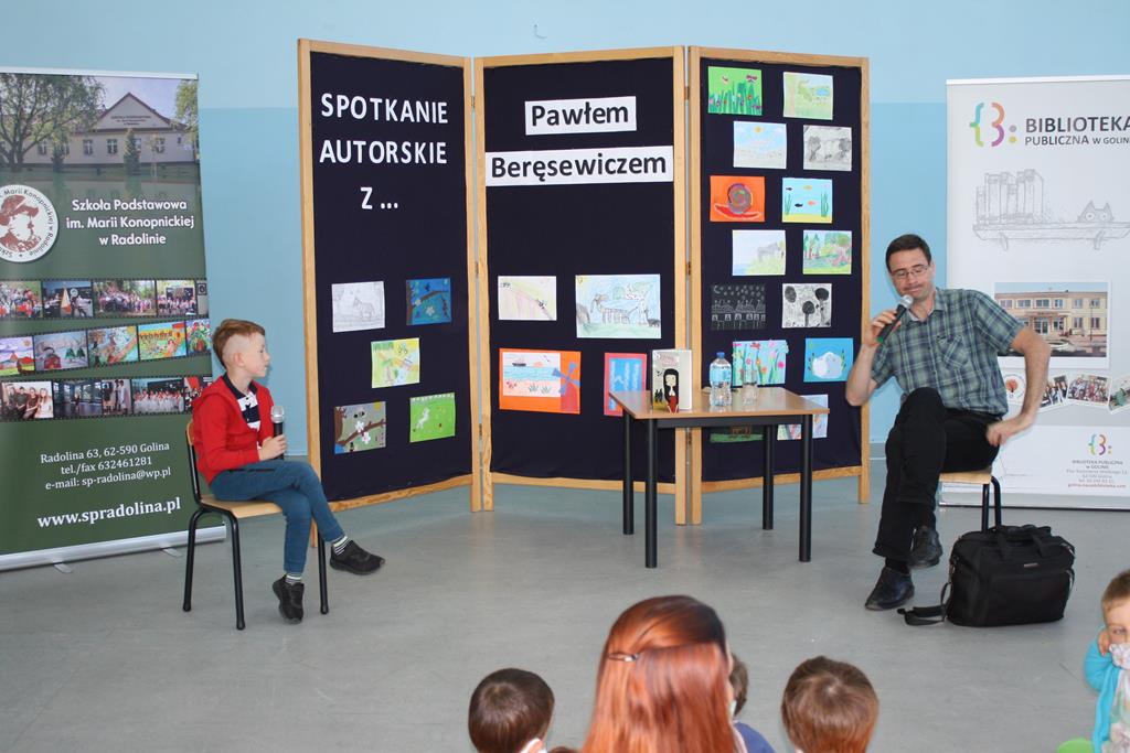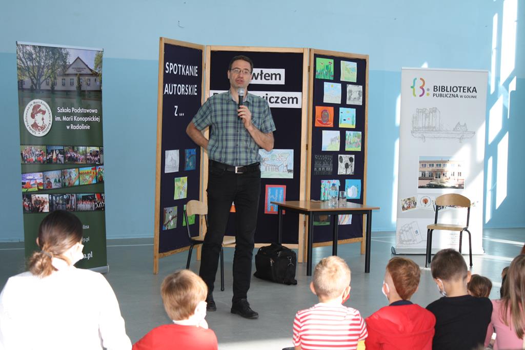 Bibliotek Publiczna w Golinie zaprosiła cenionego i lubianego autora książek dla dzieci i młodzieży Pawła Beręsewicza na spotkanie autorskie, które odbyło się 18 września 2020 r. w Szkole Podstawowej im. Marii Konopnickiej w Radolinie.