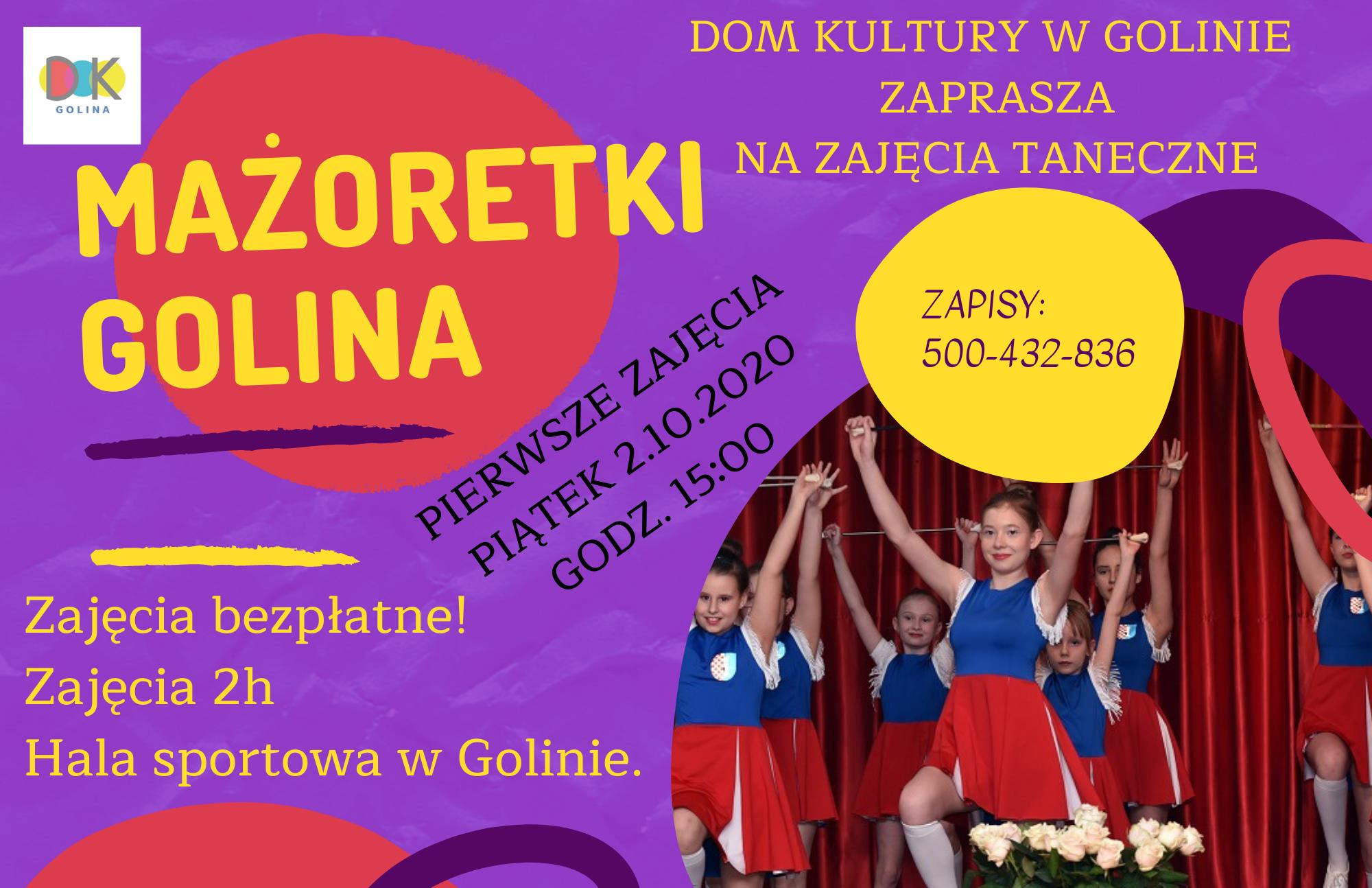 Dom Kultury w Golinie zaprasza dzieci, młodzież do udziału w zajęciach podczas roku szkolnego 2020/21: - zajęcia taneczne mażoretki, pierwsze zajęcia w piątek 2 października 2020 r., godz. 15:00 Hala Widowiskowo-Sportowa w Golinie, czas trwania zajęć 2h. Instruktor Justyna Tomczak. Szczegóły pod numerem telefonu 500-432-836 - nauka gry na instrumentach: keyboard, klarnet, saksofon, trąbka, perkusja /zajęcia indywidualne, bezpłatne/ Szczegóły pod numerem telefonu 785-547-334 - zajęcia wokalne / Szczegóły pod numerem telefonu 785-547-334