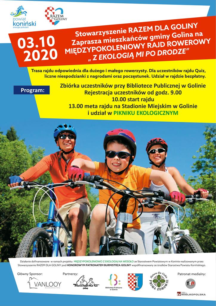 Stowarzyszenie "Razem dla Goliny" zaprasza wszystkich mieszkańców Gminy Golina na międzypokoleniowy rajd rowerowy pod hasłem "Z ekologia mi po drodze". Szczegóły znajdują się na załączonym plakacie.