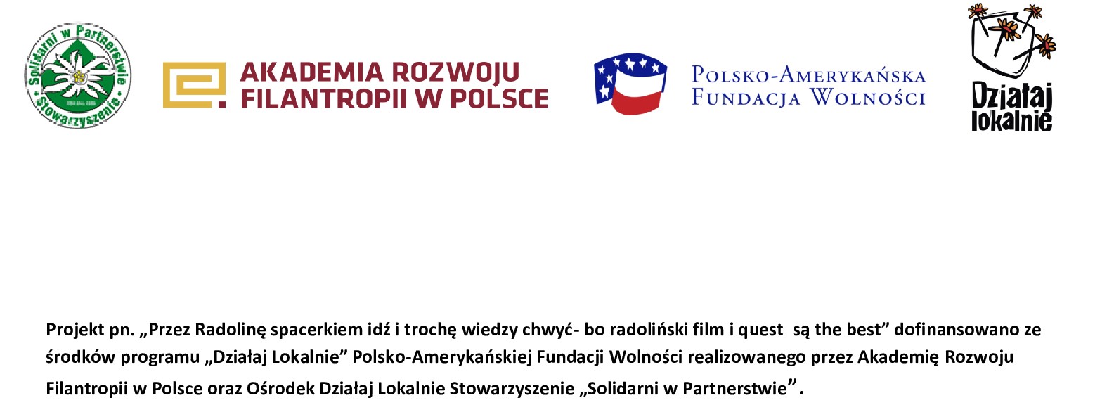 Chcieliśmy, by zwłaszcza młodzi ludzie mogli przekonać się osobiście o tym, że Radolina ma im wiele do zaoferowania. Stworzyliśmy więc dwa różne questy: jeden dla przedszkolaków, a drugi dla dzieci w wieku szkolnym i młodzieży, choć oczywiście mogą go przejść również dorośli. Wyprawy z zagadkami różnią się stopniem trudności oraz długością trasy. W maluchy zwiedzają wyłącznie park i mają do wykonania zadania dostosowane do ich procesów poznawczych. Natomiast starsi spacerują po parku oraz w najważniejszych miejscach we wsi. Muszą się wykazać wiedzą z matematyki, fonetyki języka polskiego, dobrą orientacją w terenie i umiejętnością czytania mapy oraz wiedzą z zakresu profilaktyki zdrowotnej w czasie pandemii. Od połowy września mieliśmy okazję się przekonać, w jakim stopniu nasze założenia sprawdzają się w rzeczywistości. W wyprawie wzięli udział uczniowie i nauczyciele ze Szkoły im. Marii Konopnickiej w Radolinie. Dzieci błyskawicznie zmieniły się w dociekliwych detektywów, szukających wskazówek i poszukujących rozwiązania , by w nagrodę przybić na broszurce kolorowy stempelek ukryty w urokliwej skrzyneczce. Przyjazna szata graficzna oraz zadania zmobilizowały uczestników do szukania informacji oraz patrzenia na wiejską - zdawałoby się dobrze sobie znaną - przestrzeń pod różnymi kątami. Wszyscy ukończyli trasę, zdobywając komplet stempli - w tym ten najważniejszy- herb rodu Radolinskich. Pieczątka nie była jedyną nagrodą, każdy otrzymał również m.in. okolicznościową przypinkę, smycz i słodką przekąskę. Obydwa questy są dostępne na stronie Wielkopolskiego Stowarzyszenia Odnowy Wsi „NASZA RADOLINA” (www.naszaradolina.pl). Projekt „Spacerkiem przez Radolinę idź i trochę wiedzy chwyć- bo radoliński film i quest są the best” jest innowacyjny na naszą małą skalę. Nasza wieś – jako jedyna w regionie – zyskała tak nowoczesne narzędzia promocji. Pierwsi w powiecie mamy film promocyjny oraz dwa questy zróżnicowane pod względem stopnia trudności. Inicjatywa „Spacerkiem przez Radolinę idź i trochę wiedzy chwyć- bo radoliński film i quest są the best” dofinansowano ze środków Programu „Działaj Lokalnie” Polsko- Amerykańskiej Fundacji Wolności realizowanego przez Akademię Rozwoju Filantropii w Polsce oraz Ośrodek Działaj Lokalnie Stowarzyszenie „Solidarni w Partnerstwie”.