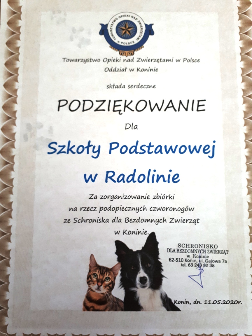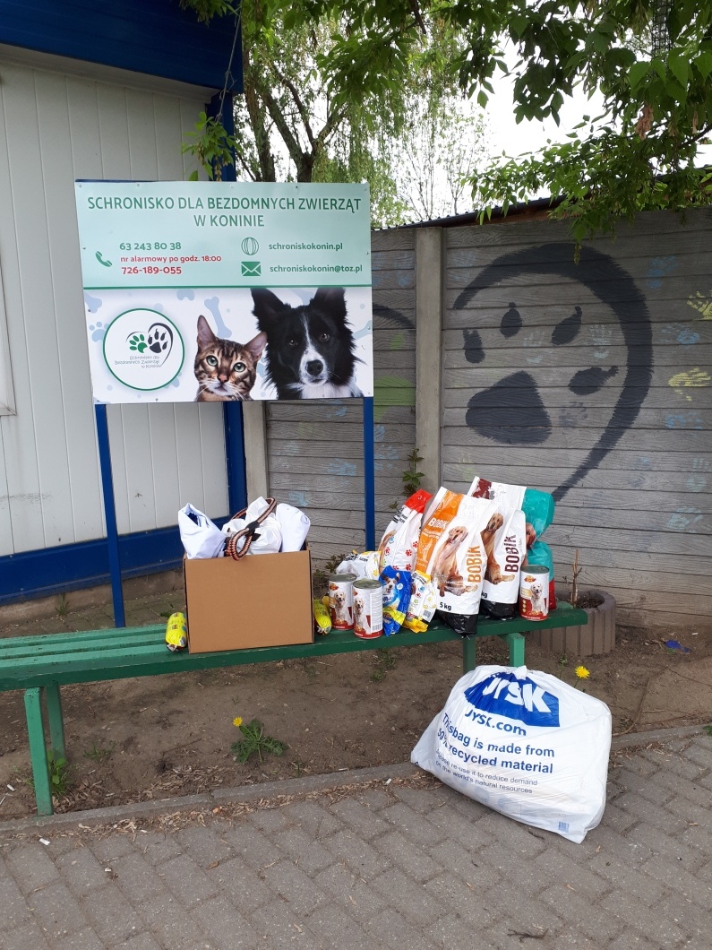 Klasa 8 przez całe półrocze zbierała karmę dla zwierząt w Schronisku dla Bezdomnych Zwierząt w Koninie. Niestety, całą zbiórkę pokrzyżowała nam sytuacja związana z koronawirusem. Zdecydowaliśmy, że nie będziemy już czekać abyśmy całą klasą mogli odwiedzić schronisko. Dlatego zebrane karmy, koce, smycze i plandeki zostały zawiezione przez p. Martę Kołodziejczak do Schroniska na ul. Gajową w Koninie. Liczymy, że już niedługo będziemy mogli wrócić do szkoły i zorganizować kolejne zbiórki.