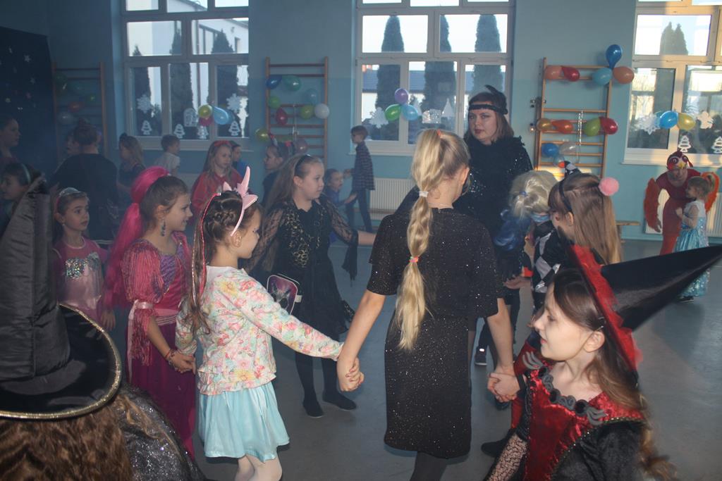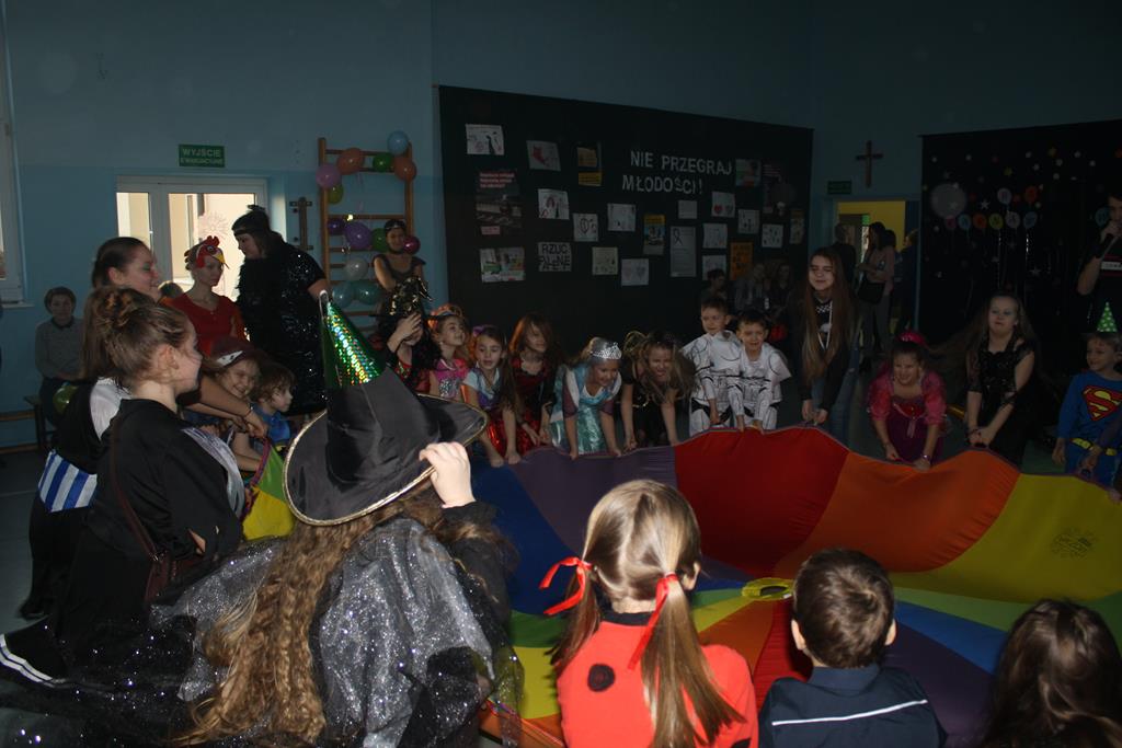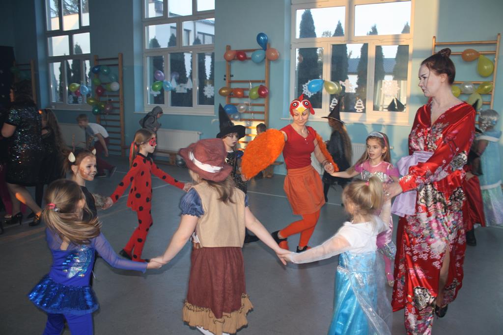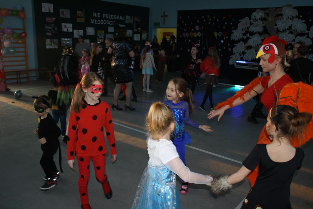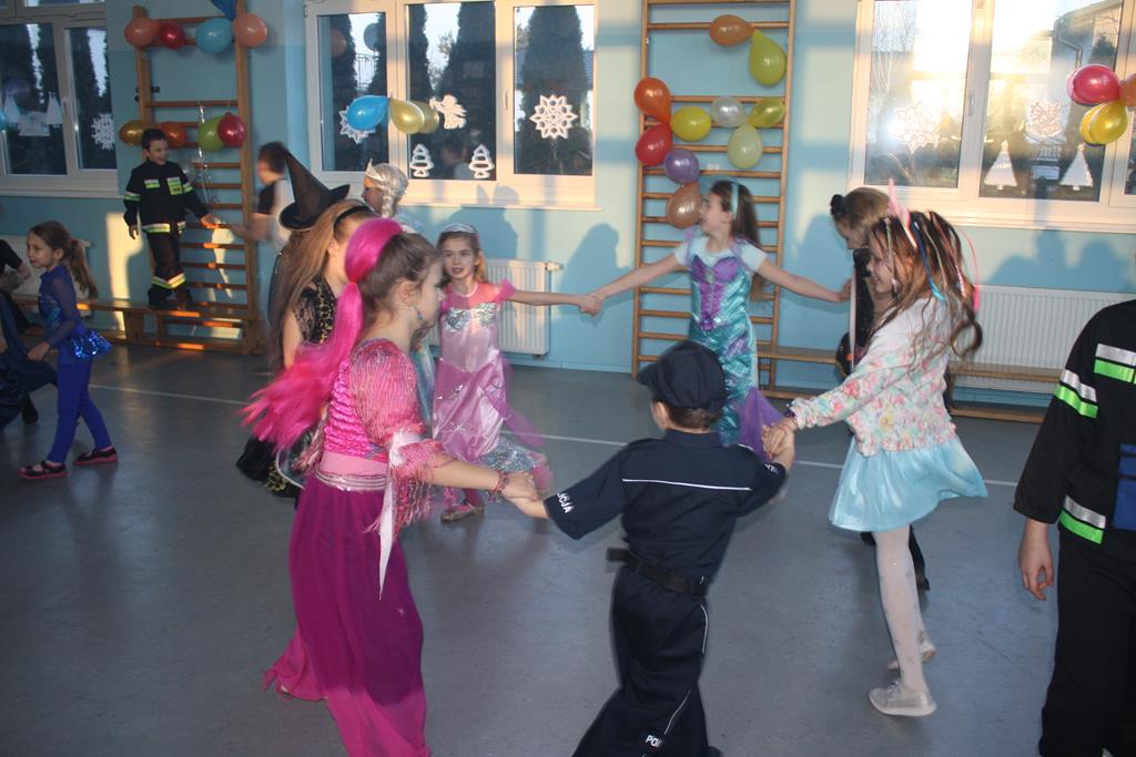 W kolorowej scenerii zabawę karnawałową poprowadził DJ Michał Kuminkiewicz – grając największe hity, przy których bawili się uczniowie, rodzice i nauczyciele. Dodatkową atrakcją były konkursy, które dostarczyły dzieciom mnóstwa radości. Można było również kupić losy w loterii fantowej i wygrać ciekawy gadżet, a także skorzystać z zakupów w sklepiku szkolnym przygotowanym specjalnie na tę okazję przez Samorząd Uczniowski. Na naszym balu nie zabrakło księżniczek, czarownic, piratów, policjantów, bohaterów bajek i filmów, a nawet panny młodej – uczniowie nie zawiedli w swej pomysłowości na przebranie karnawałowe. Tańce przy muzyce przerywał krótki odpoczynek na poczęstunek w salach lekcyjnych, który został zorganizowany przez Radę Rodziców.